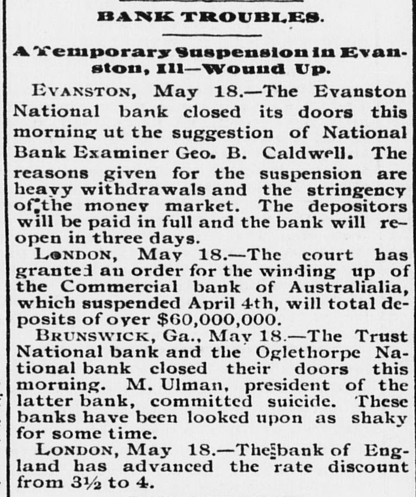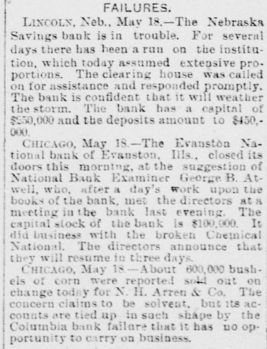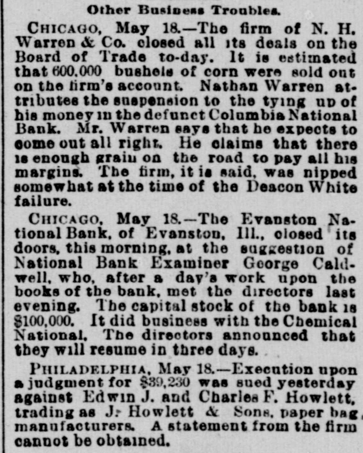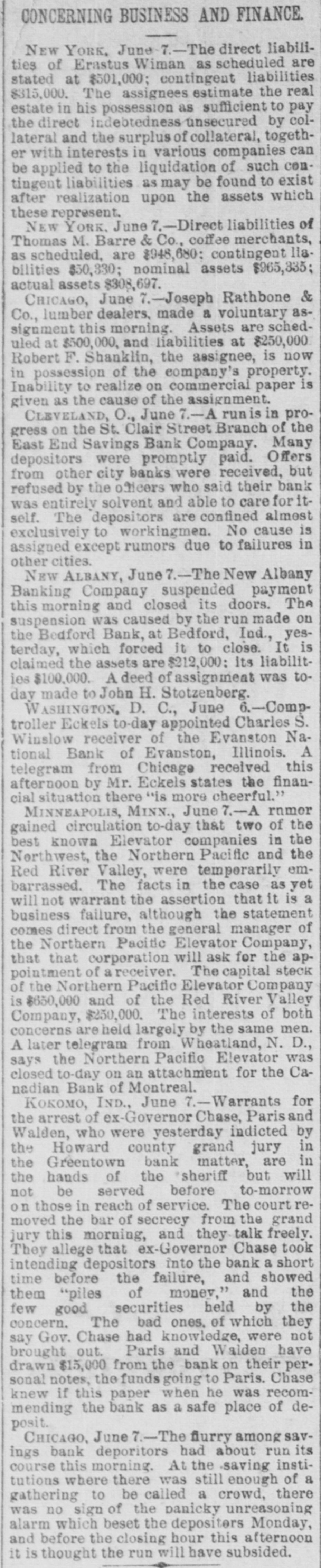 CONCERNING BUSINESS AND FINANCE. NEW YORK, June 7.-The direct liabilities of Erastus Wiman as scheduled are stated at $501,000; contingent liabilities $315,000. The assignees estimate the real estate in his possession as sufficient to pay the direct indebtedness unsecured by collateral and the surplus of collateral, together with interests in various companies can be applied to the liquidation of such contingent liabilities as may be found to exist after realization upon the assets which these represent. NEW YORK, June 7.-Direct liabilities of Thomas M. Barre & Co., coffee merchants, as scheduled, are $948,680: contingent llabilities $30,330; nominal assets $965,335; actual assets $308,697. CHICAGO, June .-Joseph Rathbone & Co., lumber dealers, made a voluntary assignment this morning. Assets are scheduled at $500,000, and liabilities at $250,000 Robert F. Shanklin, the assignee, is now in possession of the company's property. Inability to realize on commercial paper is given as the cause of the assignment. CLEVELAND, O., June 7.-A runis in progress on the St. Clair Street Branch of the East End Savings Bank Company. Many depositors were promptly paid. Offers from other city banks were received, but refused by the oficers who said their bank was entirely solvent and able to care for itself. The depositors are confined almost exclusively to workingmen. No cause is assigned except rumors due to failures in other cities. NEW ALBANY, June 7.-The New Albany Banking Company suspended payment this morning and closed its doors. The suspension was caused by the run made on the Bedford Bank, at Bedford, Ind., yesterday, which forced it to close. It is claimed the assets are $212,000: its liabilities $100,000. A deed of assignment was today made to John H. Stotzenberg. WASHINGTON, D. C., June 6.-Comptroller Eckels to day appointed Charles S. Winslow receiver of the Evanston National Bank of Evanston, Illinois. A telegram from Chicago received this afternoon by Mr. Eckels states the financialsituation there "is more cheerful.' MINNEAPOLIS, MINN., June 7.-A rnmor gained circulation to-day that two of the best known Elevator companies in the Northwest, the Northern Pacific and the Red River Valley, were temporarily embarrassed. The facts in the case as yet will not warrant the assertion that it is a business failure, although the statement comes direct from the general manager of the Northern Pacitic Elevator Company, that that corporation will ask for the appointment of a receiver. The capital stock of the Northern Pacific Elevator Company is $650,000 and of the Red River Valley Company, $250,000. The interests of both concerns are held largely by the same men. A later telegram from Wheatland, N. D., says the Northern Pacific Elevator was closed to-day on an attachment for the Canadian Bank of Montreal. KOKOMO, IND., June 7.-Warrants for the arrest of ex-Governor Chase, Paris and Walden, who were yesterday indicted by the Howard county grand jury in the Greentown bank matter, are in the hands of the sheriff but will not be served before to-morrow on those in reach of service. The courtremoved the bar of secrecy from the grand jury this morning, and they talk freely. They allege that -Governor Chase took intending depositors into the bank a short time before the failure, and showed them "piles of monev," and the few good securities held by the concern. The bad ones. of which they say Gov. Chase had knowledge, were not brought out. Paris and Walden have drawn $15,000 from the bank on their personal notes, the funds going to Paris. Chase knew if this paper when he was recommending the bank as a safe place of deposit. CHICAGO, June -The flurry among savings bank deporitors had about run its course this morning. At the saving institutions where there was still enough of a gathering to be called a crowd, there was no sign of the panicky unreasoning alarm which beset the depositors Monday, and before the closing hour this afternoon it is thought the run will have subsided.