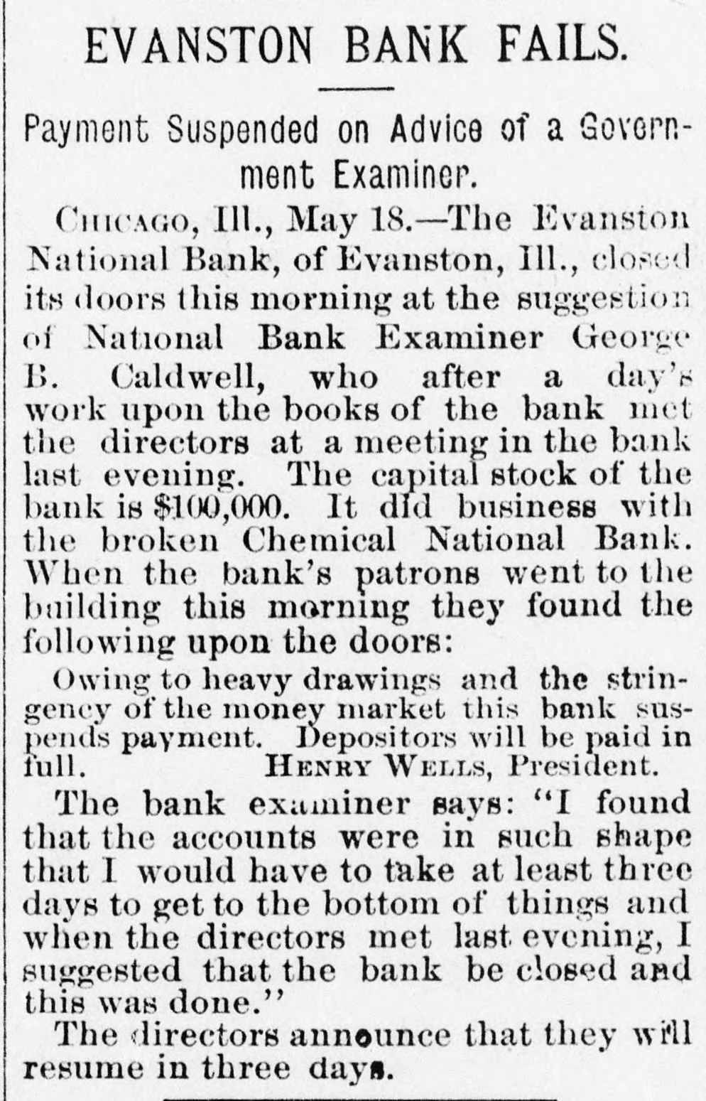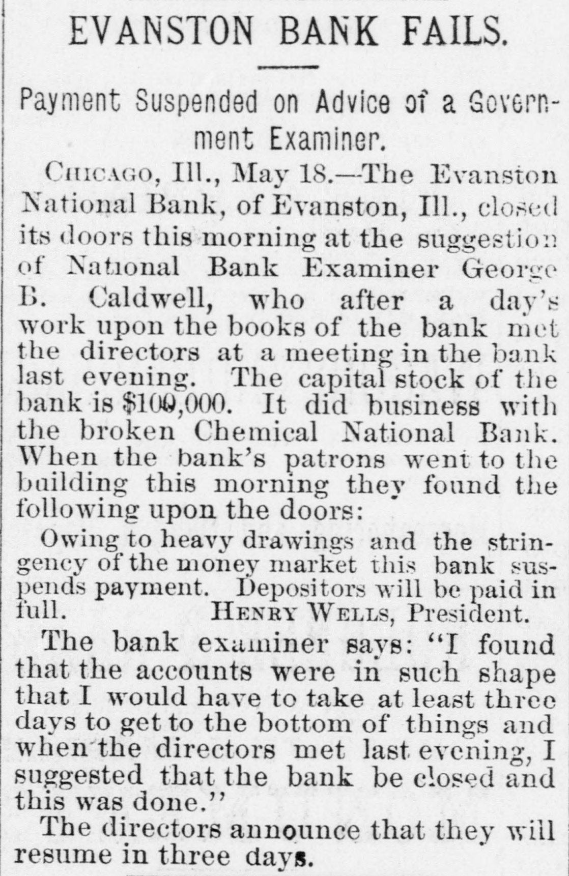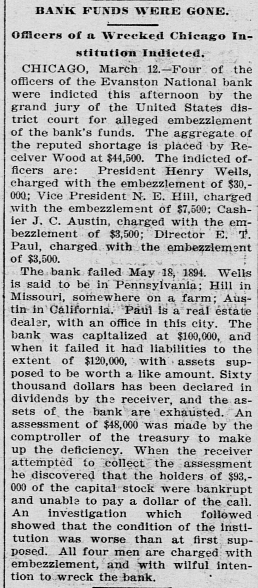 CONCERNING BUSINESS AND FINANCE. NEW YORK, June 7.-The direct liabilities of Erastus Wiman as scheduled are stated at $501,000; contingent liabilities $315,000. The assignees estimate the real estate in his possession as sufficient to pay the direct indebtedness unsecured by collateral and the surplus of collateral, together with interests in various companies can be applied to the liquidation of such contingent liabilities as may be found to exist after realization upon the assets which these represent. NEW YORK, June 7.-Direct liabilities of Thomas M. Barre & Co., coffee merchants, as scheduled, are $948,680: contingent llabilities $30,330; nominal assets $965,335; actual assets $308,697. CHICAGO, June .-Joseph Rathbone & Co., lumber dealers, made a voluntary assignment this morning. Assets are scheduled at $500,000, and liabilities at $250,000 Robert F. Shanklin, the assignee, is now in possession of the company's property. Inability to realize on commercial paper is given as the cause of the assignment. CLEVELAND, O., June 7.-A runis in progress on the St. Clair Street Branch of the East End Savings Bank Company. Many depositors were promptly paid. Offers from other city banks were received, but refused by the oficers who said their bank was entirely solvent and able to care for itself. The depositors are confined almost exclusively to workingmen. No cause is assigned except rumors due to failures in other cities. NEW ALBANY, June 7.-The New Albany Banking Company suspended payment this morning and closed its doors. The suspension was caused by the run made on the Bedford Bank, at Bedford, Ind., yesterday, which forced it to close. It is claimed the assets are $212,000: its liabilities $100,000. A deed of assignment was today made to John H. Stotzenberg. WASHINGTON, D. C., June 6.-Comptroller Eckels to day appointed Charles S. Winslow receiver of the Evanston National Bank of Evanston, Illinois. A telegram from Chicago received this afternoon by Mr. Eckels states the financialsituation there "is more cheerful.' MINNEAPOLIS, MINN., June 7.-A rnmor gained circulation to-day that two of the best known Elevator companies in the Northwest, the Northern Pacific and the Red River Valley, were temporarily embarrassed. The facts in the case as yet will not warrant the assertion that it is a business failure, although the statement comes direct from the general manager of the Northern Pacitic Elevator Company, that that corporation will ask for the appointment of a receiver. The capital stock of the Northern Pacific Elevator Company is $650,000 and of the Red River Valley Company, $250,000. The interests of both concerns are held largely by the same men. A later telegram from Wheatland, N. D., says the Northern Pacific Elevator was closed to-day on an attachment for the Canadian Bank of Montreal. KOKOMO, IND., June 7.-Warrants for the arrest of ex-Governor Chase, Paris and Walden, who were yesterday indicted by the Howard county grand jury in the Greentown bank matter, are in the hands of the sheriff but will not be served before to-morrow on those in reach of service. The courtremoved the bar of secrecy from the grand jury this morning, and they talk freely. They allege that -Governor Chase took intending depositors into the bank a short time before the failure, and showed them "piles of monev," and the few good securities held by the concern. The bad ones. of which they say Gov. Chase had knowledge, were not brought out. Paris and Walden have drawn $15,000 from the bank on their personal notes, the funds going to Paris. Chase knew if this paper when he was recommending the bank as a safe place of deposit. CHICAGO, June -The flurry among savings bank deporitors had about run its course this morning. At the saving institutions where there was still enough of a gathering to be called a crowd, there was no sign of the panicky unreasoning alarm which beset the depositors Monday, and before the closing hour this afternoon it is thought the run will have subsided.