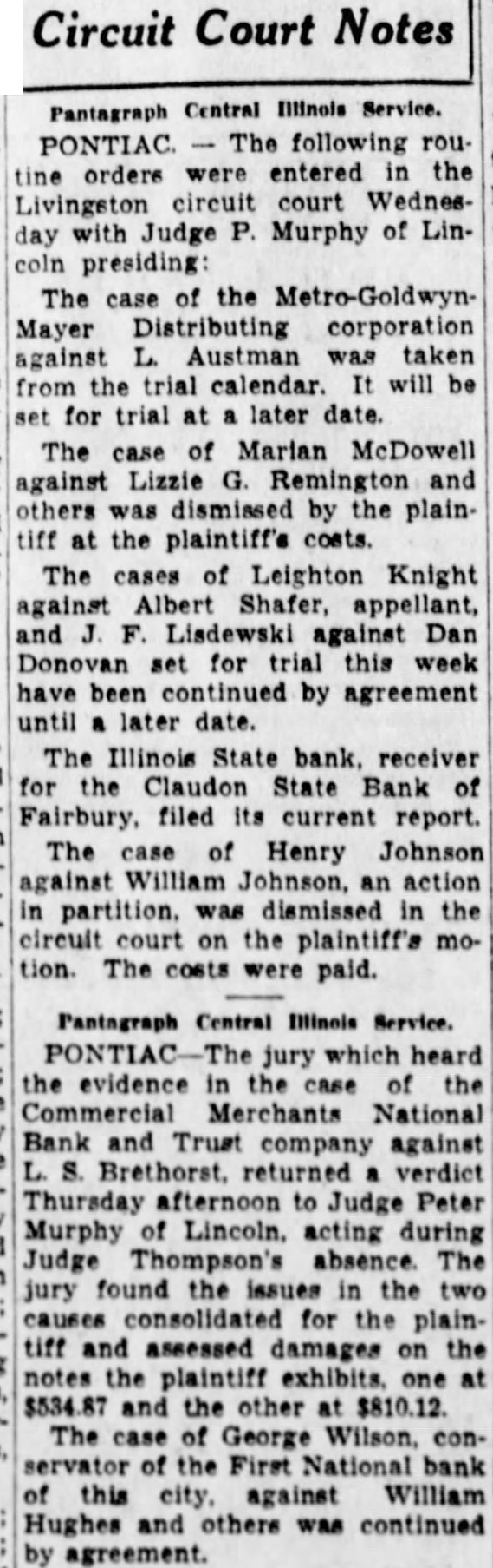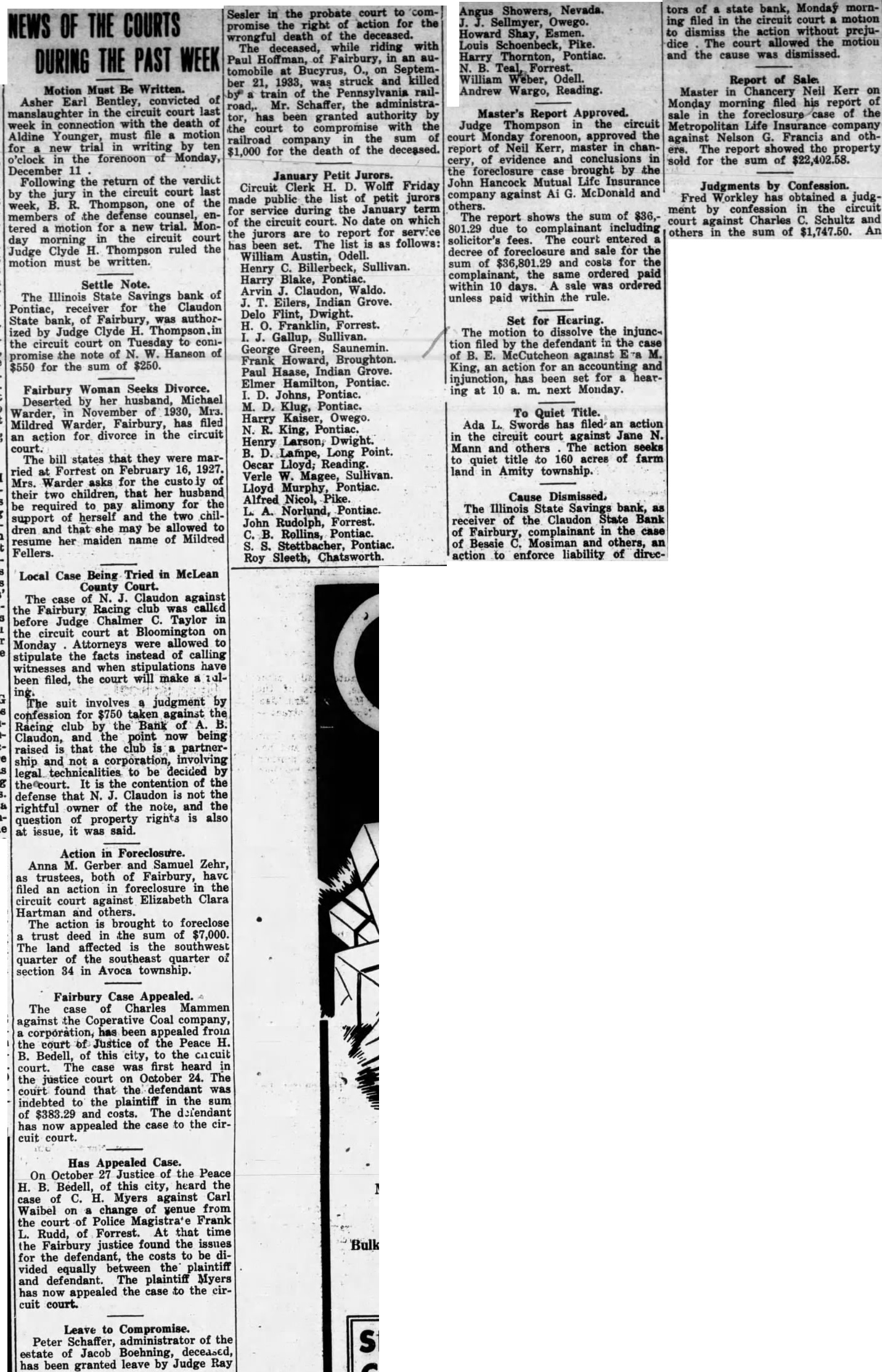 NEWS OF THE COURTS THE PAST WEEK DURING Motion Must Be Written. of Asher Earl Bentley, convicted manslaughter in the circuit court last week in connection with the death of Aldine Younger, must file a motion for new trial in writing by ten o'clock in the forenoon of Monday, December 11 Following the return of the verdict by the jury in the circuit court last week, B. R. Thompson, one of the members of the defense counsel, entered a motion for a new trial. Monday morning in the circuit court Judge Clyde H. Thompson ruled the motion must be written. Settle Note. The Illinois State Savings bank of Pontiac, receiver for the Claudon State bank, of Fairbury, was authorized by Judge Clyde H. Thompson in the circuit court on Tuesday to compromise the note of N. W. Hanson of $550 for the sum of $250. Fairbury Woman Seeks Divorce. Deserted by her husband, Michael Warder, in November of 1930, Mrs. Mildred Warder, Fairbury, has filed an action for divorce in the circuit court. The bill states that they were married at Forrest on February 16, 1927. Mrs. Warder asks for the custo of their two children, that her husband be required to pay alimony for the support of herself and the two children and that she may be allowed to resume her maiden name of Mildred Fellers. Local Case Being Tried in McLean County Court. The case of N. J. Claudon against the Fairbury Racing club was called before Judge Chalmer C. Taylor in the circuit court at Bloomington on Monday Attorneys were allowed to stipulate the facts instead of calling witnesses and when stipulations have been filed, the court will make a 101ing. The suit involves a judgment by confession for $750 taken against the Racing club by the Bank of B. Claudon, and the point now being raised is that the club is a partnership and not a corporation, involving legal to be decided by the court. It is the contention of the defense that N. J. Claudon is not the rightful owner of the note, and the question of property rights is also at issue, it was said. Action in Foreclosure. Anna M. Gerber and Samuel Zehr, as trustees, both of Fairbury, havc filed an action in foreclosure in the circuit court against Elizabeth Clara Hartman and others. The action is brought to foreclose trust deed in the sum of $7,000. The land affected is the southwest quarter of the southeast quarter of section 34 in Avoca township. Fairbury Case Appealed. The case of Charles Mammen against the Coperative Coal company, corporation, has been appealed from the court of Justice of the Peace H. B. Bedell, of this city, to the cacuit court. The case was first heard in the justice court on October 24. The court found that the defendant was indebted to the plaintiff in the sum of $383. and costs. The defendant has now appealed the case to the circuit court. Has Appealed Case. On October 27 Justice of the Peace H. B. Bedell, of this city, heard the case of C. H. Myers against Carl Waibel on a change of yenue from the court of Police Magistra'e Frank L. Rudd, of Forrest. At that time the Fairbury justice found the issues for the defendant, the costs to be divided equally between the plaintiff and defendant. The plaintiff Myers has now appealed the case to the circuit court. Leave to Compromise. Peter Schaffer, administrator of the estate of Jacob Boehning, deceased, has been granted leave by Judge Ray Sesler in the probate court to compromise the right of action for the wrongful death of the deceased. The deceased, while riding with Paul Hoffman, of Fairbury, in an automobile at Bucyrus, 0., on September 21, 1933, was struck and killed by train of the Pennsylvania railroad,. Mr. Schaffer, the administrator, has been granted authority by the court to compromise with the railroad company in the sum of $1,000 for the death of the deceased. January Petit Jurors. Circuit Clerk H. D. Wolff Friday made public the list of petit jurors for service during the January term of the circuit court. No date on which the jurors are to report for service has been set. The list is as follows: William Austin, Odell. Henry C. Billerbeck, Sullivan. Harry Blake, Pontiac. Arvin J. Claudon, Waldo. J. T. Eilers, Indian Grove. Delo Flint, Dwight. H. O. Franklin, Forrest. J. Gallup, Sullivan. George Green, Saunemin. Frank Howard, Broughton. Paul Haase, Indian Grove. Elmer Hamilton, Pontiac. D. Johns, Pontiac. M. D. Klug, Pontiac. Harry Kaiser, Owego. N. R. King, Pontiac. Henry Larson, Dwight. B. D. Lampe, Long Point. Oscar Lloyd; Reading. Verle W. Magee, Sullivan. Lloyd Murphy, Pontiac. Alfred Nicol, Pike. L. A. Norlund, Pontiac. John Rudolph, Forrest. C. B. Rollins, Pontiac. S. S. Stettbacher, Pontiac. Roy Sleeth, Chatsworth. Angus Showers, Nevada. Sellmyer, Owego. Howard Shay, Esmen. Louis Schoenbeck, Pike. Harry Thornton, Pontiac. N. B. Teal, Forrest. William Weber, Odell. Andrew Wargo, Reading. Master's Report Approved. Judge Thompson in the circuit court Monday forenoon, approved the report of Neil Kerr, master in chancery, of evidence and conclusions in the foreclosure case brought by the John Hancock Mutual Life Insurance company against Ai G. McDonald and others. The report shows the sum of $36,801.29 due to complainant including solicitor's fees. The court entered decree of foreclosure and sale for the sum of $36,801.2 and costs for the complainant, the same ordered paid within 10 days. A sale was ordered unless paid within the rule. Set for Hearing. The motion to dissolve the injunction filed by the defendant in the case of B. E. McCutcheon against M. King, an action for an accounting and injunction, has been set for hearing at 10 a. m. next Monday. To Quiet Title. Ada L. Swords has filed- an action in the circuit court against Jane N. Mann and others The action seeks to quiet title to 160 acres of farm land in Amity township. Cause Dismissed, The Illinois State Savings bank, as receiver of the Claudon State Bank of Fairbury, complainant in the case of Bessie Mosiman and others, an action to enforce liability of direc- t