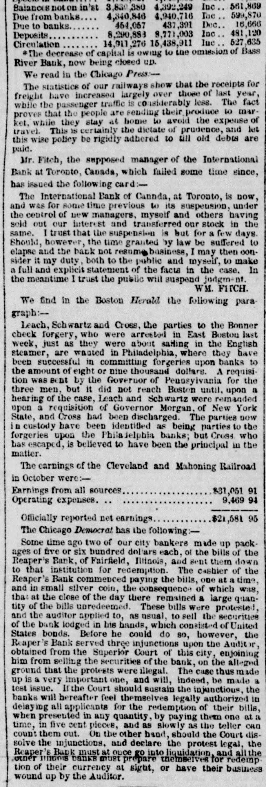 Balances not on in'st 3,830,380 4,392,249 Inc.. 561,869 Due from banks.... 4,840,846 4,940,716 Гос.. 599,870 Due to banks. 454,057 437,391 Dec.. 16,666 Deposits... 8,290,883 8,771,003 Inc.. 481,120 Circulation 14,911,276 15,438,911 luc.. 527,635 *The decrease of capital is owing to ine omission of Bass River Bank, now being closed up. We read in the Chicago Press:- The statistics of our railways show that the receipts for freight have increased largely over those of last year, while the passenger traffic is considerably less. The fact proves that the people are sending their produce to market, while they stay at home to avoid the expense of travel. This is certainly the dictate of prudence, and let this wise policy be rigidly adhered to till old debts are paid. Mr. Fitch, the supposed manager of the International Bank at Toronto, Canada, which failed some time since, has issued the following card:- The International Bank of Cannda, at Toronto, is now, and was for some time previous to its suspension, under the control of new managers, myself and others having sold out our interest and transferred our stock in the same. I trust that the suspension is but for a few days. Should, however, the time granted by law be suffered to elapse and the bank not resume business, I may then consider it my duty, both to the public and myself, to make a full and explicit statement of the facts in the case. In the meantime I trust the public will suspend judgment. WM. FHCH. We find in the Boston Herald the following paragraph:- Leach, Schwartz and Cross, the parties to the Bonner check forgery, who were arrested in East Boston last week, just as they were about sailing in the English steamer, are wanted in Philadelphia, where they have been successful in committing forgeries upon banks to the amount of eight or nine thousand dollars. A requisition was sent by the Governor of Pennsylvania for the three men, but it did not reach Boston until, upon a hearing of the case, Leach and Schwartz were remanded upon a requisition of Governor Morgan, of New York State, and Cross had been discharged. The parties now in custody have been identified as being parties to the forgeries upon the Philadelphia banks; but Cross who has escaped, is believed to have been the principal in the matter. The earnings of the Cleveland and Mahoning Railroad in October were:- Earnings from all sources. $31,051 91 Operating expenses. 9,469 94 Officially reported net earnings.. $21,581 95 The Chicago Democrat has the following:- Some time ago two of our city bankers made up packages of five or six hundred dollars each, of the bills of the Reaper's Bank, of Fairfield, Illinois, and sent them down to that institution for redemption. The cashier of the Reaper's Bank commenced paying the bills, one at a time, and in small silver coin, the consequence of which was, that at the close of the day there remained a large quantity of the bills unredeemed. These bills were protested, and the auditor applied to, as usual, to sell the securities of the bank lodged in his hands, which consisted of United States bonds. Before he could do so, however, the Reaper's Bank served three injunctions upon the Auditor, obtained from the Superior Court of this city, enjoining him from selling the securities of the bank, on the alleged ground that the protests were illegal. The case thus made up is a very important one, and will, indeed, be made a test issue. If the Court should sustain the injunctions, the banks will hereafter feel themselves legally authorized in delaying all applicants for the redemption of their bills, when presented in any quantity, by paying them one at a time, in five cent pieces, and as slowly as the teller can count them out. On the other hand, should the Court dissolve the injunctions, and declare the protest legal, the Reaper's Bank must at once go into liquidation, and all the other minor banks must prepare themselves for redemption of their currency at sight, or have their business wound up by the Auditor.