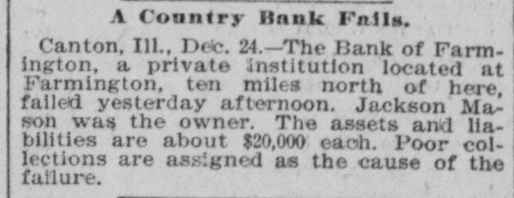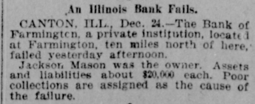 An Illinois Bank Fails. CANTON, ILL., Dec. 24.-The Bank of Farmington, a private institution, located at Farmington, ten miles north of here, failed yesterday afternoon. Jackson Mason was the owner. Assets and liabilities about $20,000 each. Poor collections are assigned as the cause of the failure.