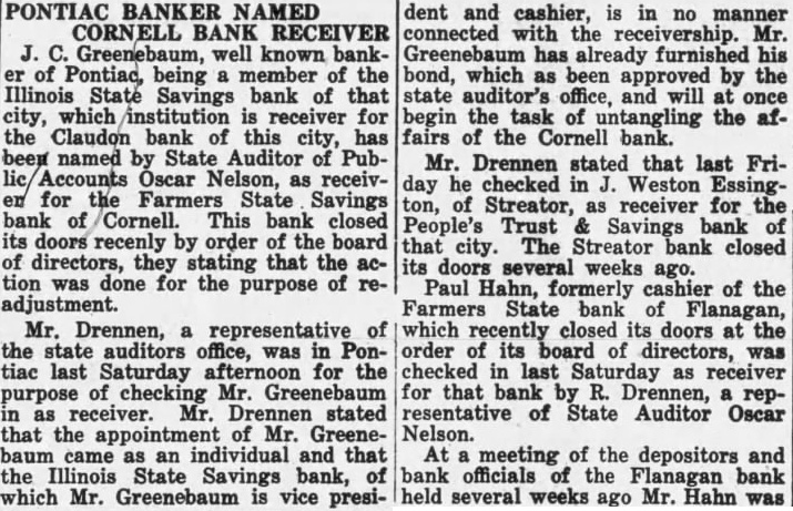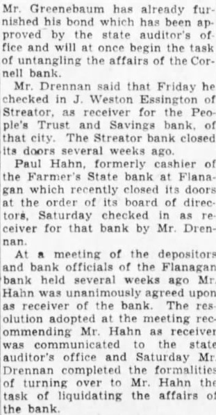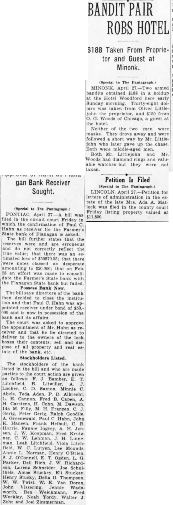 Petition Filed gan Bank Receiver (Special The Pantagraph.) Sought. LINCOLN. April for letters administration in the tate of the late Mrs. Ada Matlock filed in the county court (Special to The Pantagraph.) Friday listing property valued PONTIAC, April bill was $11,800. filed in the circuit court Friday which the confirmation Paul Hahn as for the Farmer's State bank Flanagan asked. The bill further states that the reserves were and erroneous and do correctly reflect the true value; that there was an timated loss that there were classed as desperate amounting to $20,000: that on Feb. an effort was made consolidate the Farmer's State bank with the Flanagan State bank but failed. Possess Bank Now. The bill says directors of the bank then decided close the institution and that Paul Hahn was pointed receiver under bond of 000 and now in possession of the bank and its affairs The court was asked to approve the appointment Mr. Hahn as receiver and that he be directed to deliver to the owners of the lock boxes their contents; sell and dispose all property and real estate of the bank. Stockholders Listed. The stockholders of the bank listed the bill and who are made parties the action given follows: Bamber, R. Locker. C. D. Saxton. Minnie Abels, Teda Aden, Albrecht, Cannon. Fred B. Capen, A Carstens, H. Cohn. M Gerig. Peter Gerig. Ralph Goodile, Greenewald Paul Hahn. John Hansen. Frank Heibult, Horrie, Ingrey. H Jensen, Koopman, Fred Krutzner. W Linneman. Leah Litchfield, Viola LitchW. Lee Mounds, Annie Norman, Henry O'Brien, Parker, Dell Rich. Richardson, Lorenz Schneider Joe Schultheis, Amos Stuckey, EH Stuckey, Henry Stucky, Della Thompson, W. Twist. W. E. Van Doren, John Vissering, Jennie Wadsworth. Ben Fred Workley, Noah Yordy, Walter Zehr and Joel Zimmerman.