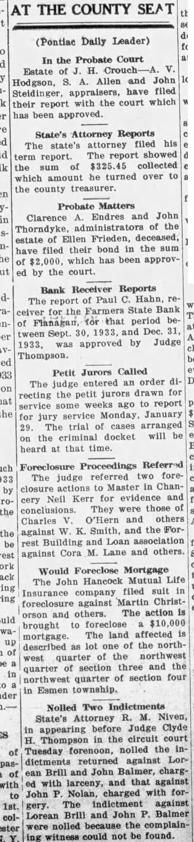 AT THE COUNTY (Pontiac Daily Leader) In the Probate Court Estate of H. Allen and John Hodgson, have filed Steidinger, appraisers, with the court which their report has been approved. State's Attorney Reports The state's attorney filed his The report showed term report. $325.45 collected the sum of which amount he turned over to the county treasurer. Probate Matters Endres and John Clarence Thorndyke, administrators of the estate of Ellen Frieden, deceased, their bond in the sum have filed which has been approvof ed by the court. Bank Receiver Reports The report of Paul Hahn, ceiver the Farmers State Bank of Flanagan, that period between Sept. 30, 1933, and Dec. 31, approved by Judge 1933, was Thompson. Petit Jurors Called The judge entered an order directing the petit jurors drawn for service some weeks ago to report for jury service Monday, January 29. The trial of cases arranged on the criminal docket will be heard at that time. Foreclosure Proceedings Referred The judge referred two foreclosure actions to Master in ChanKerr for evidence and Neil those of conclusions. They were V. O'Hern and others Charles against W. K. Smith, and the ForBuilding and Loan association Cora M. Lane and others. against Would Foreclose Mortgage The John Hancock Mutual Life filed suit in Insurance company foreclosure against Martin ChristThe action is orson and others. foreclose $10,000 brought to The land affected is mortgage. described as lot one of the northwest quarter of the northwest quarter of section three and the of section four northwest quarter in Esmen township. Nolled Two Indictments Attorney R. M. Niven, State's in appearing before Judge Clyde Thompson in the circuit court Tuesday forenoon, nolled the inreturned against Lordictments Brill and John Balmer, charglarceny, and that against with John Nolan, charged with forThe indictment against gery. Brill and John P. Balmer Lorean were nolled because the complainwitness could not be found.