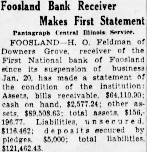 16 Per Cent Dividend to Be Paid Depositors of Foosland Bank The Receiver urges that all past dividend checks be called for. H. O. Feldman, receiver of the First National bank of Foosland, has issued the following statement: third dividend, representing 16 per cent of the depositors proven claims, has been declared and checks were distributed on Wednesday and Thursday of this week, and those who failed to call for checks on those days can receive them on any Wednesday thereafter. When calling for dividend checks, it will be necessary for depositors to present their Receivers Certificate: receipts for dividend checks will be mailed to out-of-town depositors upon re-