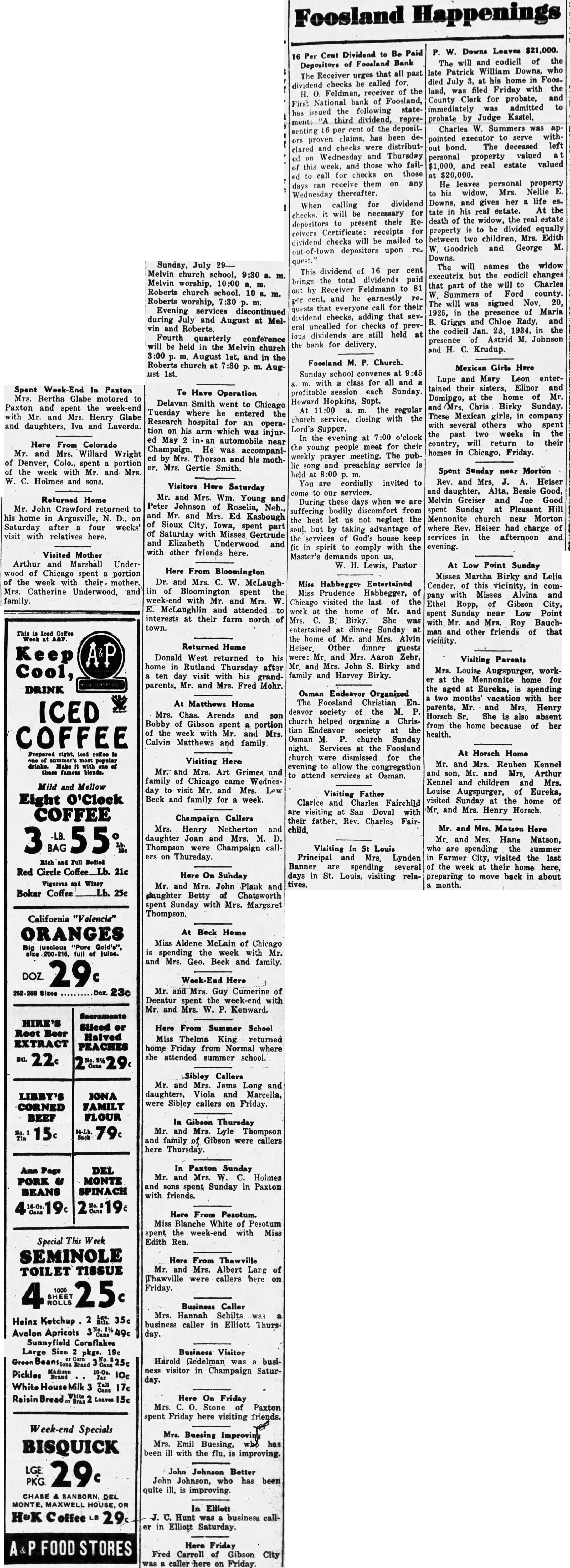 ICED Mrs. Chas. Arends and son Bobby of Gibson spent a portion of the week with Mr. and Mrs. COFFEE Calvin Matthews and family. one summer's most popular Visiting Here drinks. Make these famous blends. Mr. and Mrs. Art Grimes and family of Chicago came WednesMild and Mellow day to visit Mr. and Mrs. Lew Eight O'Clock Beck and family for week.