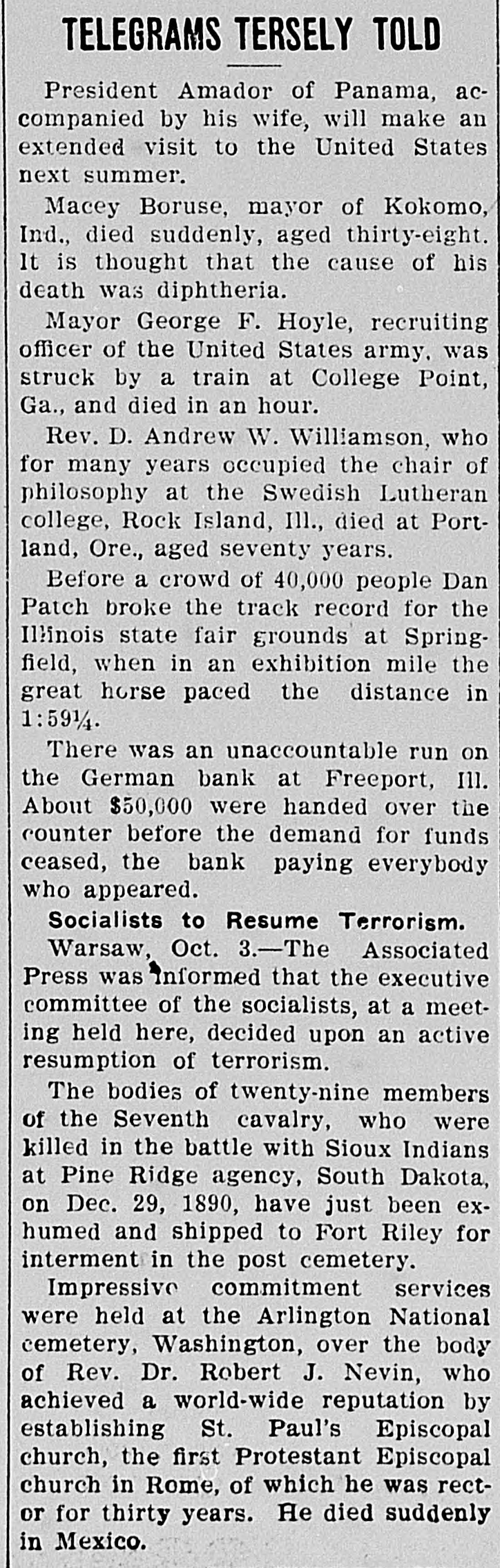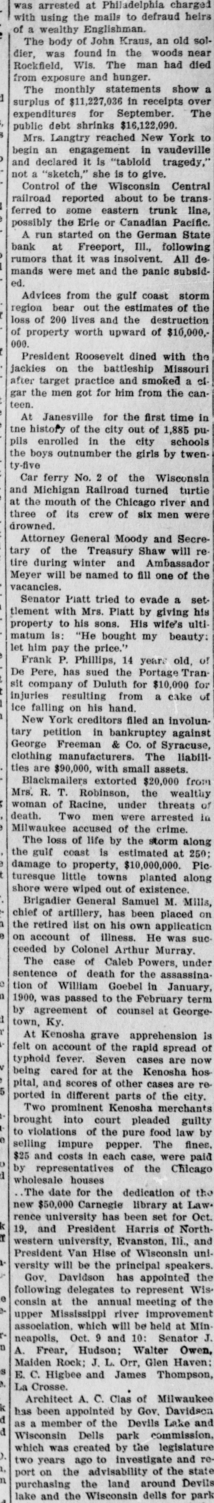 Blackmailers extorted $20,000 from Mrs. R. T. Robinson, the wealthy woman of Racine, under threats of death. Two men were arrested in Milwaukee accused of the crime.