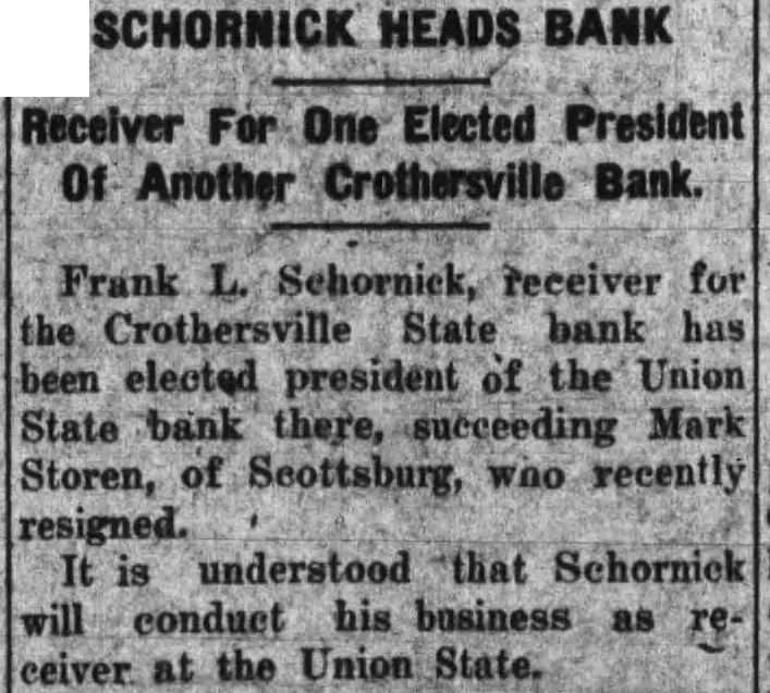The long drawn out suit by Frank Schornick, receiver, against the directors of the deffunet Crothersville State Bank for damages has been officially settled following compromise by which the defendants agreed the receiver $10,000, The case was settled Monday when called for trial in the Bartholomew circuit court at Columbus. The compromise was made legal and binding by being made matter of court record judgment for $10,000 against the defendants, of the attorneys stated today. The attorneys for the receiver greed to settlement of $10,000, understood, after they learned that the defendants became directors the bank in at time when was already insolvent. When the defendants were made directors of the institution held approximately $80,000 of uncollectible paper. Recovery against the defendants was limited to the payment of dividends after they went into office and other minor items. Court action staid for sixty days to give the defendants time arrange the details of paying the $10,000. said there is priarrangement between them as to the apportionment of the sum. The directors of the defunet bank Frank Butler, William Rider, the administratrix for the esof tafe of the Howard R. Rider, Henry Kovenor, Henry Beckman and Sylvester Applegate. The theory underlying the suit as expressed, was that the directors of the bank had been administering the negligent affairs of the bank and that this had resulted in large losses to the depositors. The suit was filed March 12, 1924, in the Jackson circuit eourt and was sent to the Bartholomew circuit court on change of venue, being set for trial Monday. The case was called before Judge Julian Sharpnack, and the compromise was reached before the jury called. Seba Barnes and Montgomery Montgomery, of this city, were attorneys for the receiver, while the defendants were represented by Shea & Hottel, of Indianapolis: Thomas M. Branaman and John Branaman, of Brownstown; Edward Elsner and Oscar Abel, this city, and Kollmeyer and dear, of Columbus. This is one of the most important cases filed in connection with the ceivership of the Crothersville State of Bank. The maze of legal actions rapidly being cleared away, looking towards final settlement of the ceivership, which started following failure of the bank September 12, 1923. The against Frank Butler, former president of the for $10,000 on personal bond, still pending. Sweet Sweet, contractors of Greencastle, also have pending against the receiver. contractors allege that posited $3,800 in the bank several before was closed, and seek days recovery upon the ground that offiof bank are liable when they cers receive deposits knowing bank is insolvent.