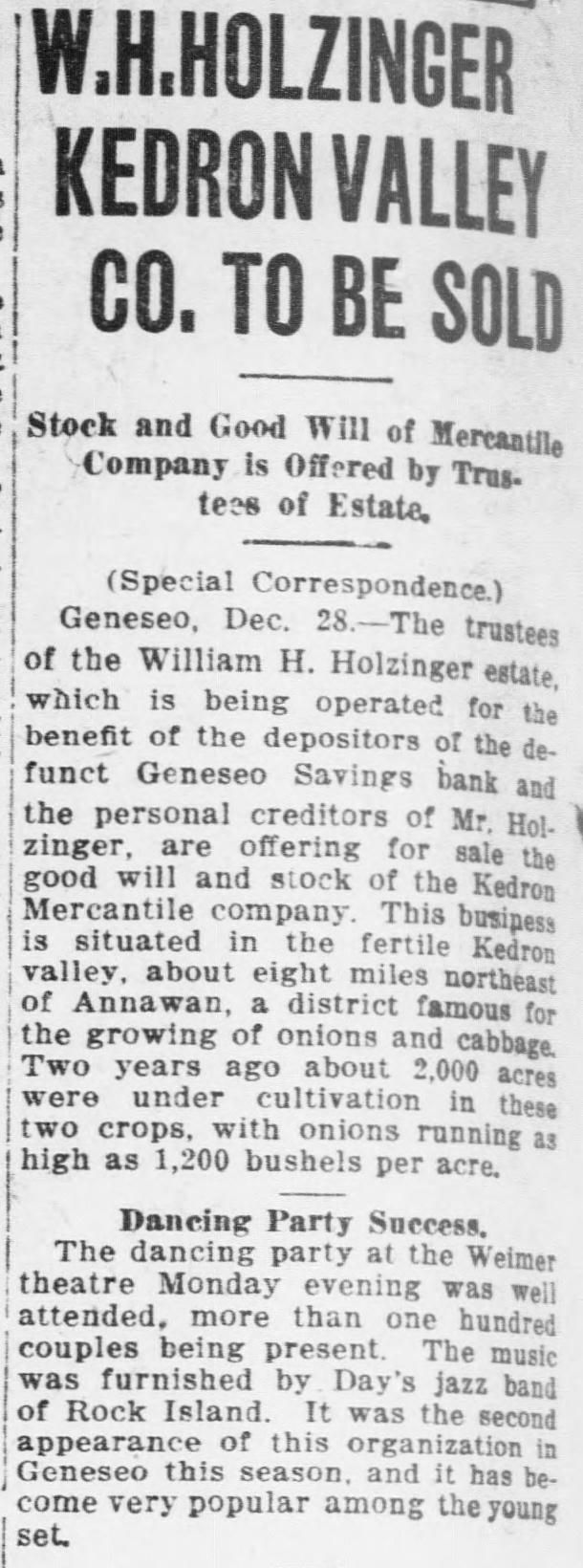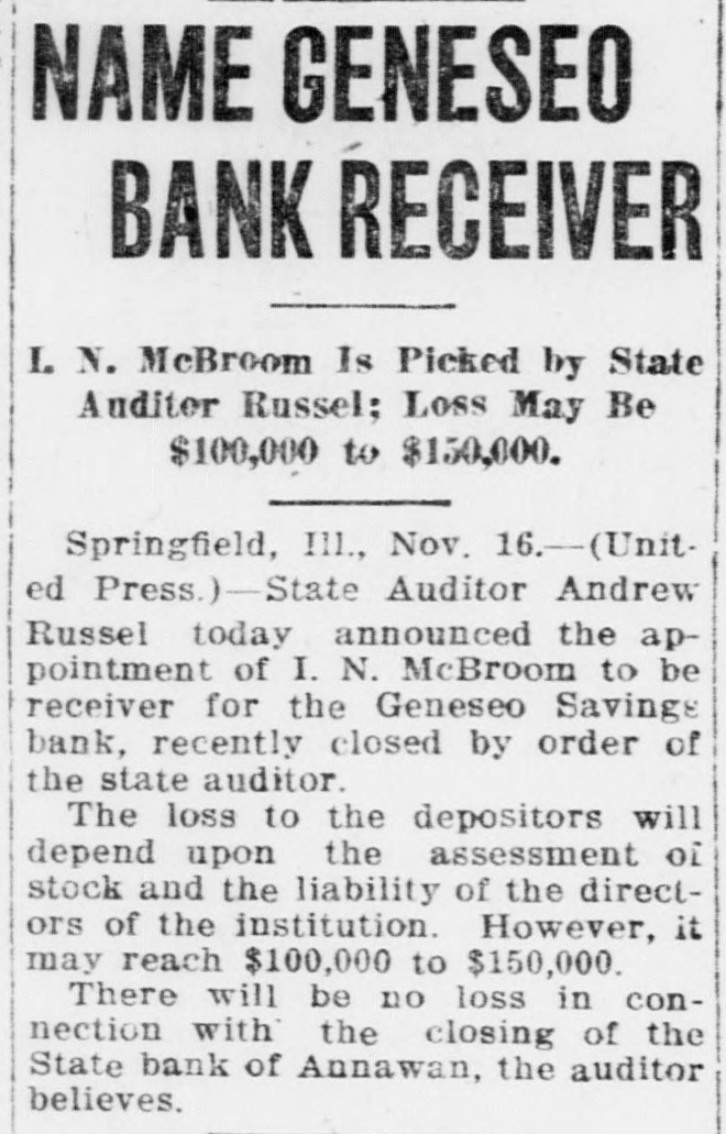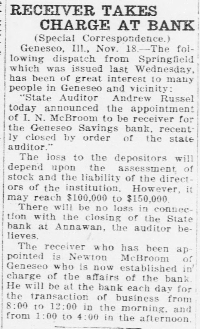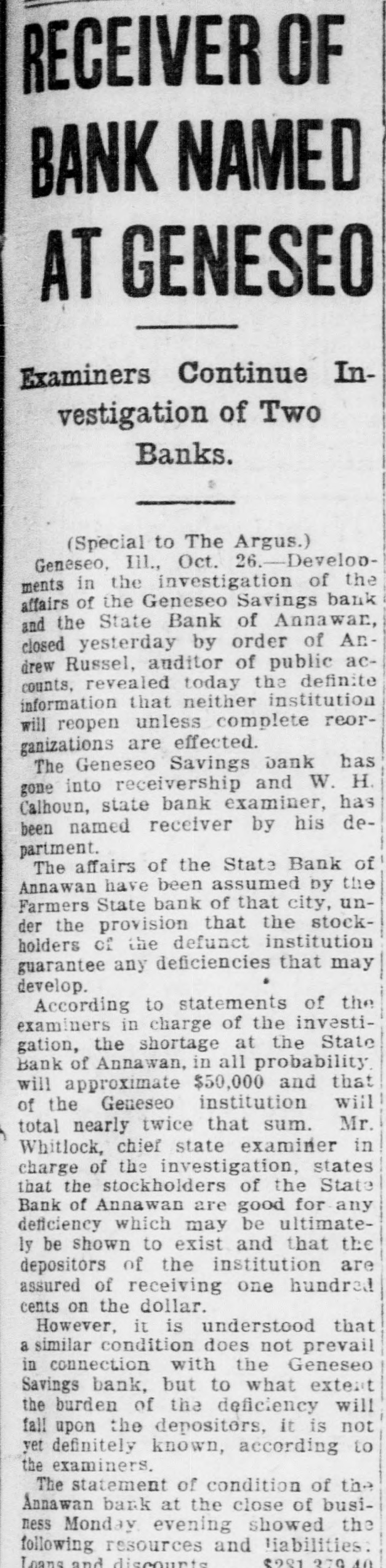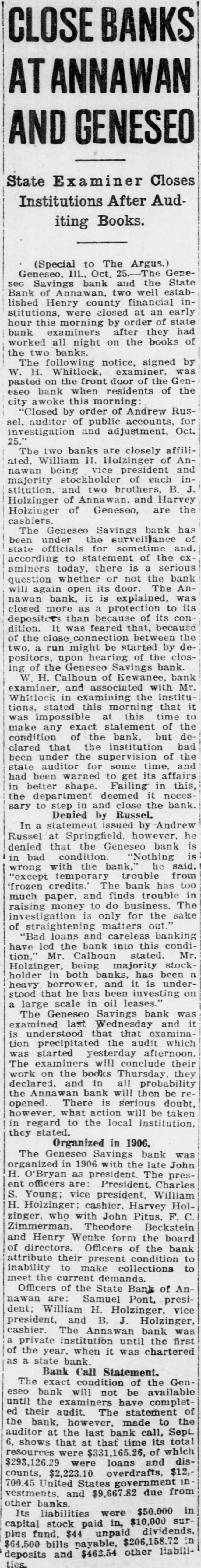CLOSE BANKS ATANNAWAN AND GENESEO State Examiner Closes Institutions After Auditing Books. to The Argus.) Ill., Oct. 25.- State Geneseo, (Special The the GeneSavings bank and estabsec of Annawan, two incounty lished Bank Henry financial well early stitutions, were closed at an state this morning by order of had bank hour examiners after they of worked all night on the books the two banks. The following notice, signed was by H. Whitlock, examiner, GenW. on the front door of the the eseo pasted bank when residents of city awoke this morning Closed by order of Andrew Rus- for auditor of public accounts, Oct. sel. investigation and adjustment, 25." The two banks are closely affili- AnWilliam H. Holzinger of ated, being vice president and innawan stockholder of each stitution, majority and two brothers, B. J. Holzinger of Annawan, and Harvey the Holzinger of Geneseo, are cashiers. Geneseo Savings bank has The under the surveillance and, of been officials for sometime exstate according to statement of the aminers today, there is a serious question whether or not the The bank Anagain open its door. was will nawan bank, it is explained, to its more as a protection than because It was feared that, the deposities dition. closed between of because its con the close connection deof run might be started by clostwo. a upon hearing of the bank. positors, ing of the Geneseo Savings H. Calhoun of Kewanee, bank examiner, W. and associated with Mr. Whitlock in examining the institu- it stated this morning that to impossible at the tions, was make any statement this time of exact decondition of the bank. but had that the institution clared under the supervision of and the been auditor for some time, state had been warned to get its affairs this, better shape. Failing in necesthe in department deemed it bank. sary to step in and close the Denied by Russel. a statement issued by Andrew he Russel In at Springfield, however, denied that the Geneseo bank is is bad condition "Nothing said, in with the bank, from temporary wrong "except trouble he has 'frozen credits. The bank too in and finds trouble The money to do sake much raising paper, business. investigation is only for the of straightening matters out.' "Bad loans and careless banking led the bank into this condi- Mr. have Mr. Calhoun stated. being a in both banks, has tion," holder Holzinger, majority been under- stock borrower, and it is on stood heavy that he has been investing a large scale in oil leases. The Geneseo Savings bank was last Wednesday and that that examined is understood audit examinaprecipitated the which tion started yesterday afternoon. will on the books The was work examiners Thursday, conclude their they declared. and in all probability the Annawan bank will then be reThere is serious doubt, however, opened. what action will be taken in regard to the local institution, they stated. Organized in 1906. The Geneseo Savings bank was in 1906 with the late John as H. organized O'Bryan president The Charles presare: President, vice president, ent S. Young; officers Harvey William HolH. Holzinger; cashier, who with John C. Theodore Zimmerman, zinger. Pitus, the Beckstein board F. and Henry Wenke form of directors. Officers of the bank attribute their present condition to to inability to make collections the current demands. of the State Anmeet Officers Bank of are: Samuel Pont, presiWilliam H. vice and B. J. nawan dent; president, Holzinger, Holzinger, cashier. The Annawan bank was institution until the first of the when it was a private year, chartered as a state bank. will The Bank exact Call condition not Statement. be of the available Gen the examiners have until eseo bank statement complet of ed their audit. The the the bank, however, made to Sept. at the last bank call, total shows that at that time which were $331,165.26 disauditor 6. resources and of its $293,126.29 were loans $12, counts, $2,223.10 overdrafts, 700.45 United States government in from vestments, and $9,667.82 due other banks. in $50.000 Its liabilities were surstock paid in, $10,000 dividends. bills payable, liabili$64,500 plus capital fund, $44 unpaid $206,158.72 in deposits and $462.54 other ties.