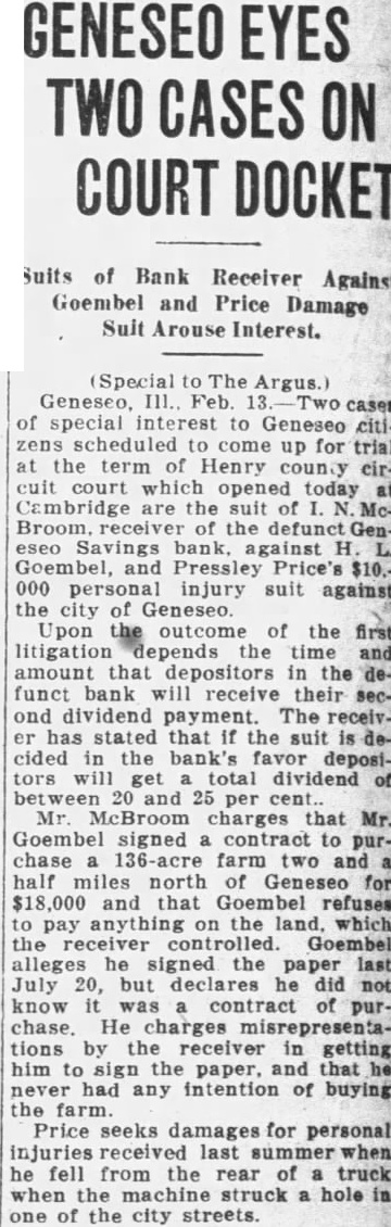 ON COURT DOCKET Suits of Bank Receiver Against Goembel and Price Damage Suit Arouse Interest. (Special to The Argus.) Geneseo, Feb. of special interest to Geneseo citizens scheduled come up for trial the term of Henry county circuit court which opened today at Cambridge the suit of Broom, receiver the eseo bank. against Goembel, and Pressley Price's $10.000 personal injury suit against the city of Upon outcome of the litigation depends the time and amount that depositors in the funct bank will receive their second dividend payment. The receivhas stated that the suit cided in the bank's favor depositors get total dividend and 25 per cent. Mr McBroom charges that Goembel signed contract to purchase farm and half miles north of Geneseo for $18,000 that Goembel refuses to pay anything which the controlled. Goembel alleges he signed the paper last July but declares did not know was a contract of chase. He charges misrepresentations by receiver getting him sign the paper, and that he never had any intention of buying the farm. Price seeks damages for personal injuries received last summer when he fell from the rear of truck when the struck hole one of the city streets.