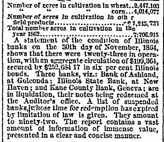 Number of acres in cultivation in whest..2,447.103 46 corn 4,014,077 Number of acres in cultivation In oth r field products $1,215,733 Total number ncres in cultivation in the year ISG2 7:706.915 A statement of the condition of Illinois banks on the 30th day of November, 1864, shows that there were twenty-three in operation, with an aggregate circulation of $199,364, secured by $252,684 17 in six per cent Illinois bonds. Three banks, viz.: Bank of Ashland, at Golconda: Illinois State Bank, at New Haven; and Kane County Bank, Geneva; are in liquidation, their notes being redeemed at the Auditor's office. A list of suspended banks/whose time for redemption has expired by limitation of law is given. They amount to ninety-two. The report contains a vast amount of information of immense value, presented in a clear and concise manner.
