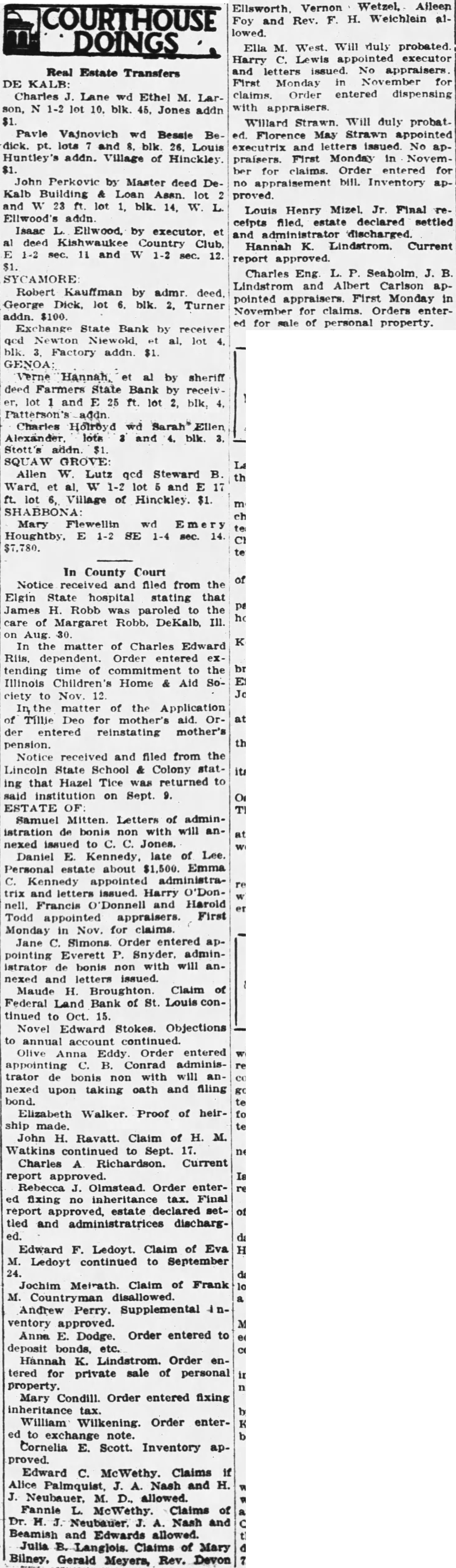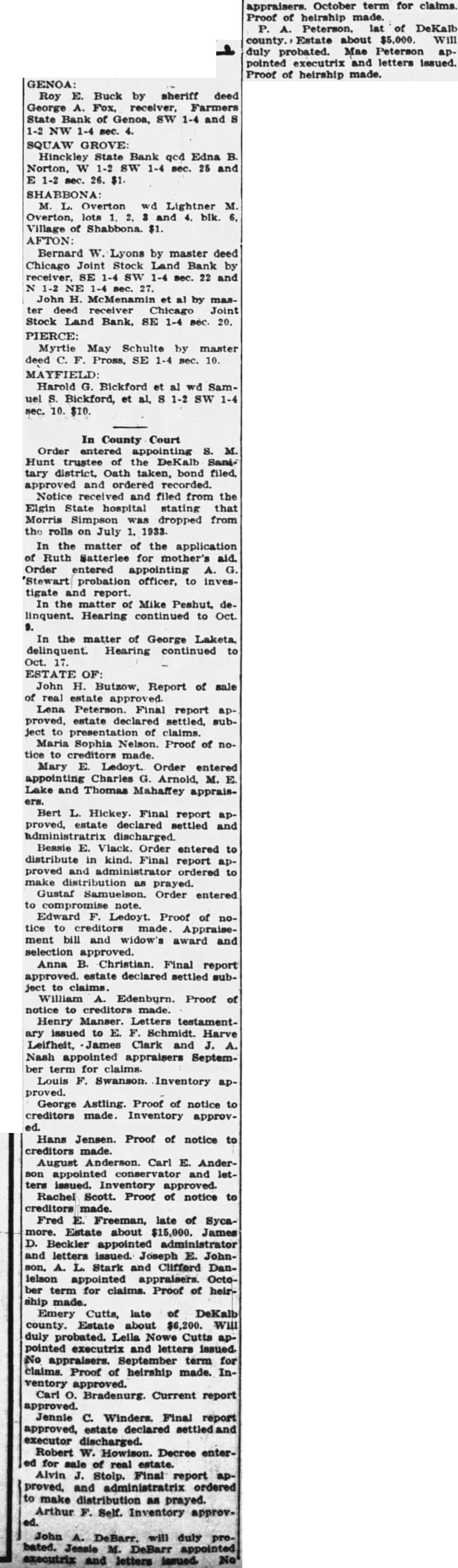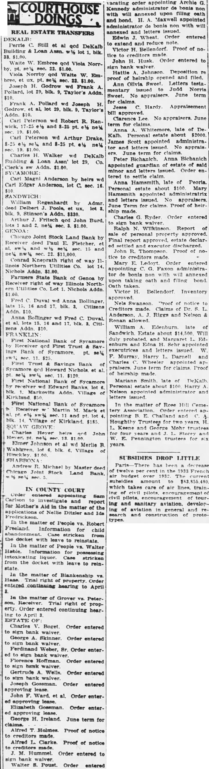 COURTHOUSE DOINGS REAL ESTATE TRANSFERS DEKALB: Perrie C. Still et al qed DeKalb Building & Loan Assn. w½ lot 1, blk. 33. $1.00. Waite W. Embree qed Viola Norrby. pt. se% sec. 22. $1.00. Viola Norrby qed Waite W. Embree, et ux. pt. se% sec. 22. $1.00. Joseph H. Godrow wd Frank A. Pollard, lot 29, blk. 9, Taylor's Addn. $10. Frank A. Pollard wd Joseph H. Godrow, et al, lot 29, blk. 9, Taylor's Addn. $10. Carl Peterson wd Robert R. Renwick, 17-25 e½ and 8-25 pt. e½ ne% sec. 19. $1.00. Carl Peterson wd Arthur Drake. 8-25 e½ sele and 8-25 pt. e½ ne% sec. 19. Charles H. Walker wd DeKalb Building & Loan Assn' lot 29, Co. Clerk's SW Addn. $1.00. SYCAMORE: Carl Magni Anderson by heirs wd Carl Edgar Anderson, lot C, sec. 16. $10 SANDWICH William Regenhardt by Admr. deed Delbert J. Poole, et ux, lot 3. blk. 9, Stinson's Addn. $330. Arthur J. Fritsch qed John Burd. to lots and 2. ne% sec. 3. $1.00 GENOA: Chicago Joint Stock Land Bank by Receiver deed Paul E. Fletcher. et al, and w½ se% sec. 15 and ne% nw% sec. 22. $11,000. Conrad Kneprath right of way IIlinois Northern Utilities Co. lot 14, Nichols Addn. $1.00. Farmers State Bank of Genoa by Receiver right of way Illinois Northern Utilities Co. Lot 1. Nichols Addn. Fred C. Duval wd Anna Bollinger, lats 15, 16 and 17. blk. 3, Citizens Addn. $10. Anna Bollinger wd Fred C. Duval. et al, lots 15, 16 and 17, blk. 3. Citizens Addn. $10. FRANKLIN First National Bank of Sycamore by Receiver ged First Trust & Savings Bank of Sycamore, pt. se% First Trust & Savings Bank of Sycamore ged Howard Nichols et al. First National Bank of Sycamore by wd Edward Banks lot 6. blk Markovitz Addn. Village of Kirkland First National Bank of Sycamore h Receiver w Martin M. Mack et blk. 14. Village of Kirkland. $185. Charles Heyer heirs and John Elmer Johnson et al wd Merlie B. Wahigren. lot 6. blk. 6. Village of Hinckley 00. SH ABBONA Andrew R. Michael by Master deed Chicago Joint Stock Land Bank. IN COUNTY COURT Order entered appointing Sam Carlson to investigate and report for Mother's Aid in the matter of the applications of Nellie Ditzler and Ida Fredrickson. In the matter of People vs. Robert Freeland. Information for child abandonment. Case stricken from the docket with leave to reinstate. In the matter of People vs. Walter Hable. Information for possessing intoxicating liquor. Case stricken from the docket with leave to reinstate. In the matter of Blankenship vs. Haas. Trial right of property. Order entered continuing hearing to April 8. In the matter of Grover vs. Peterson, Receiver. Trial right of property. Order entered continuing hearing to April ESTATE OF: Charles V. Boget. Order entered to sign bank waiver George A. Skinner. Order entered to sign bank waiver. Ferdinand Weber, Sr. Order entered to sign bank waiver. Florence Hoffman. Order entered to sign bank waiver. Gertrude A. Wells. Order entered to sign bank waiver. Joseph Gossman. Order entered approving lease. John F. Ward. et al. Order entered approving lease. Elizabeth Gossman. Order entered approving lease. George H. Ireland. June term for claims. Alfred T. Holmes Proof of notice to creditors made. Alfred L. Clarke. Proof of notice to creditors made. J. M. Hummel. Order entered to sign bank waiver Walter S. Poust. Order entered vacating order appointing Archie G. Kennedy administrator de bonis non with will annexed upon filing oath and bond. H. A. Maxwell appointed administrator de bonis non with will annexed and letters issued. Edwin J. Wheat. Order entered to extend and reduce note. Victor H. Bellendorf. Proof of notice to creditors John H. Husk. Order entered to sign bank waiver Hattle A. Johnson. Deposition re proof of heirship opened and filed. Ann Olivia Sweet. Letters testa. mentary issued to Judd Norris Sweet. No appraisers June term for claims. Jesse C. Hardy Appraisement bill approved. Clarence Lee No appraisers. June term for Anna A. Whitemore, late of DeKalb. Personal estate about $2000. James Scott appointed administrator and letters issued No appraisers. June term for claims. Peter Bichanich. Anna Bichanich appointed guardian of estate of said minor and letters issued. Order entered to settle claim Anna Hamsmith. late of Peoria. Personal estate about $100 Mary Hamsmith appointed administratrix and letters issued. No appraisers. June Term for claims. Proof of heirship made. Charles G. Ryder Order entered sign bank waiver. Ralph N. Wilkinson Report of sale of personal property approved. Final report approved. estate declared settled and executor discharged. John R. Thompson. Proof of notice to creditors made. Mary E. Ledoyt Order entered appointing C. G. Faxon administrator de bonis non with will annexed upon taking oath and filing bond. Oath taken. Victor H. Bellendorf Inventory approved. Nels Swanson. Proof of notice to Creditors made. Claims of Dr. S. L. Anderson. Riggs and Nelson & Ronan allowed William A. Edenburn. late of Sandwich Estate about $14,500. Will duly probated. and Margaret L. Fdenburn and Edna H. Sehr appointed executrices and letters issued. W F. Murray. Harry L. Darnell and Charles Wheeler appointed appraisers June term for claims Proof of heirship made Mariann Smith. late of DeKalb Personal estate about $100 Harry A. Nelson appointed administrator and letters issued. In the matter of Rose Hill Cemetery Association Order entered appointing B. E. Challand and C Houghthy Trustees for two years. H. L. Keene and George Mohr trustees for four years and Storey and W. E. Pennington trustees for six SUBSIDIES DROP LITTLE has been decrease of twelve per cent in the 1933 French air budget over 1932. The current subsidies amount to $83 855 480. which takes care of air lines, trainIng civil pilots of civil pilots, encouragement of touring and sanitary aviation. developing of aviation in general and research and construction of prototypes.