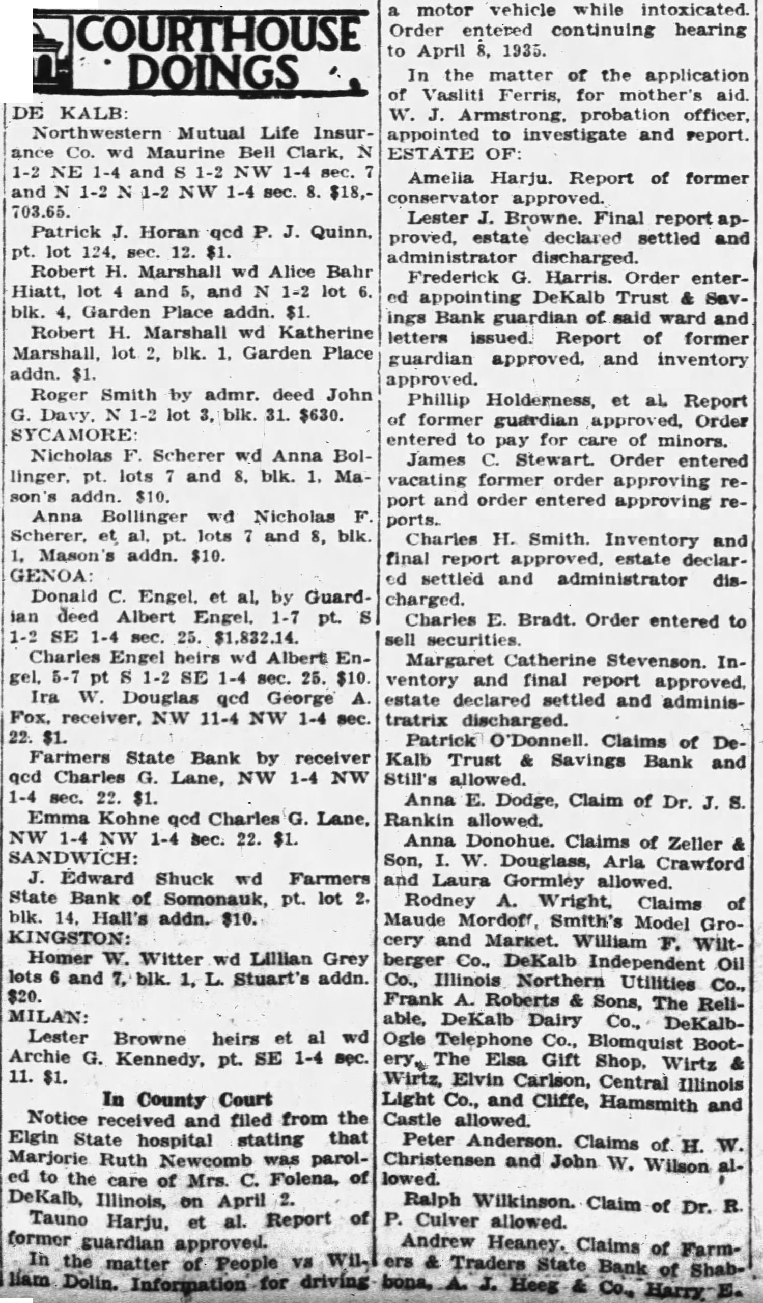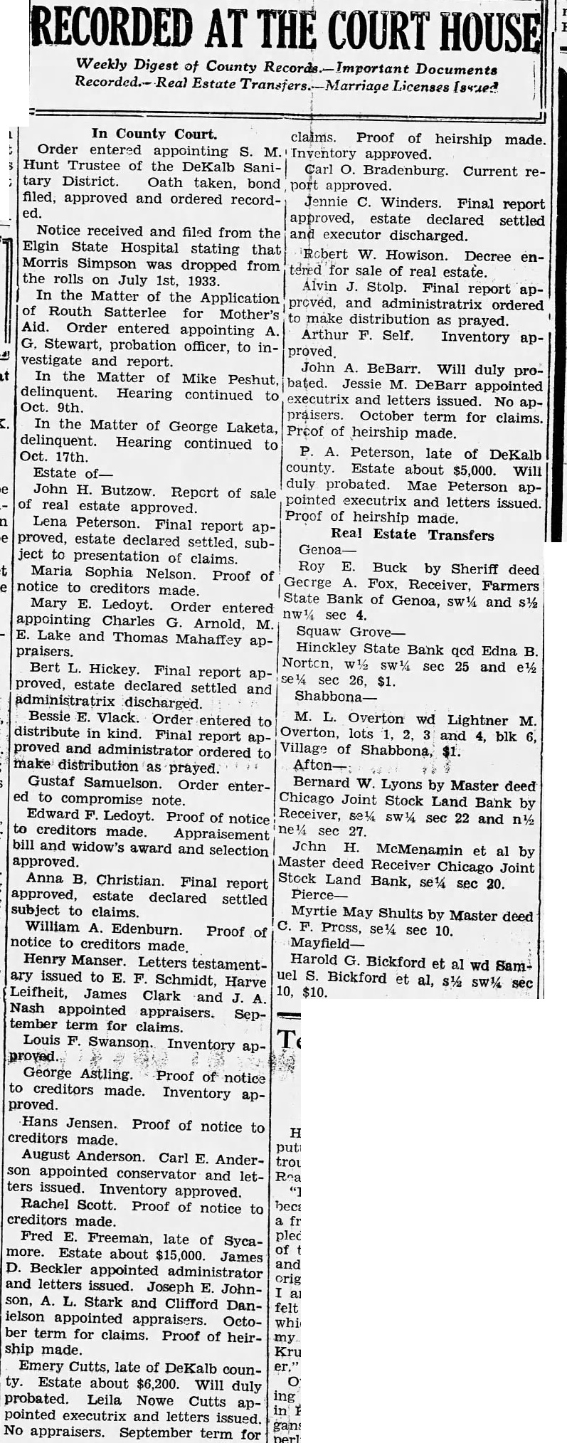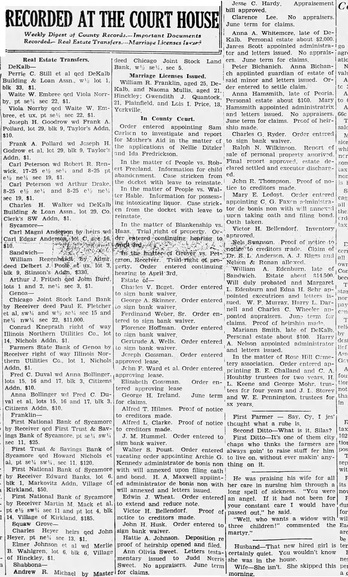 COURTHOUSE DOINGS REAL ESTATE TRANSFERS DEKALB: Perrie C. Still et al qed DeKalb Building & Loan Assn. w½ lot 1, blk. 33. $1.00. Waite W. Embree qed Viola Norrby. pt. se% sec. 22. $1.00. Viola Norrby qed Waite W. Embree, et ux. pt. se% sec. 22. $1.00. Joseph H. Godrow wd Frank A. Pollard, lot 29, blk. 9, Taylor's Addn. $10. Frank A. Pollard wd Joseph H. Godrow, et al, lot 29, blk. 9, Taylor's Addn. $10. Carl Peterson wd Robert R. Renwick, 17-25 e½ and 8-25 pt. e½ ne% sec. 19. $1.00. Carl Peterson wd Arthur Drake. 8-25 e½ sele and 8-25 pt. e½ ne% sec. 19. Charles H. Walker wd DeKalb Building & Loan Assn' lot 29, Co. Clerk's SW Addn. $1.00. SYCAMORE: Carl Magni Anderson by heirs wd Carl Edgar Anderson, lot C, sec. 16. $10 SANDWICH William Regenhardt by Admr. deed Delbert J. Poole, et ux, lot 3. blk. 9, Stinson's Addn. $330. Arthur J. Fritsch qed John Burd. to lots and 2. ne% sec. 3. $1.00 GENOA: Chicago Joint Stock Land Bank by Receiver deed Paul E. Fletcher. et al, and w½ se% sec. 15 and ne% nw% sec. 22. $11,000. Conrad Kneprath right of way IIlinois Northern Utilities Co. lot 14, Nichols Addn. $1.00. Farmers State Bank of Genoa by Receiver right of way Illinois Northern Utilities Co. Lot 1. Nichols Addn. Fred C. Duval wd Anna Bollinger, lats 15, 16 and 17. blk. 3, Citizens Addn. $10. Anna Bollinger wd Fred C. Duval. et al, lots 15, 16 and 17, blk. 3. Citizens Addn. $10. FRANKLIN First National Bank of Sycamore by Receiver ged First Trust & Savings Bank of Sycamore, pt. se% First Trust & Savings Bank of Sycamore ged Howard Nichols et al. First National Bank of Sycamore by wd Edward Banks lot 6. blk Markovitz Addn. Village of Kirkland First National Bank of Sycamore h Receiver w Martin M. Mack et blk. 14. Village of Kirkland. $185. Charles Heyer heirs and John Elmer Johnson et al wd Merlie B. Wahigren. lot 6. blk. 6. Village of Hinckley 00. SH ABBONA Andrew R. Michael by Master deed Chicago Joint Stock Land Bank. IN COUNTY COURT Order entered appointing Sam Carlson to investigate and report for Mother's Aid in the matter of the applications of Nellie Ditzler and Ida Fredrickson. In the matter of People vs. Robert Freeland. Information for child abandonment. Case stricken from the docket with leave to reinstate. In the matter of People vs. Walter Hable. Information for possessing intoxicating liquor. Case stricken from the docket with leave to reinstate. In the matter of Blankenship vs. Haas. Trial right of property. Order entered continuing hearing to April 8. In the matter of Grover vs. Peterson, Receiver. Trial right of property. Order entered continuing hearing to April ESTATE OF: Charles V. Boget. Order entered to sign bank waiver George A. Skinner. Order entered to sign bank waiver. Ferdinand Weber, Sr. Order entered to sign bank waiver. Florence Hoffman. Order entered to sign bank waiver. Gertrude A. Wells. Order entered to sign bank waiver. Joseph Gossman. Order entered approving lease. John F. Ward. et al. Order entered approving lease. Elizabeth Gossman. Order entered approving lease. George H. Ireland. June term for claims. Alfred T. Holmes Proof of notice to creditors made. Alfred L. Clarke. Proof of notice to creditors made. J. M. Hummel. Order entered to sign bank waiver Walter S. Poust. Order entered vacating order appointing Archie G. Kennedy administrator de bonis non with will annexed upon filing oath and bond. H. A. Maxwell appointed administrator de bonis non with will annexed and letters issued. Edwin J. Wheat. Order entered to extend and reduce note. Victor H. Bellendorf. Proof of notice to creditors John H. Husk. Order entered to sign bank waiver Hattle A. Johnson. Deposition re proof of heirship opened and filed. Ann Olivia Sweet. Letters testa. mentary issued to Judd Norris Sweet. No appraisers June term for claims. Jesse C. Hardy Appraisement bill approved. Clarence Lee No appraisers. June term for Anna A. Whitemore, late of DeKalb. Personal estate about $2000. James Scott appointed administrator and letters issued No appraisers. June term for claims. Peter Bichanich. Anna Bichanich appointed guardian of estate of said minor and letters issued. Order entered to settle claim Anna Hamsmith. late of Peoria. Personal estate about $100 Mary Hamsmith appointed administratrix and letters issued. No appraisers. June Term for claims. Proof of heirship made. Charles G. Ryder Order entered sign bank waiver. Ralph N. Wilkinson Report of sale of personal property approved. Final report approved. estate declared settled and executor discharged. John R. Thompson. Proof of notice to creditors made. Mary E. Ledoyt Order entered appointing C. G. Faxon administrator de bonis non with will annexed upon taking oath and filing bond. Oath taken. Victor H. Bellendorf Inventory approved. Nels Swanson. Proof of notice to Creditors made. Claims of Dr. S. L. Anderson. Riggs and Nelson & Ronan allowed William A. Edenburn. late of Sandwich Estate about $14,500. Will duly probated. and Margaret L. Fdenburn and Edna H. Sehr appointed executrices and letters issued. W F. Murray. Harry L. Darnell and Charles Wheeler appointed appraisers June term for claims Proof of heirship made Mariann Smith. late of DeKalb Personal estate about $100 Harry A. Nelson appointed administrator and letters issued. In the matter of Rose Hill Cemetery Association Order entered appointing B. E. Challand and C Houghthy Trustees for two years. H. L. Keene and George Mohr trustees for four years and Storey and W. E. Pennington trustees for six SUBSIDIES DROP LITTLE has been decrease of twelve per cent in the 1933 French air budget over 1932. The current subsidies amount to $83 855 480. which takes care of air lines, trainIng civil pilots of civil pilots, encouragement of touring and sanitary aviation. developing of aviation in general and research and construction of prototypes.
