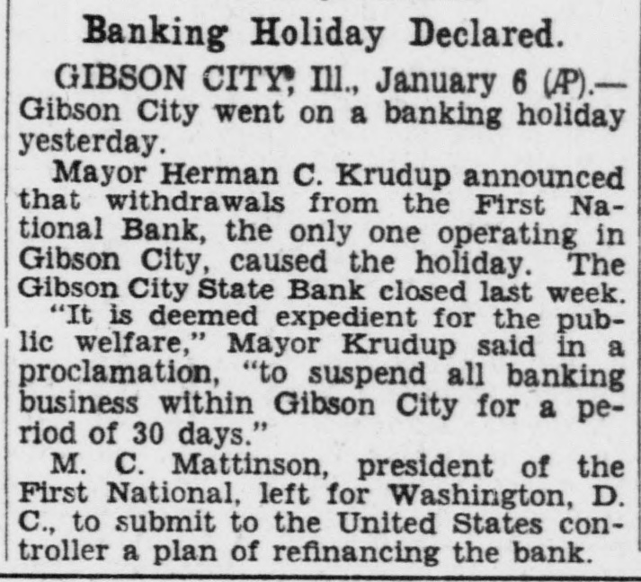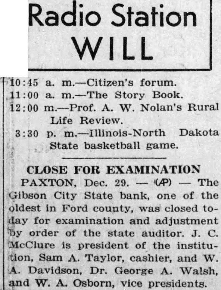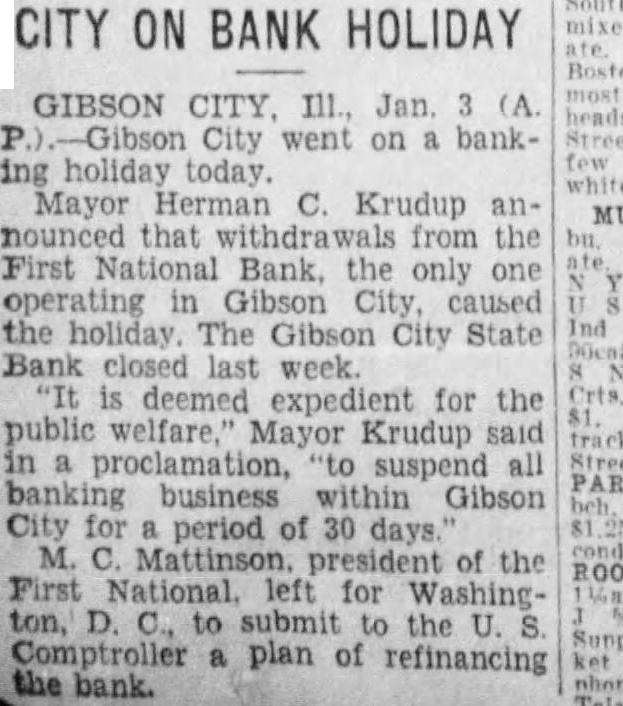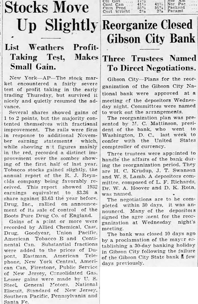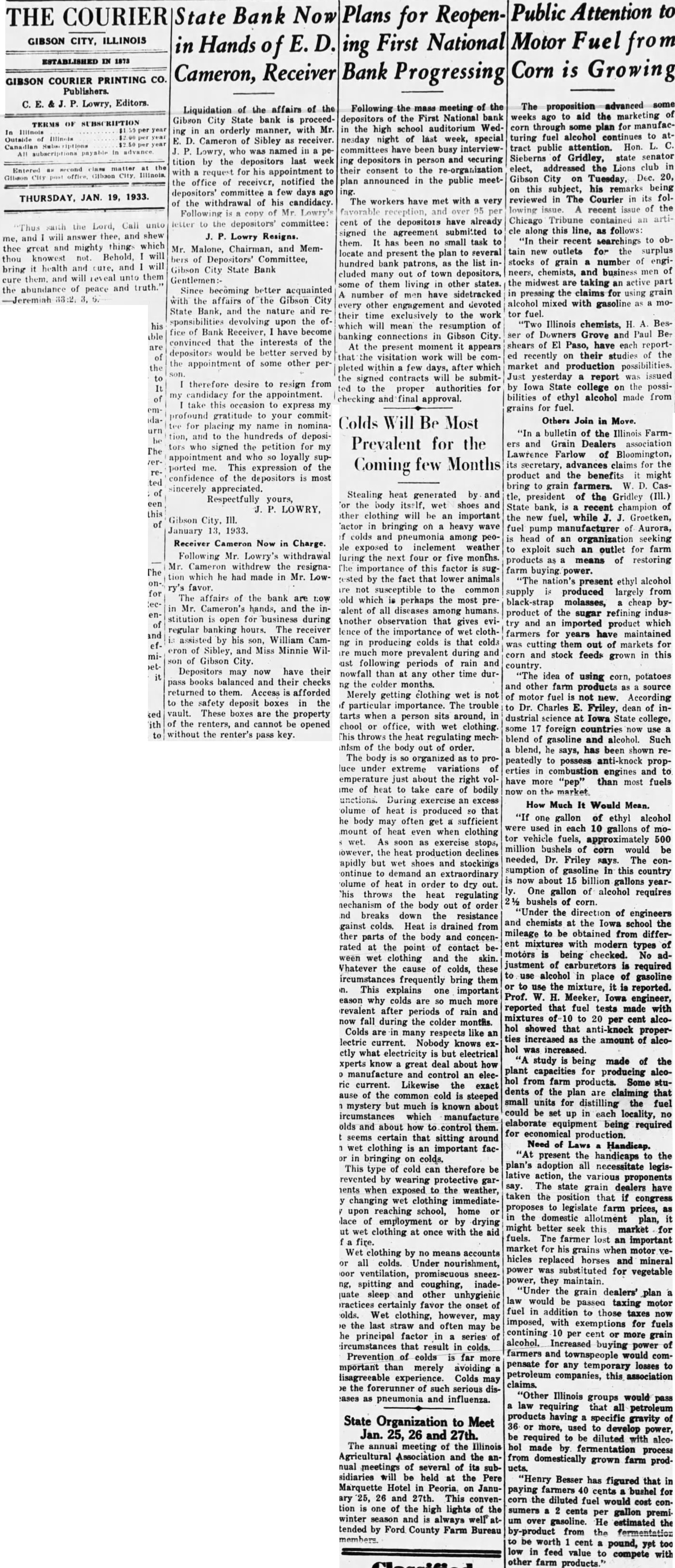 Following the mass meeting of the of the First National bank depositors in the high school auditorium Wednesday night of last week, special committees have been busy interviewing depositors in person and securing their consent to the re-organization plan announced in the public meeting. The workers have met with very favorable and over per cent of the depositors have already signed the agreement submitted to them. It has been no small task locate and present the plan to several hundred bank patrons, as the list included many out of town depositors, some of them living in other states. number men have sidetracked every other engagement and devoted their time exclusively to the work which will mean the resumption of banking connections in Gibson City. At the present moment it appears that the visitation work will be completed within few days, after which the signed contracts will be submitted to the proper authorities for checking and final approval. some weeks ago to aid the marketing of corn through some plan for manufacturing fuel alcohol continues to atpublic attention. Hon. L. tract Sieberns of Gridley, state senator elect, addressed the Lions club in Gibson City on Tuesday, Dec. 20, on this subject, his remarks being reviewed in The Courier in its folissue. recent issue of the lowing Chicago Tribune contained cle along this line, as follows: "In their recent searchings to obtain new outlets for the surplus stocks of grain number of engineers, chemists, and business men of the midwest are taking an active part in pressing the claims for using grain alcohol mixed with gasoline motor fuel. "Two Illinois chemists, H. Besof Downers Grove and Paul Ber shears of El Paso, have each reported recently on their studies of the market and production possibilities. Just yesterday report was issued by Iowa State college on the possibilities of ethyl alcohol made from grains for fuel.