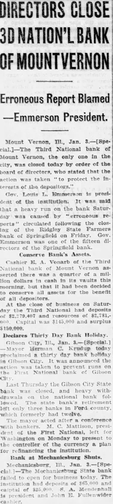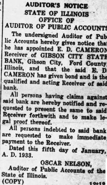 Gibson City, III. January 13, 1933. Receiver Cameron Now in Charge. Following Mr. Lowry's withdrawal Mr. Cameron withdrew the resignation which he had made in Mr. Lowfavor. The affairs of the bank are 1:0W in Mr. Cameron's hands, and the institution open for business during regular hours. The receiver assisted by his son, William Cameron of Sibley, and Miss Minnie Wilof Gibson City. Depositors may now have their pass books balanced and their checks returned to them. Access is afforded to the safety deposit boxes in the vault. These boxes are the property of the renters, and cannot be opened without the renter's pass key.