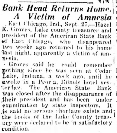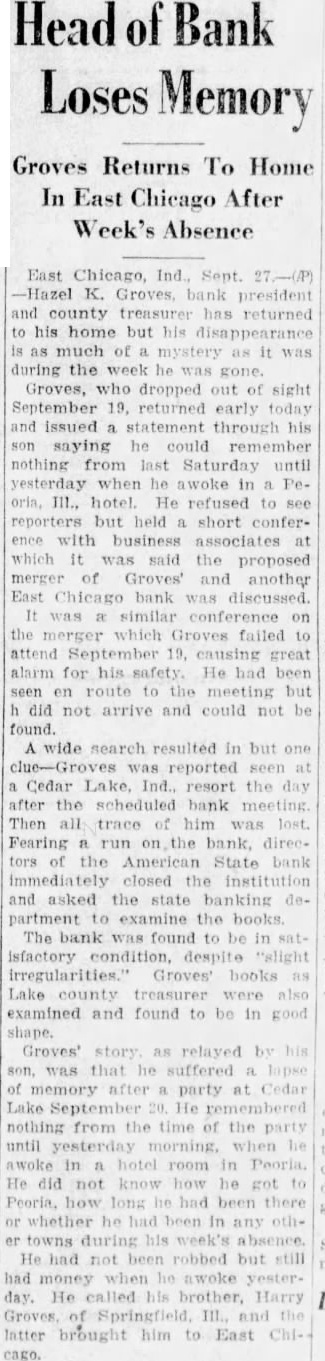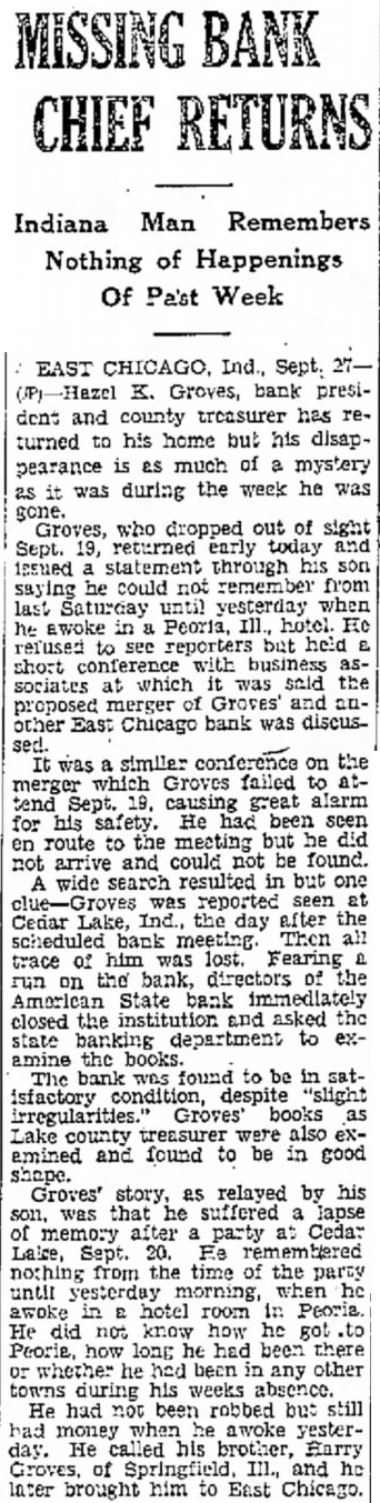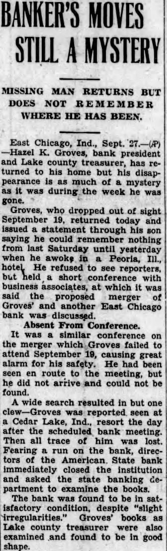 EAST CHICAGO, Ind., Sept. (AP)-Hazel Groves, bank president and county treasurer, has returned to his home, but his disappearance much mystery as it was during the week he was gone. Groves, dropped out sight September 19, early Saturday and issued statement through his saying could remember from last until Prihe awoke in Peoria, hotel. refused reporters, but held short conference with business associates which was said proposed merger Groves' and another East Chicago bank was discussed. It was similar conference on the merger which Groves failed to attend September 19, causing great alarm his safety. He been en route to the but did arrive and could not be A wide search resulted in but one reported Cedar Lake, Ind., resort the day after the scheduled bank meeting Then all trace of him was lost. Fearing run on the bank. directors of the American State Bank immediately closed the institution asked Department to examine the books. The bank was found to be in satisfactory condition, irregularities books as Lake County also amined and found to be in good Groves' story, as related by his son, was that he suffered lapse memory after party Cedar Lake September nothing from the time of the party until Friday morning, when he awoke in Peoria. He did not know how got to Peoria, how long he had there whether he had been any other towns during his absence. He had not been robbed but still had money he awoke Friday. He called his brother, Harry Groves, Springfield, III., the latter brought him to East Chicago. An automobile bearing the license plates issued to Groves was reported Saturday to been several times in Canton, about forty miles from Peoria. The last the plates were noticed in Canton was Wednesday.