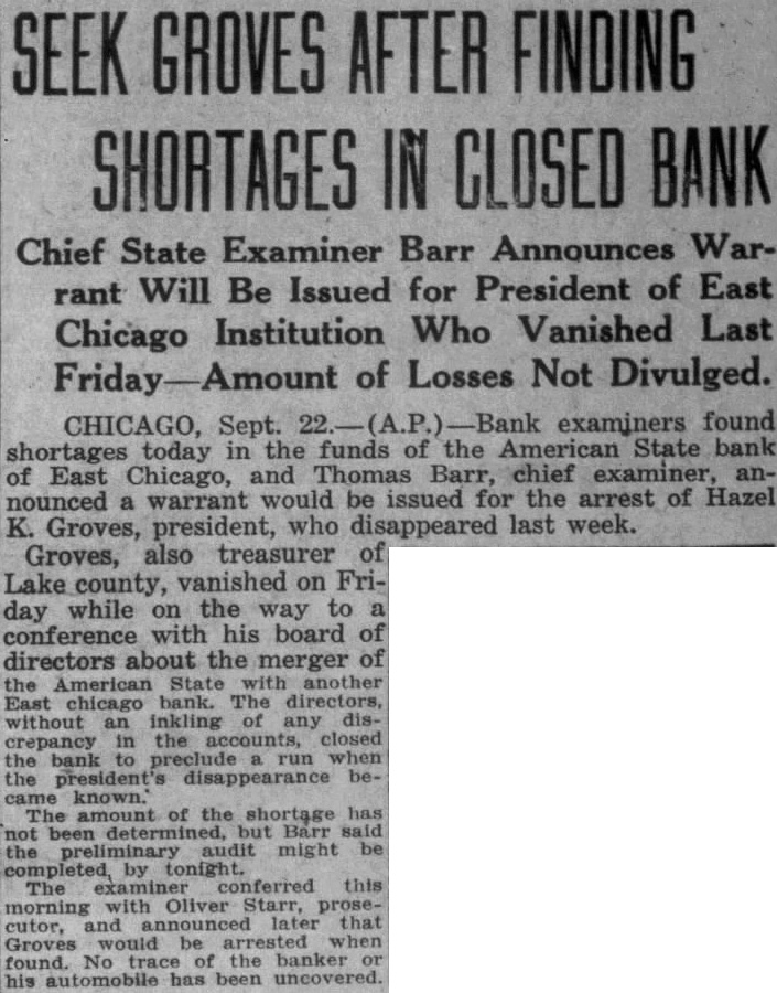 President Hazel K. Groves disappeared (Sept. 19) and state examiners found shortages/irregularities in the bank's accounts; directors closed the bank to preclude a run.