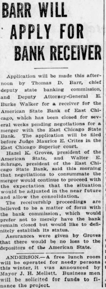 AMERICAN STATE BANK OPENS ITS DOORS TODAY of opened doors ing for first time since positors of than $200 to time under which expects East latter part of this and ultimately sume the full deposit liability of the American formal statement from Thomas D. chief deputy Schrage, of the East Chicago State, in last Times set forth the of the merger. Mr. Schrage, the American State this clared number of depositors already into the bank and had accepted the time certificates, expressed his optimism over the depositors Judge Clyde Cleveland afternoon designated the Peoples which the bank will be open State bank the receiver for the day and defunct Peoples Co-Operative State Mr. volunteered bank of Deputy Attorney General E. Burke Judge and pay the depositors and for full the will receive the the interest of the cash tection the court in of the East Chicago and obligations as the liquidating Mr. Barr prevented this. agent. that the The Peoples immediately the assets of the Peoples account of $200 or Co-Operative, proceed to liquiand the depositors date them and pay out the depositors of $100 would agree to accept gradually as realization made on token of their the notes and other allow the assets ligations payable to the Peoples Coof the American State by the East Operative. In manner, payment Chicago State, and full of 100 percent on deposits will ment deposits the necesmade, although will necessarily of receivership proceedings and sity require little time pending the the consequent loss.