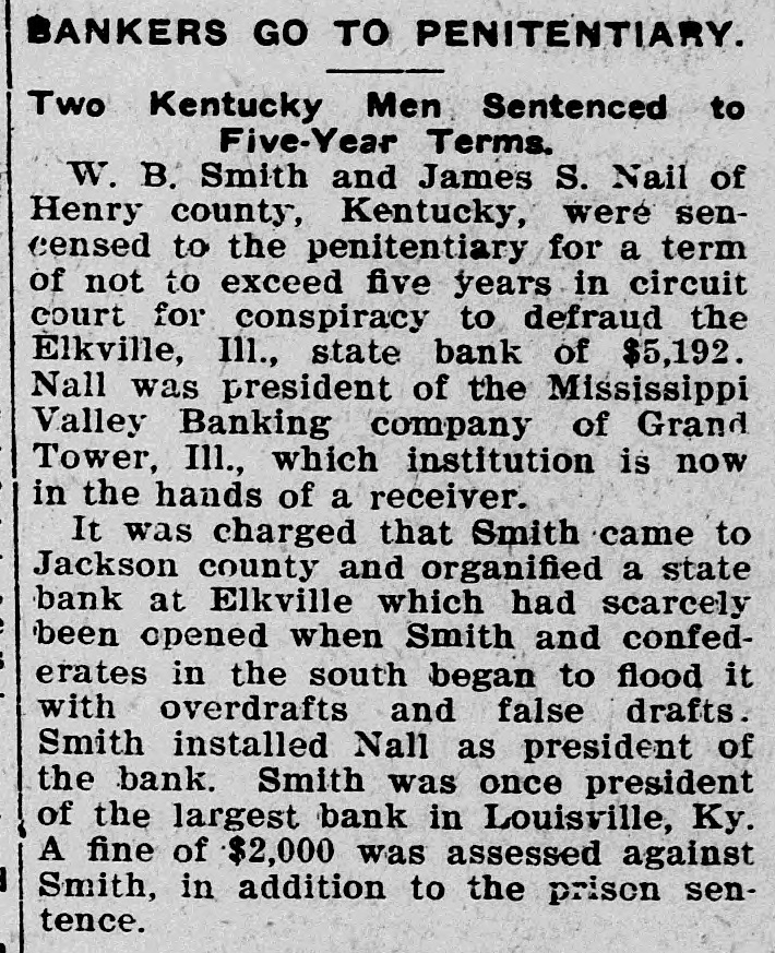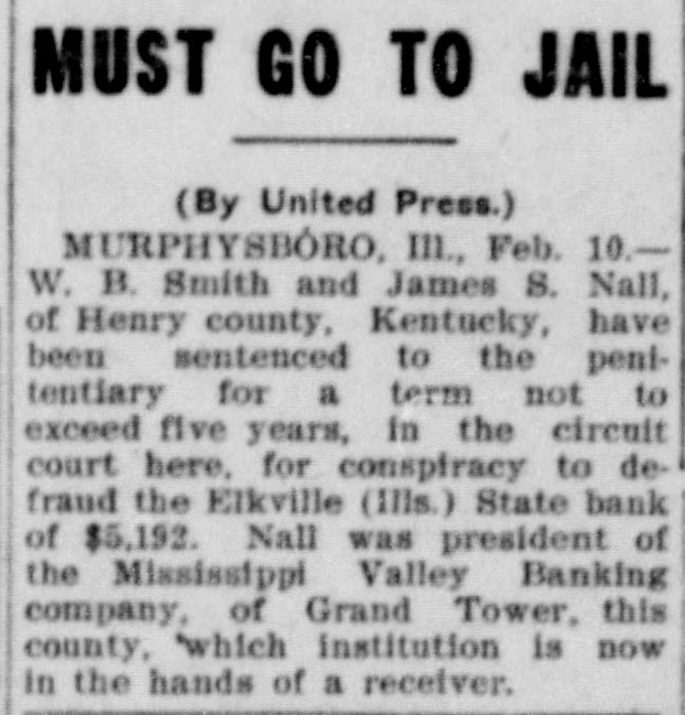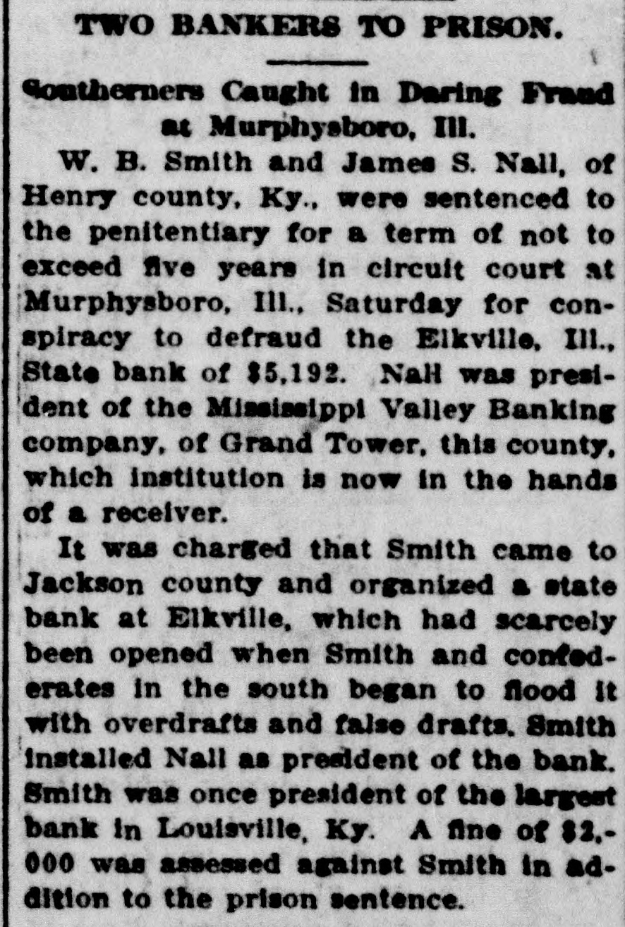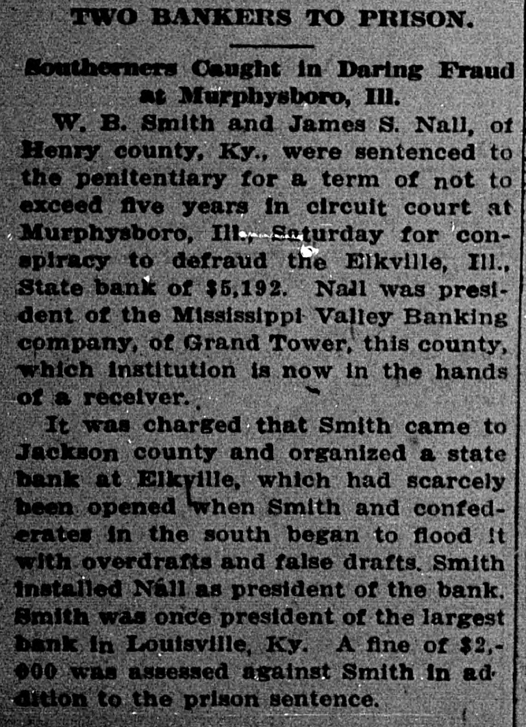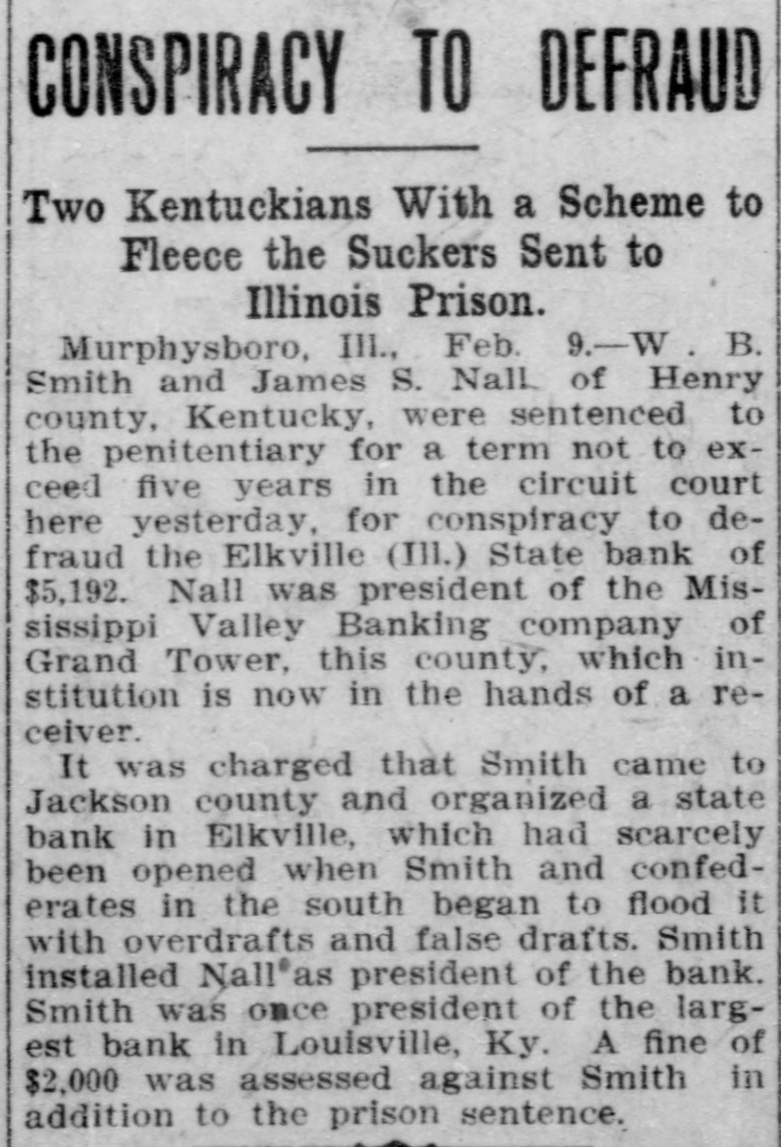 CONSPIRACY TO DEFRAUD Two Kentuckians With a Scheme to Fleece the Suckers Sent to Illinois Prison. Murphysboro, III., Feb. 9.-W. B. Smith and James S. Nall of Henry county, Kentucky, were sentenced to the penitentiary for a term not to exceed five years in the circuit court here yesterday, for conspiracy to defraud the Elkville (III.) State bank of $5,192. Nall was president of the Mississippi Valley Banking company of Grand Tower, this county, which institution is now in the hands of a receiver. It was charged that Smith came to Jackson county and organized a state bank in Elkville, which had scarcely been opened when Smith and confederates in the south began to flood It with overdrafts and false drafts. Smith installed Nallas president of the bank. Smith was once president of the largest bank in Louisville, Ky. A fine of $2,000 was assessed against Smith in addition to the prison sentence.