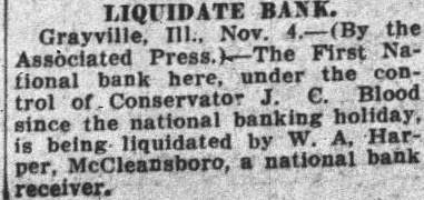 OCR of the article is garbled, but it refers to the First National Bank of Grayville being affected by the 'banking holiday' and being liquidated. No explicit run is mentioned. I infer a suspension (closure during banking holiday/government action) followed by liquidation/receivership.