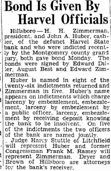 Bond Is Given By Harvel Officials Hillsboro H. H. Zimmerman, president. and John A. Huber, cashier, of the defunct Harvel State bank and who were indicted recently by the Montgomery county grand jury, both gave bond Monday The bonds were signed by Edward Diller, August Best and Edward Zimmerman. Huber is named in eight of the twenty-six indictments returned and Zimmerman in five. Huber's name appears on indictments which charge larceny by embezzlement, embezzlement, larceny by embezlement by a public officer. larceny, embezzlement by receiving deposit knowing the bank to be insolvent. On five of the indictments the two officers of the bank are named jointly Judge Harry Stuttle of Litchfield will represent Huber and former Congressman Frank M. Ramey will represent Zimmerman. Dryer and Brown of Hillsboro are attorneys for the bank's receiver.