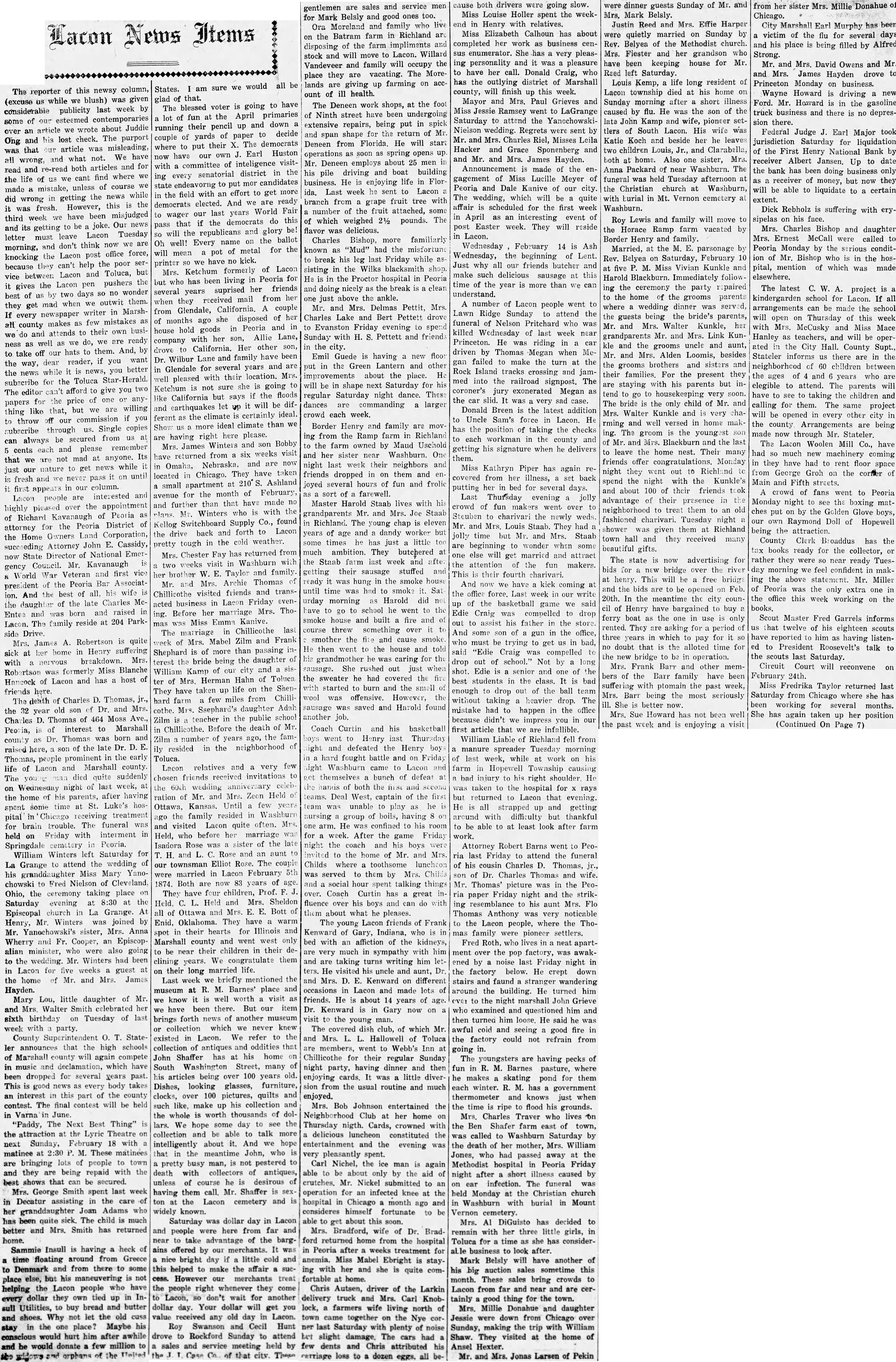 of this column, The reporter newsy while blush) was given last week considerable publicity of our esteemed some about Juddie article we wrote over an his lost check. The purport Ong and article was misleading, was that We have and what not. all wrong, articles and for and re-read both read find where the life of us cant unless of course made mistake, while the news did in getting wrong this the fresh. However, was have been misjudged third week be joke. Our and its getting to Lacon Tuesday letter must leave don't think now morning, and office force, the Lacon post knocking can't help the poor because they Toluca, but Lacon and vice between the Lacon pen pushers gives the no wonder of by two days best outwit them. mad when they get writer in MarshIf every newspaper few mistakes all makes as county attends to their own we do and do, we ready ness well as we to them. And, take off our hats to if want dear reader, you the way, better the while news, news for the Toluca subscribe editor afford to The the of one for price papers willing like that, but we are thing commission if to throw our Single copies subscribe through us. be secured from can always remember each and please cents Its not mad at anyone. that while just our nature to get until is fresh and pass in our column. first appears interested Lacon people are over the appointment highly pleased of Peoria of Richard Kavanaugh District of for the Peoria attorney Owners Land Corporation, the Home John E. Cassidy, Attorney State Director of National now Council. Mr. Kavanaugh gency and first vice World War Veteran Peoria Bar Associatpresident the best of all, his ion. And the Charles Mcthe of the late daughter born and raised Entee and was Lacon. The family reside at side Drive. A. Robertson is quite Mrs. James Henry suffering sick at her home in breakdown. Mrs. with nervous Miss Blanche Robertson was formerly and has host Hancock of Lacon friends here. of Charles D. Thomas, The death of Dr. and the year son Thomas of 464 Moss interest to Marshall Peoria, of Thomas was born and as Dr. county of the late Dr. raised here, son Thomas, people prominent in the early of Lacon and Marshall county life died quite suddenly The night last week, on Wednesday his after having the home parents, time at St. Luke's spent some Chicago receiving treatment pital brain trouble. The funeral for held Friday with interment on Springdale cematery in Peoria. William Winters left Saturday for La Grange to attend the wedding his Miss Mary Yanochowski to Fred Nielson of Cleveland, Ohio, the ceremony taking place 8:30 the Saturday evening at Episcopal church La Grange. Winters joined by Henry, Mr. Yanochowski's sister, Mrs. Anna Wherry and Fr. Cooper, Episcopalian minister, who were also going to the wedding. Mr. Winters had been in Lacon for five weeks guest the home Mr. and Mrs. James Hayden. Lou, little daughter of Mr. Mary and Mrs. Walter Smith celebrated her sixth Tuesday of last birthday week with party. County Superintendent ler announces that the high schools of Marshall county will again compete in music and declamation, which have been dropped for several years past. This is good news as every body takes interest this part of the county an contest. The final contest will be held in Varna in June. "Paddy, The Next Best Thing" the attraction at the Lyric Theatre next Sunday, February 18 matinee at P. M. These matinees bringing lots of people to town are and they being repaid with the best shows that can be secured. George Smith spent last in Decatur assisting in the care Joan Adams who her granddaughter has quite sick, The child much better and Mrs. Smith has returned home. Sammie Insull is having heck of time floating around from Greece to Denmark and from there some else, but his maneuvering not place the Lacon who have helping people dollar they own tied up every buy bread and butter sull Utilities, shoes. Why not let the old and in the one Maybe his stay place? conscious would hurt him after and would donate few million the be States. sure of that. to have blessed voter is going The the April primaries lot of fun at and down their pencil up running to decide of yards of paper couple The democrats where to their put Earl Huston have our committee of inteligence with district in the senatorial ing every candidates endeavorng to mor state with an effort to get in the field are ready democrats elected. And World our last years to wager do this if the democrats that pass be! the and glory will republicans the ballot well! Every name on Oh metal for the pot of will mean have no kick. printer we of Lacon Ketchum formerly Mrs. in Peoria for who has been living but her friends several suprised years received mail from when they California. couple from Glendale, she disposed of of months Peoria and in hold goods in house Allie Lane, with her son, company Her other son, drove California. and family have Dr. Wilbur Lane for several years Glendale with their location. pleased she going Ketchum not sure the floods California but let will and earthquakes climate certainly ferent ideal climate than Show more right here please. having Winters and son Bobby James from six weeks returned and Omaha, They have taken located Chicago. Ashland small apartment at month of February for the avenue that have made and further than who with the Winters Co., found Switchboard Supply Kellog forth Lacon the drive back and the cold weather. pretty tough in has returned from Mrs. Chester Fay visit Washburn two weeks Taylor and family. brother Archie Thomas Mr. Mrs. visited friends and Chillicothe business in Lacon Friday acted Mrs. ThoBefore her marriage Miss Emma Kanive. Chillicothe last The marriage in Mabel Zilm and Frank week of Mrs. of more than passing Shephard bride being the daughter terest the of city and William Kamp our Hahn of of Mrs. Herman life the They have taken up miles from Chillihard farm few daughter Adah Ssephard's the public school Zilm teacher in the death of Mr. Ch