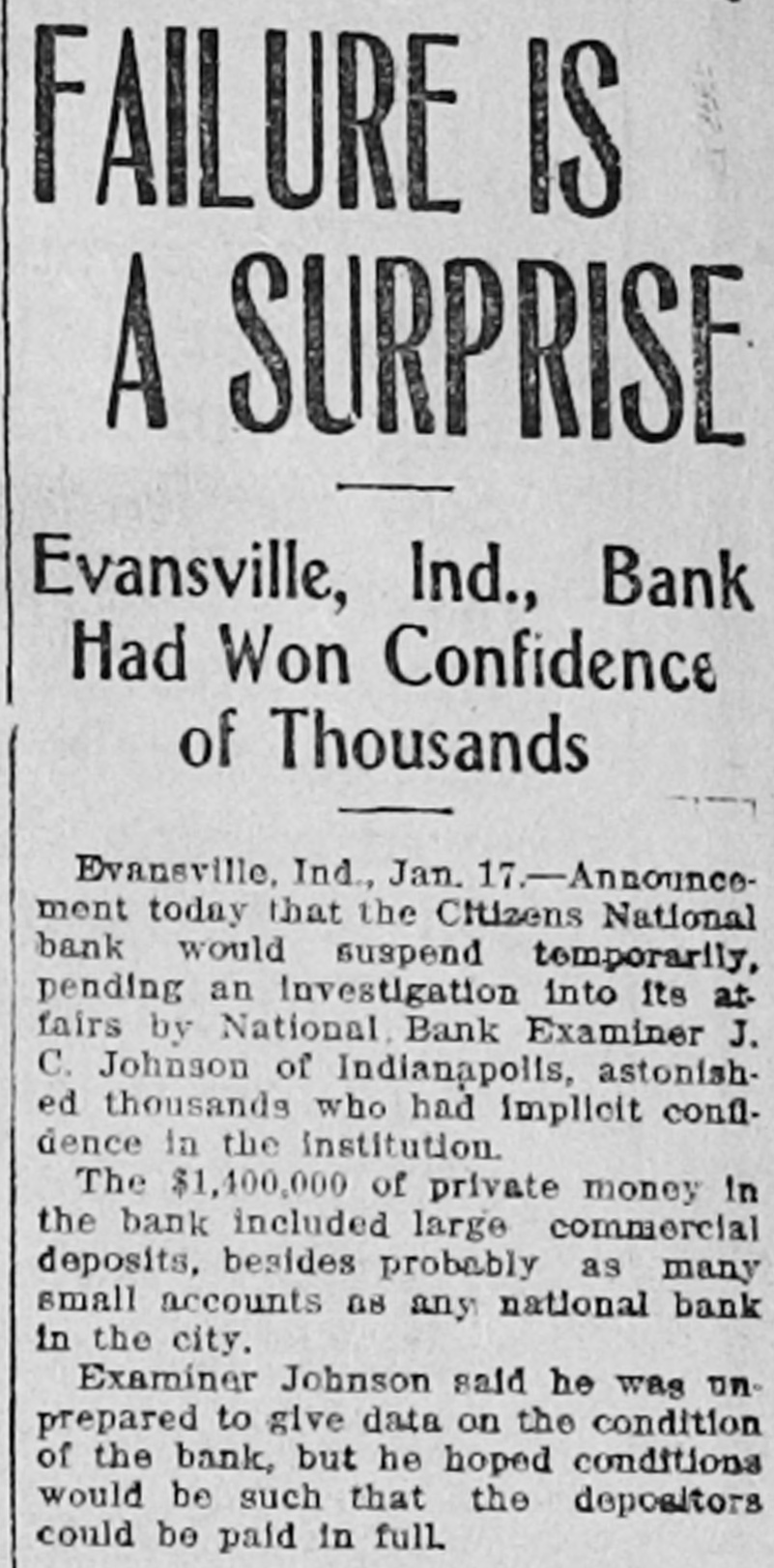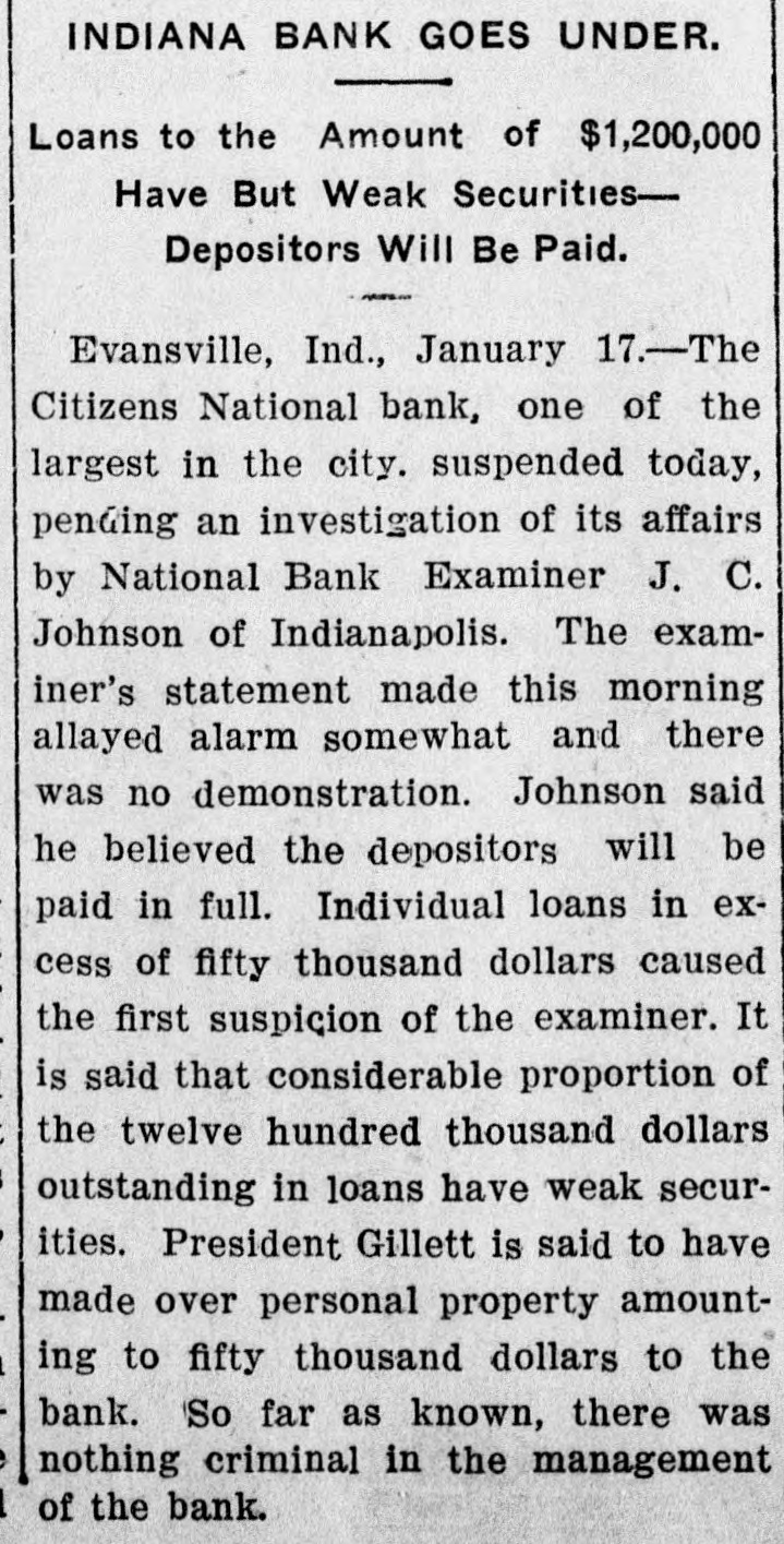 BIG BANK SUSPENDS. Pending an Investigation. by the National Examiner. Evansville, Ind., Jan. 17.-Announcement today that the Citizens' National bank would suspend temporarily pending an investigation into its affairs by National Bank Examiner J. C. Johnson, of Indianapolis, astonished thousands who had implicit confidence in the institution. The plain statement of the examiner made in the newspapers in advance of the hour of opening today served somewhat to allay alarm and there was no demonstration around the bank doors by depositors. The $1,400,000 of private money in the bank included large commercial deposits besides probably as many small accounts as any national bank in the city. Examiner Johnson said he was unprepared to give data on the condition of the bank, but he hoped conditions would be such that the depositors could be paid in full. This same hope is offered in the brief notice posted by the examiner on the bank's doors. It is known that out of $1,202,000 outstanding in loans there is a considerable proportion in which the credit is weak. but just how much is a question. Individual loans in excess of $50,000 caused the first suspicion of the examiner. It is said that President S. P. Gillette has borrowed to that extent, but he has made over personal property to indemnify the bank. So far as known there is nothing criminal in the alleged mismanagement of the institution.
