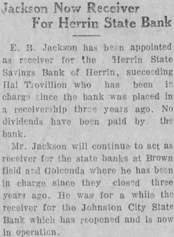E. B. Jackson has been appointed as receiver for the Herrin State Savings Bank of Herrin, succeeding Hal Trovillion who has been charge since the bank was placed in receivership three years ago. No dividends have been paid by the bank Mr. Jackson will continue to act as receiver for the state banks at Brown field and Golconda where he has been in charge since they closed three years ago. He was for while the receiver for the Johnston City State Bank which has reopened and is now in operation.