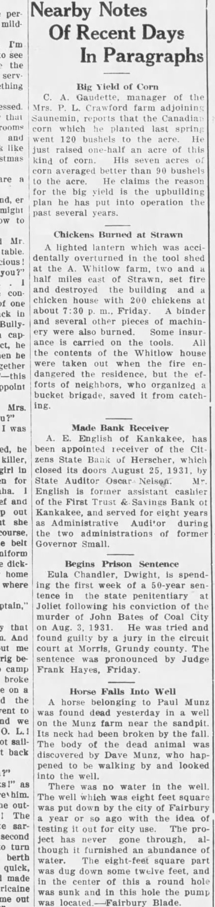 Nearby Notes Of Recent Days In Paragraphs Big Yield of Corn C. A. Gaudette, manager of the Mrs. P. L. Crawford farm adjoining Saunemin, reports that the Canadia corn which he planted last spring went 120 bushels to the acre. He just raised one-half an acre of this kind of corn. His seven acres of corn averaged better than 90 bushels to the acre. He claims the reason for the big yield is the upbuilding plan he has put into operation the past several years. Chickens Burned at Strawn A lighted lantern which was acci dentally overturned in the tool shed at the A. Whitlow farm, two and half miles east of Strawn, set fire and destroyed the building and chicken house with 200 chickens at about 7:30 p. m., Friday A binder and several other pieces of machinery were also burned. Some insur ance is carried on the tools. All the contents of the Whitlow house were taken out when the fire en dangered the residence, but the ef forts of neighbors, who organized bucket brigade, saved it from catching. Made Bank Receiver A. E. English of Kankakee, has been appointed receiver of the Cit zens State Bank of Herscher, which closed its doors August 25, 1931. by State Auditor Oscar Nelson Mr. English is former assistant cashier of the First Trust & Savings Bank of Kankakee, and served for eight years as Administrative Auditor during the two administrations of former Governor Small. Begins Prison Sentence Eula Chandler, Dwight, is spending the first week of a 50-year sen tence in the state penitentiary at Joliet following his conviction of the murder of John Bates of Coal City on Aug. 3. 1931. He was tried and found guilty by a jury in the circuit court at Morris, Grundy county The sentence was pronounced by Judge Frank Hayes, Friday. Horse Falls Into Well A horse belonging to Paul Munz was found dead yesterday in a well on the Munz farm near the sandpit. Its neck had been broken by the fall. The body of the dead animal was discovered by Dave Munz, who happened to be walking by and looked into the well. There was no water in the well. The well which was eight feet square was put down by the city of Fairbury a year or so ago with the idea of testing it out for city use. The project has never gone through, although it furnished an abundance of water. The eight-feet square part was dug down some twelve feet, and in the center of this a round hole was sunk and in this hole the pump was located -Fairbury Blade.