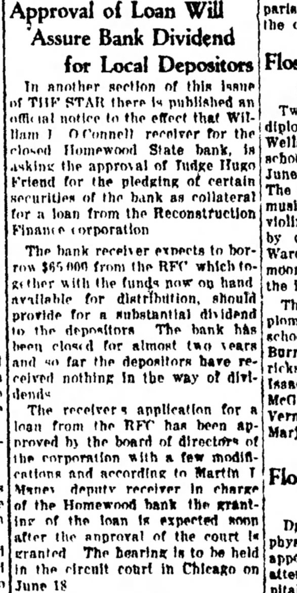 of Loan Will Assure Bank Dividend for Local Depositors In another section of this issue THE there published notice the effect that Ham receiver for the Wells closed Homewood State bank, school asking approval of Tudge Hugo June Friend for the pledging of certain The the collateral music loan from the Reconstruction Finance corporation The bank expects to Ward from the RFC funds now hand the available for distribution. should provide for plomas bank has school for almost and far the depositors have nothing in the way of The receiver application for loan from the RFC been proved the board of directors few modifications according Martin Maney deputy In charge bank the grantof loan expected soon Dr after the court granted The hearing circuit court in Chicago June 18 pital
