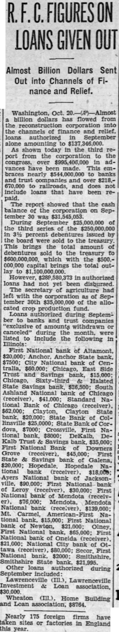 Almost Billion Dollars Sent Out into Channels of nance and Relief. Oct. billion dollars has flowed from into the channels and relief. loans authorized September alone amounting As shown today in the third port from the corporation to congress, over in vances have been made. This braces nearly to banks and trust companies and $218,railroads, and does include loans that have been paid. The report showed that the cash balance of the corporation on September During September the third series of the percent issued sold to the This brings the total amount debentures sold to the treasury which with the capital the total outto in authorized loans had not been disbursed. yet The secretary of agriculture had left with the corporation of September 30th the allocated production fund. Loans authorized during September to banks and trust companies "exclusive of amounts canceled" during the month, were listed to include the following Illinois: First National bank of Altamont, State bank, $7500; City National bank of Centralia, Chicago, Side Savings bank, Chicago, Halsted State bank, South Ashland National bank of Chicago National Bank Clayton State bank, State Bank of ColState Bank of $7000; Crossville, First National bank, $8000; DeKalb. Trust bank, First National Bank of Downers Grove (receiver), $45,000; First State Savings bank of Galena, Hopedale, Hopedale tional bank (receiver), $18,000; Ayers National bank JacksonFirst National bank Leroy (receiver), First National bank Mendota (receiv$76,000; Mendota, Mendota National bank (recelver), Mt. Carmel, National bank, First National bank of Newton, Olney, First bank, First National bank Oneida (receiver), National City bank (receiver), Secor, First National bank, Smithshire, Smithshire State bank, Other authorized during September included: (III.), Lawrenceville Loan association, Wheaton Home Building and Loan association, $8764. Nearly 175 foreign firms have taken sites or factories in England this year.
