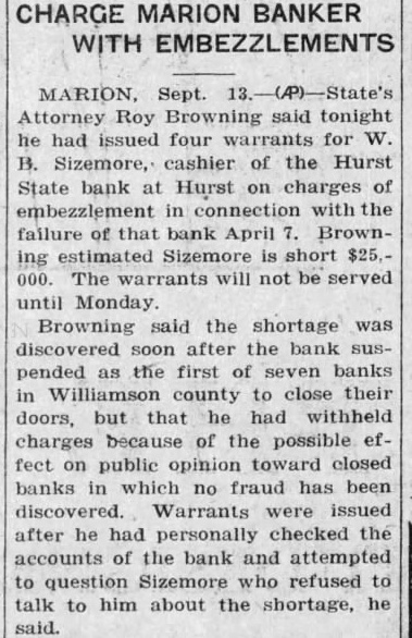 FOUR REST RESIST Word of Large Sum Enroute to First National of Marion Halts Rush within two weeks, failed their doors today and precipitated upon other banks of the county. Sheriff Oren Coleman armed with machine guns, and state highway patrolmen were on duty the banks and on the streets of the various in the county all noon today that Federal Bank of St. was sending large sum currency armored truck the First National bank Marion stopped the run that bank before noon and none of the outside money was in demands depositors. MERCHANTS TO RESCUE Marion made deposits the First National today instill confidence. The Marion Trust and Savings bank following the $145,000 on Friday and Saturday decided not reopen Monday despite the fact that had $225,000 cash available for Monday This decision was reached by the with belief that they could possibly organize and all depositors 100 the dollar. The other banks which failed to today were First State Bank the and Savings and the State Bank Cambria the Citizens State Bank of Johnston the Hurst State bank and the Herrin State and Savings banks had closed. SHOWS LARGE RESOURCES The Marion Trust and Savings bank in its statement of condition March 27 showed resources building. the largest in the county The Pittsburg bank, located in little mining town, had. according to its last report, (Continued on Page Three)