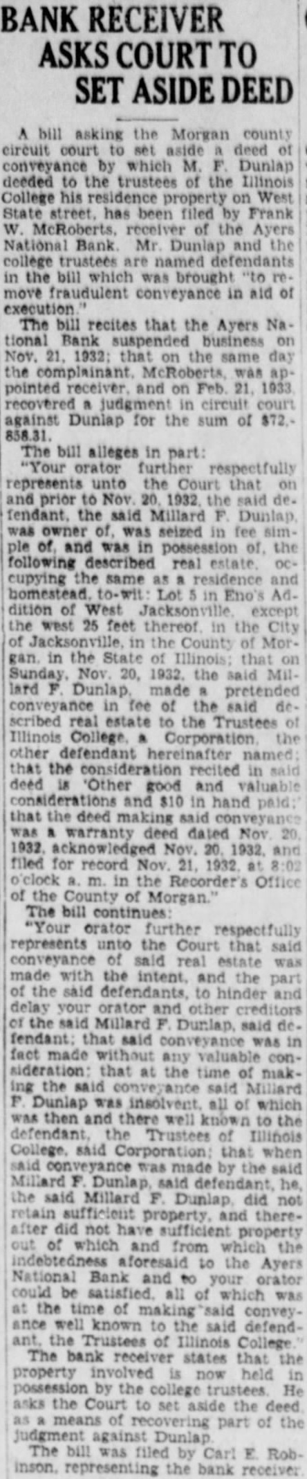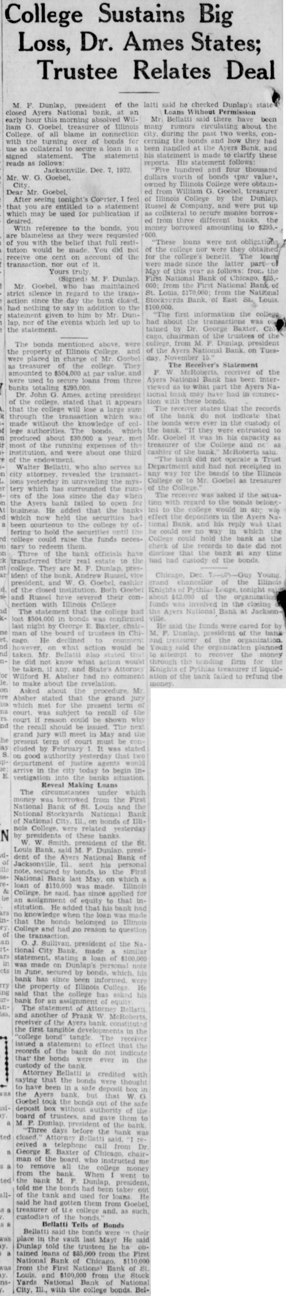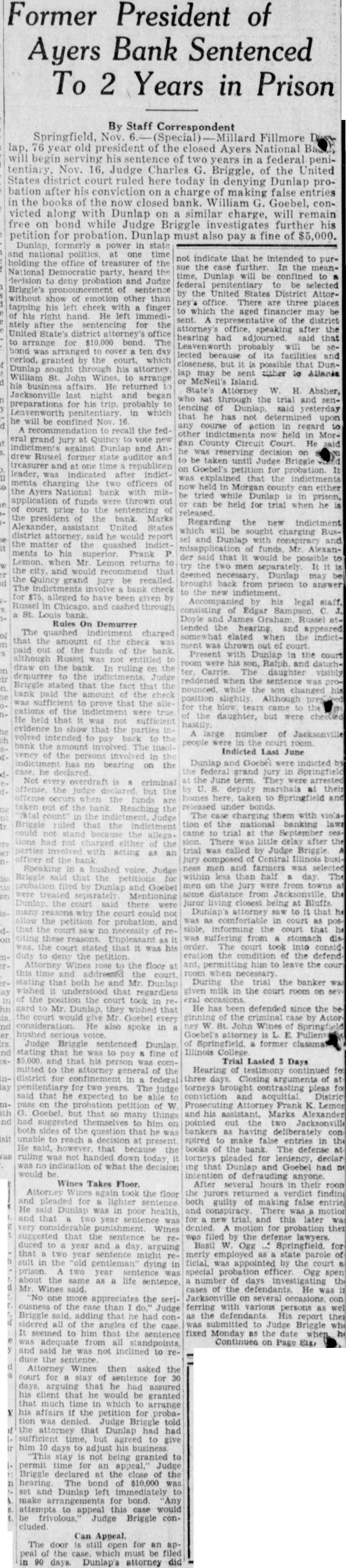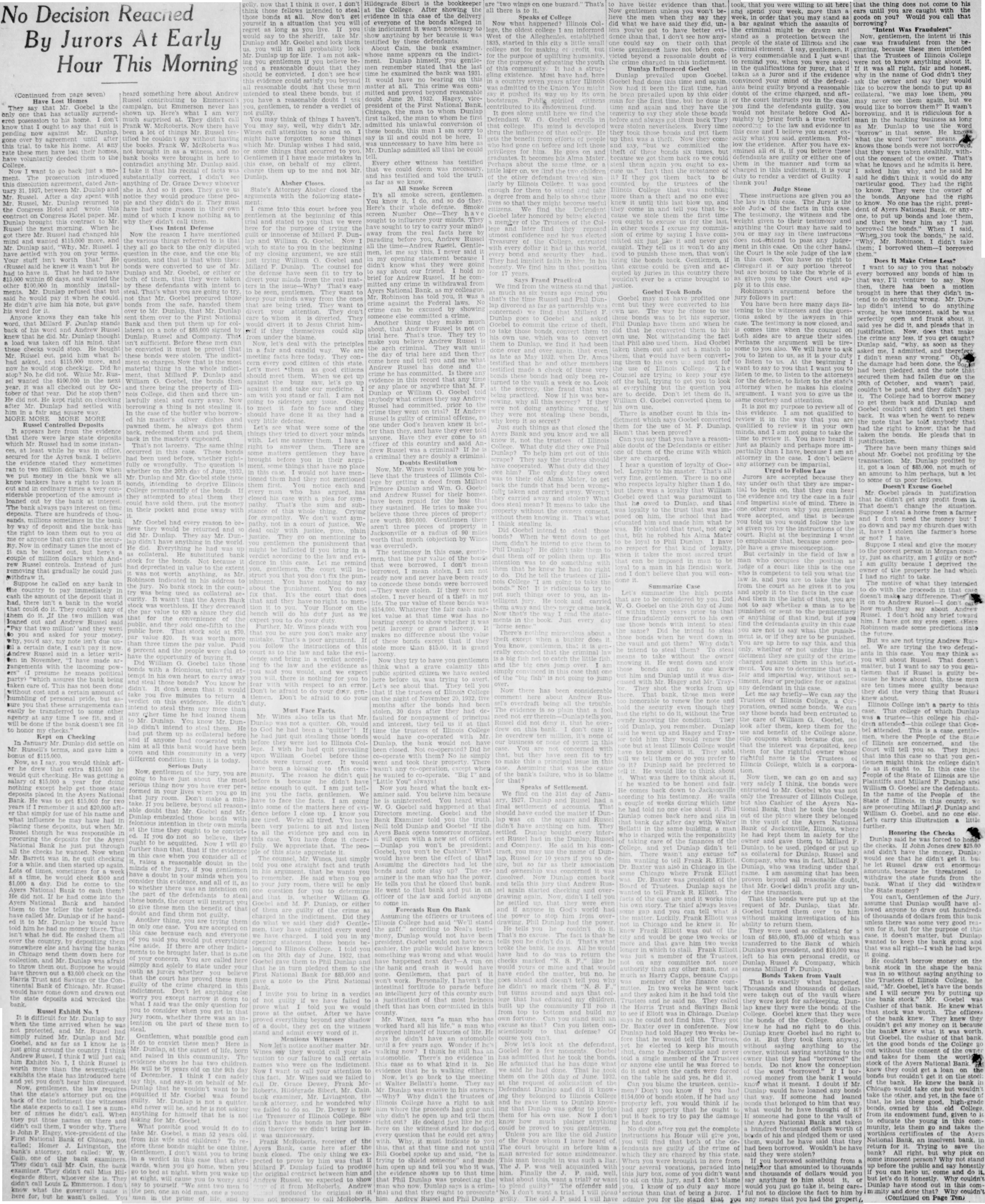 (Continued from page seven) Have Lost Homes that Goebel is the They say that has actually surrendto his home. know that ought say suit now against Dunlap, pending take his home. any lost voluntarily them to the College. want to go back just moThe dated this 1927, Mr. Dunlap uary Mr. After day spent Mr. Russel, returned to Hotel wrote on Hotel paper Mr Dunlap this Mr Russel next When there Mr. had his and said, Mr. Mr. Dunlap with you on your terms. Your stuff isn't worth He said he but had to have That he had to have within 60 days, and wanted the other monthly installments. Dunlap refused that but said he would pay when he He didn't him his note, but gave word for Anyone knows they can take his word, that Millard Dunlap stands back of his word and Andrew Russel knew he Mr Dunlap thought load was taken off his mind, that checks would He Mr. Russel paid what had asked, and now he Did did not. Mr. Russel the in the next year. was out October of that Did stop then? He did He kept Mr. had fair MORE MORE MORE MORE Russel It appears from the evidence there were state deposits which Mr. Russel instances, while he in office for the Ayres believe ran two Now when money the bank we all know bankers right it and in ordinary times very siderable of the amount loaned by the bank at interest The bank always interest on time deposits. There are hundreds of thousands, in the bank by deposit and the bank has the right to loan them out to you or me that give the securNow ordinary the most of can be loaned but here's couple Andrew of gradually he could just withdraw Suppose he called on any bank in to pay the the deposit that had, isn't bank in the world that any them do If the million was loaned Russel said that and they went and for you'd isn't due pay now Russel said letter ten in made arwith the powparty) the bank being taken care This has not been done without cost humbling pride, but sure you that these easily be to some other agency at any fit. and will done the bank doesn't see fit to honor my checks Kept on Checking In January Mr. Dunlap settle on Mr. terms, and him of as you would think aft. he drew he would He was getting salary $15,000 for doing nothing except help those state deposits in Ayers National Bank He was to get $15,000 for two years and $20,000 simply for his name and what he may had these but when Mr. Russel he was procuring the for the Ayers National Bank he just put all the he Mr. in, he quit checking then up of for he would $500 and $1,000 Did he the to cash them? He did not. he had the handed them to the the teller would Mr Dunlap he handto Mr he would he had there isn't what he He cashed them the depositing them else the banks Chicago send here for and Mr. Dunlap was afraid throw them out have thrown out check on the Harris Trust and Savings or the Continental Bank of Chicago, Mr. Russel would have come out the state deposits wrecked the bank.