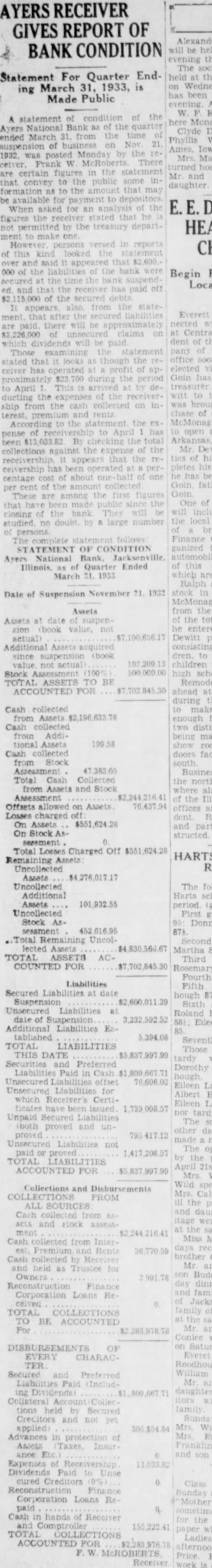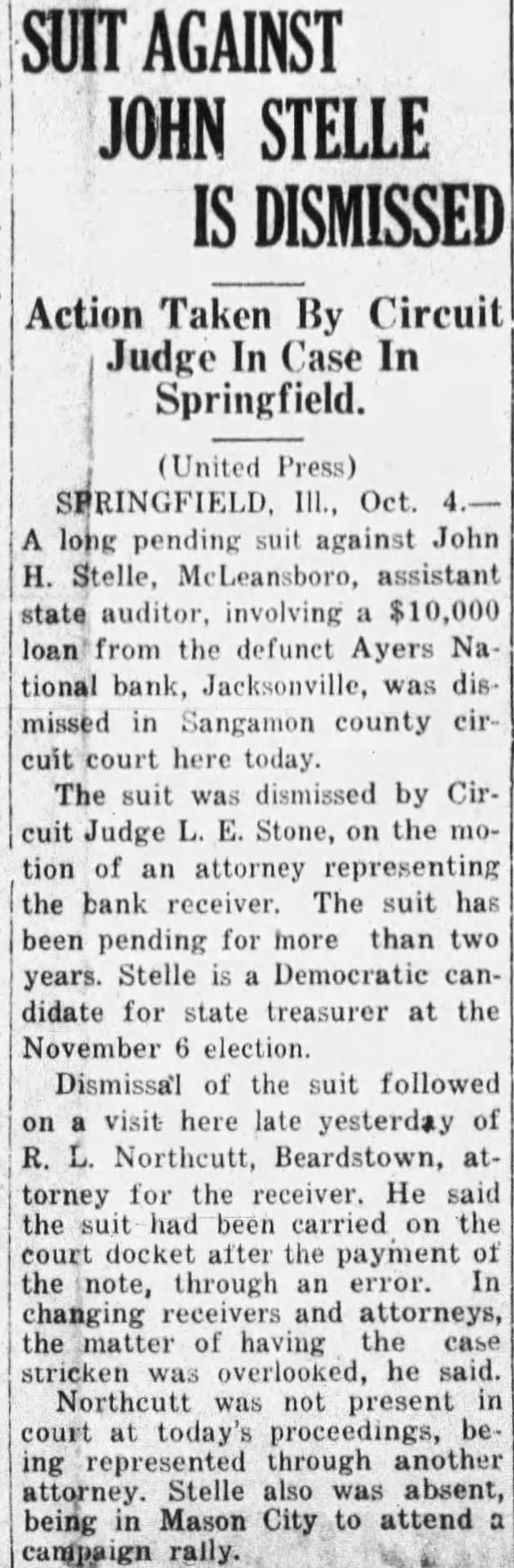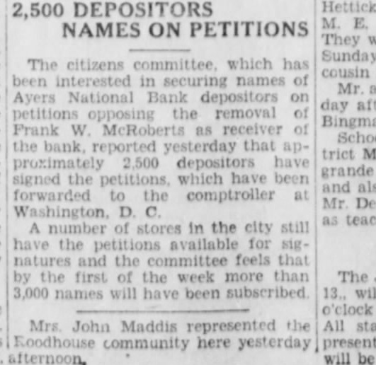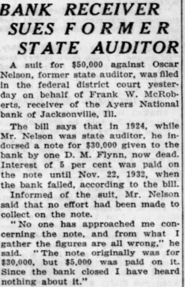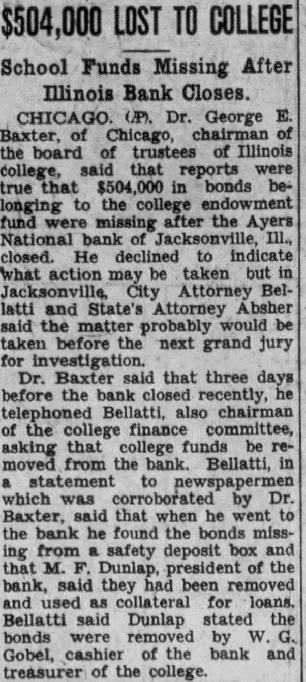(Continued from page seven) Have Lost Homes that Goebel is the They say that has actually surrendto his home. know that ought say suit now against Dunlap, pending take his home. any lost voluntarily them to the College. want to go back just moThe dated this 1927, Mr. Dunlap uary Mr. After day spent Mr. Russel, returned to Hotel wrote on Hotel paper Mr Dunlap this Mr Russel next When there Mr. had his and said, Mr. Mr. Dunlap with you on your terms. Your stuff isn't worth He said he but had to have That he had to have within 60 days, and wanted the other monthly installments. Dunlap refused that but said he would pay when he He didn't him his note, but gave word for Anyone knows they can take his word, that Millard Dunlap stands back of his word and Andrew Russel knew he Mr Dunlap thought load was taken off his mind, that checks would He Mr. Russel paid what had asked, and now he Did did not. Mr. Russel the in the next year. was out October of that Did stop then? He did He kept Mr. had fair MORE MORE MORE MORE Russel It appears from the evidence there were state deposits which Mr. Russel instances, while he in office for the Ayres believe ran two Now when money the bank we all know bankers right it and in ordinary times very siderable of the amount loaned by the bank at interest The bank always interest on time deposits. There are hundreds of thousands, in the bank by deposit and the bank has the right to loan them out to you or me that give the securNow ordinary the most of can be loaned but here's couple Andrew of gradually he could just withdraw Suppose he called on any bank in to pay the the deposit that had, isn't bank in the world that any them do If the million was loaned Russel said that and they went and for you'd isn't due pay now Russel said letter ten in made arwith the powparty) the bank being taken care This has not been done without cost humbling pride, but sure you that these easily be to some other agency at any fit. and will done the bank doesn't see fit to honor my checks Kept on Checking In January Mr. Dunlap settle on Mr. terms, and him of as you would think aft. he drew he would He was getting salary $15,000 for doing nothing except help those state deposits in Ayers National Bank He was to get $15,000 for two years and $20,000 simply for his name and what he may had these but when Mr. Russel he was procuring the for the Ayers National Bank he just put all the he Mr. in, he quit checking then up of for he would $500 and $1,000 Did he the to cash them? He did not. he had the handed them to the the teller would Mr Dunlap he handto Mr he would he had there isn't what he He cashed them the depositing them else the banks Chicago send here for and Mr. Dunlap was afraid throw them out have thrown out check on the Harris Trust and Savings or the Continental Bank of Chicago, Mr. Russel would have come out the state deposits wrecked the bank.