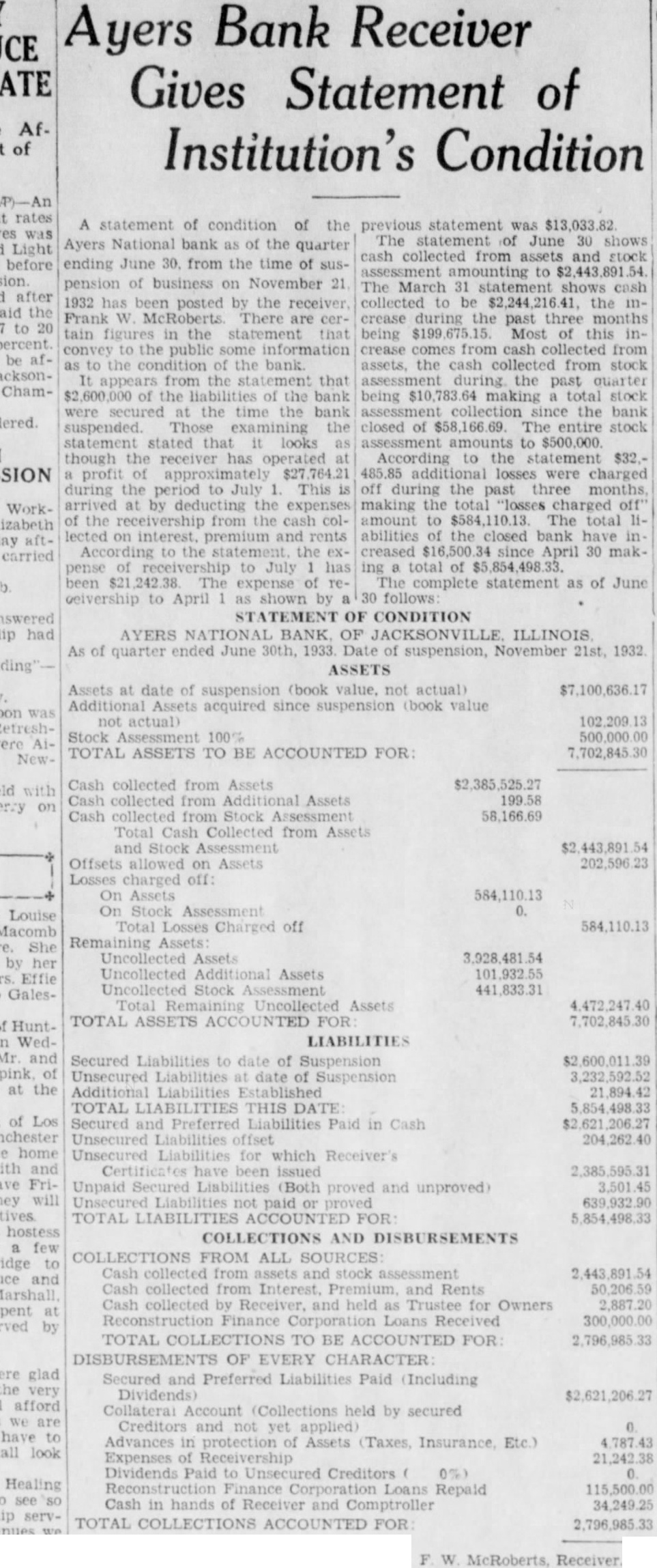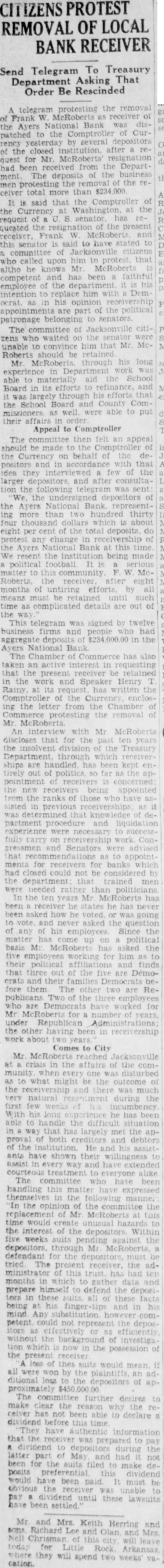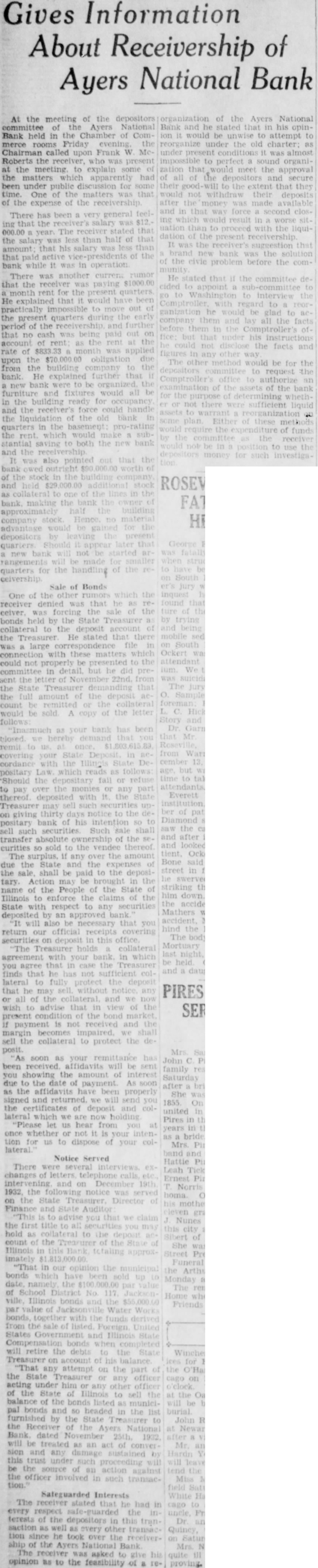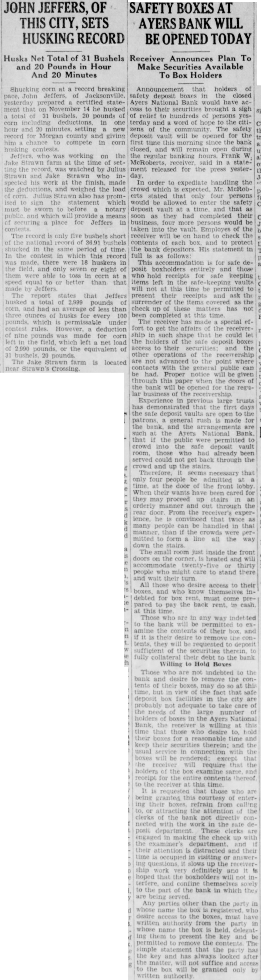 (Continued from page seven) Have Lost Homes that Goebel is the They say that has actually surrendto his home. know that ought say suit now against Dunlap, pending take his home. any lost voluntarily them to the College. want to go back just moThe dated this 1927, Mr. Dunlap uary Mr. After day spent Mr. Russel, returned to Hotel wrote on Hotel paper Mr Dunlap this Mr Russel next When there Mr. had his and said, Mr. Mr. Dunlap with you on your terms. Your stuff isn't worth He said he but had to have That he had to have within 60 days, and wanted the other monthly installments. Dunlap refused that but said he would pay when he He didn't him his note, but gave word for Anyone knows they can take his word, that Millard Dunlap stands back of his word and Andrew Russel knew he Mr Dunlap thought load was taken off his mind, that checks would He Mr. Russel paid what had asked, and now he Did did not. Mr. Russel the in the next year. was out October of that Did stop then? He did He kept Mr. had fair MORE MORE MORE MORE Russel It appears from the evidence there were state deposits which Mr. Russel instances, while he in office for the Ayres believe ran two Now when money the bank we all know bankers right it and in ordinary times very siderable of the amount loaned by the bank at interest The bank always interest on time deposits. There are hundreds of thousands, in the bank by deposit and the bank has the right to loan them out to you or me that give the securNow ordinary the most of can be loaned but here's couple Andrew of gradually he could just withdraw Suppose he called on any bank in to pay the the deposit that had, isn't bank in the world that any them do If the million was loaned Russel said that and they went and for you'd isn't due pay now Russel said letter ten in made arwith the powparty) the bank being taken care This has not been done without cost humbling pride, but sure you that these easily be to some other agency at any fit. and will done the bank doesn't see fit to honor my checks Kept on Checking In January Mr. Dunlap settle on Mr. terms, and him of as you would think aft. he drew he would He was getting salary $15,000 for doing nothing except help those state deposits in Ayers National Bank He was to get $15,000 for two years and $20,000 simply for his name and what he may had these but when Mr. Russel he was procuring the for the Ayers National Bank he just put all the he Mr. in, he quit checking then up of for he would $500 and $1,000 Did he the to cash them? He did not. he had the handed them to the the teller would Mr Dunlap he handto Mr he would he had there isn't what he He cashed them the depositing them else the banks Chicago send here for and Mr. Dunlap was afraid throw them out have thrown out check on the Harris Trust and Savings or the Continental Bank of Chicago, Mr. Russel would have come out the state deposits wrecked the bank.