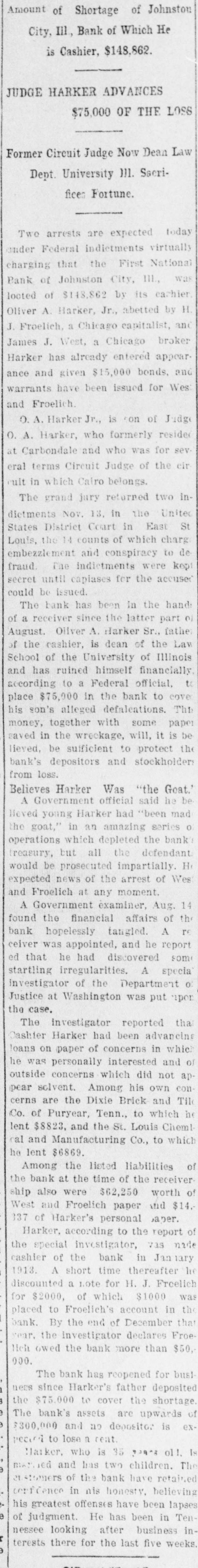 NATIONAL BANKS AND CAUSES OF THEIR FAILURE DOCUMENT ISSUED BY COMP. TROLLER OF CURRENCY SHOWS THIRTEEN INSTITUTIONS, BESIDES FIRST NATIONAL OF PENSACOLA, WENT TO WALL. The annual report of the comptroller of the currency to the third session of the sixty-third congress of the United States, issued December 7th. 1914, as document No. 1467, volume two, contains some interesting information concerning the failure of the First National and other banks banks during 1914. This report gives the name of the bank failing, the date of the appointment of receiver, which is the first act by the government after the failure of a bank, and also gives the causes for the failure as found by the government investigation. Below is given a list of the national banks that have failed during 1914, the date of appointment of receiver. and the cause assigned by the comptroller of the currency for the failure. Marion National Bank, Marion, Kansas, January, closed by run. First National Bank, Superior, Neb., January, fraudulent management. Barnesville National Bank, Barnesville, Minn., January, fraudulent management. First National Bank, Pensacola, Fla, January, injudicious banking. Americus National Bank, Americus, Ga., February, fraudulent management. First National Bank, Gallatin, Tenn., March, wrecked by assistant cashier. First National Bank, Wyatusing, Pa., March, depreciation of securities. First National Bank, London, Ky., April, wrecked by assistant cashier. First National Bank, Corning, Iowa, June, excessive loans to officers and directors. First National Bank, Johnson City, IIL, August, injudicious banking. First National Bank, Sutton, W. Va., August, defalcation of officers. American National Bank, Pensacola, Fla., September, closed by a run. United States National Bank, Centralia, Washington, September, defalcation of officers. First National Bank, West Elizabeth, Pa., October, injudicious banking. According to this report, the government recognizes thirty-two different causes for failures, some relating to defalcation, some for excessive loans to officers, some to fraudulent management. Others are listed as wrecked by the president, cashier, or some other officer, and some for other causes. It will be noted that in this report they do not charge fraud against either of the banks which failed in Pensacola, the comptroller's report accounting for the failure of the American National Bank, which re-opened shortly after it closed its doors, gives as the cause, "closed by a run," meaning a run of the depositors. In accounting for the failure of the First National Bank, the report attributes as the cause, "Injudiclous Banking," which is a criticism of judgment against the officers of the bank, rather than a suggestion of fraud or intentional wrong doing on their part.