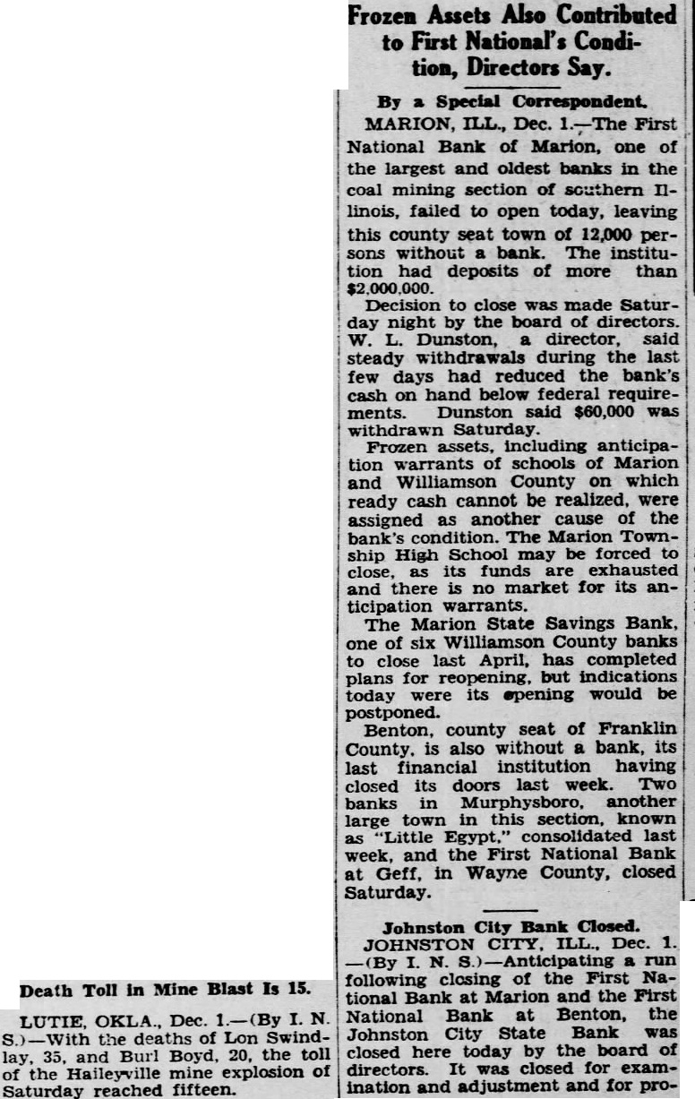 Death Toll in Mine Blast Is 15. LUTIE, OKLA., Dec. 1.-(By I. S. -With the deaths of Lon Swindlay, 35, and Burl Boyd, 20, the toll of the Haileyville mine explosion of Saturday reached fifteen. Frozen Assets Also Contributed to First National's Condition, Directors Say. By a Special Correspondent. MARION, ILL, Dec. The First National Bank of Marion, one of the largest and oldest banks in the coal mining section of southern IIlinois, failed to open today, leaving this county seat town of 12,000 persons without bank. The institution had deposits of more than Decision to close was made Saturday night by the board of directors. W. L. Dunston, a director, said steady withdrawals during the last few days had reduced the bank's cash on hand below federal requirements. Dunston said $60,000 was withdrawn Saturday. Frozen assets, including anticipation warrants of schools of Marion and Williamson County on which ready cash cannot be realized, were assigned as another cause of the bank's condition. The Marion Township High School may be forced to close, as its funds are exhausted and there is no market for its anticipation warrants. The Marion State Savings Bank, one of six Williamson County banks to close last April, has completed plans for reopening, but indications today were its opening would be postponed. Benton, county seat of Franklin County. is also without a bank, its last financial institution having closed its doors last week. Two banks in Murphysboro, another large town in this section, known as "Little Egypt. consolidated last week, and the First National Bank at Geff, in Wayne County, closed Saturday. Johnston City Bank Closed. JOHNSTON CITY, ILL., Dec. 1. (By I. N. -Anticipating a run following closing of the First National Bank at Marion and the First National Bank at Benton, the Johnston City State Bank was closed here today by the board of directors. It was closed for examination and adjustment and for pro-