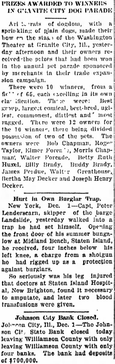 PRIZES AWARDED TO WINNERS IN GRANITE CITY DOG PARADE Ari :- rats of dogdom, with a sprinkling of plain dogs, made their bow on the stat of the Washington Theater at Granite City, III., yesterday afternoon and their owners recolved the prizes that had boen won in the unnual pet parade sponsored by rehants in their trade expansion campaign. There were 10 winners, from a group, largest comical, best-bred. ugllest. commonest, dirtiest and most ragged. There were 12 owners for the 10 winner", there being divided possession of two of the pets. The owners were Bob Chapman, Rog"" Taylor, Elmer Forea Morris Chapman, Walter Forcade, Betty Ruth Huxel. Billy Brady, Buddy Brady, James Perdue, Walt'r Greathouse, Bertha May Decker and Joseph Henry Decker. Hurt in Own Burglar Trap. New York, Dec. 1-Capt. Peter Lenderscarn, skipper of the barge Landslide, yesterday walked into a trap he had set himself. Opening the front door of his summer bungalow at Midland Bench, Staten Island, he received, four Inches below his left knee, a charge from a shotgun he had rigged up as a protection against burglars. So seriously WAR his leg injured that doctors at Staten Island Hospital, New Brighton, found It Decessary to amputate, and later two blood transfusions were given. Johnson City Bank Closed. Johnson City, III., Dec. 1-Tho Johnson CIt, State Bank closed today leaving Williamson County with only leaving Williamson County with only four banks. The bank had deposits of $700,000.