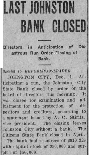 BANK CLOSED Directors in Anticipation of Disastrous Run Order Closing of Bank. Special to JOHNSTON CITY, ticipating run, the Johnston City State Bank closed by order of the board of directors this morning. It closed for examination and ad justment for the protection of deand creditors, according to positors statement issued by Stiritz, vice president. The closing leaves Johnston City without bank. The Citizens State Bank closed in April. The bank had resources of with capitol stock of and surplus of