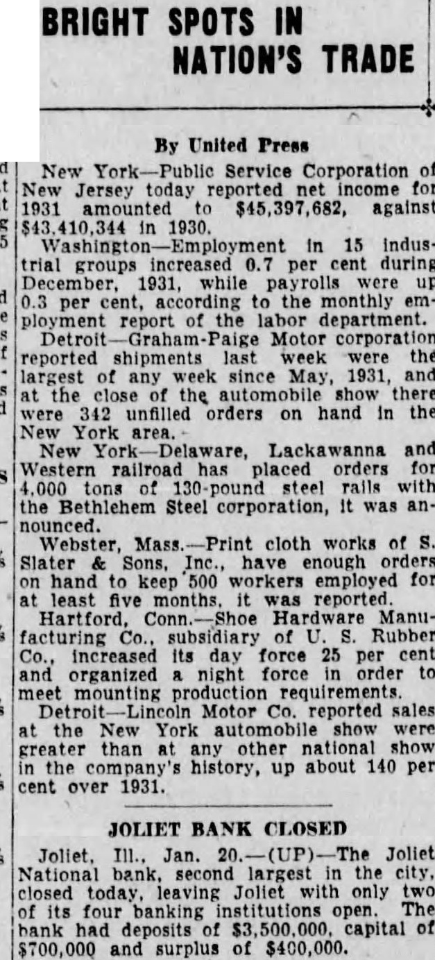 BRIGHT SPOTS IN NATION'S TRADE By United Press Service Corporation of Jersey income for 1931 against trial groups increased per cent 1931 0.3 the labor department. Detroit Motor the any week and there were orders on York New Lackawanna and placed orders .000 rails with the Bethlehem Steel nounced. Webster, works of Slater hand Sons, employed for five reported. Manufacturing Co., Rubber increased day force organized night force mounting reported sales the New than any national show history, up about 140 per cent JOLIET BANK CLOSED Jan. Joliet National largest only the city, banking bank had deposits capital of $700,000 surplus of $400,000.
