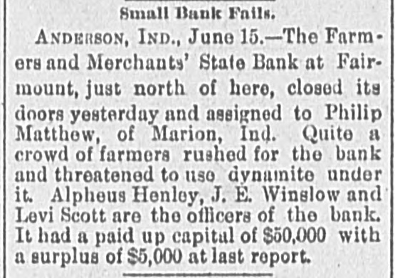 MONEY TROUBLES. Measure of Relief Proposed by the New York Clearing House. NEW YORK, June 15.-In view of the serious drain upon the banks here, caused by demands from the interior, the clearing house committee proposes that every clearing house center in the country issue clearing house certificates, which would make available for use between banks a vast amount of perfectly good assets which are now uncurrent. In the opinion of sagacious and conservative bank officers of this city, this would be a long step toward a reetoration of confidence. Receiver Appointed, SEATTLE, Wash., June 15.-The Ranier electric railway and power company and the Seattle consolidated street railof way a receiver company through have gone failure into to the dispose hands of bonds. D. T. Denny, the principal owner, to protect all his creditore has given trust deeds, and deeds and mortgages on all his property. His assets are much larger than his liabilities. Big One In Arkansas City. ARK ANSAS CITY, Kan., June 15.-The First national bank, of this city, one of the oldest and generally believed to be one of the strongest financial institutions in the southweet, failed to open its doors this morning. The deposits are reported to be $600,000. Threaten to Use Dynamite. ANDERSON, Ind., June 15.-The Farmers & Merchants' state bank at Fairmount, Grant county, is closed. Quite a number of farmers threaten to use dynamite and blow up the bank. It had a paid up capital of $50,000. Flood's Case With the Jury. SAN FRANCISCO, June 15.-The trial of J. W. Flood, charged with embezzlement of $164,000 from the Donabue-Kelly banking company, closed today and the jury retired. Temporary Help. NEW YORK, June 15.-The Clearing association has decided to issue six per cent loan certificates to tide those banks which need help over the present financial trouble. Dismond Dealers Assign. NEW YORK, June 5.-C. Cotier & Son, diamond dealers, assigned today. Their liabilities exceed $100,000, and their assets are equal in amount. Couldn't Stand the Pressure. WESTON, O., June 15.-The Exchange banking company of this place has closed its doors, owing to a run. One in Illinois. Sr. Louis, Mo., June 15.-S. Boneham, a banker of Fairfield, Ills., has failed.