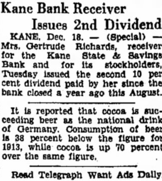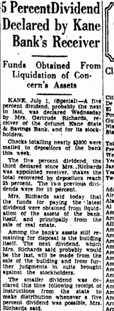 KANE. July 1, (Special)-A five percent dividend. probably the next to last. was declared Wednesday Ford by Mrs. Gertrude Richards, receiver of the defunct Kane State & Savings Bank, and for its stockholders. Checks totalling nearly $3800 were mailed depositors of the bank this week. The five percent dividend the Year third declared since Mrs. Richards was appointed receiver, makes the total recovered by depositors reach 25 percent. The previous dividends were for 10 percent. Mrs. Richards said today that the funds for paying the latest dividend were obtained from liquidation of the assets bank. Am Am Itself, and principally from the sale of real estate. Am Among the bank's assets still remaining for disposal is the building Am itself. The next dividend. which Am Mrs. Richards said probably would Am be the last, will be made from the sale of the building and from furAm ther judgments suits brought Am against the stockholders. The smaller dividend was deAm clared this time following receipt of Am instructions from the state to make distribution whenever five percent dividend was possible, Mrs. Richards said.