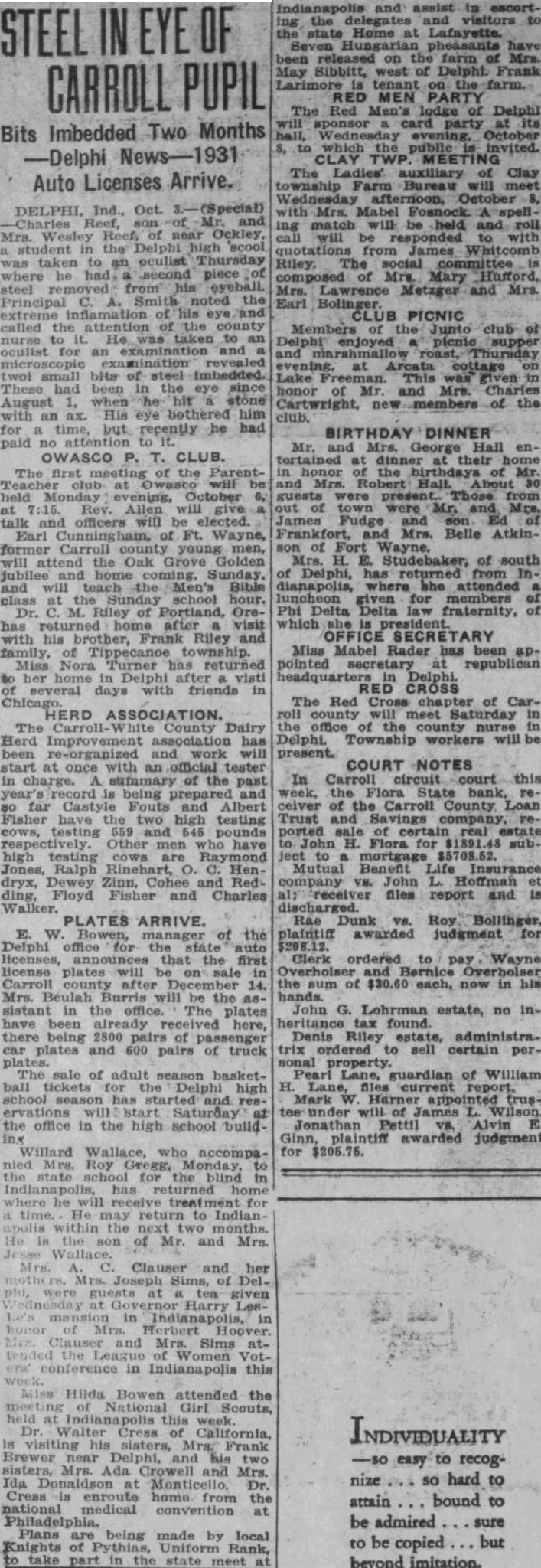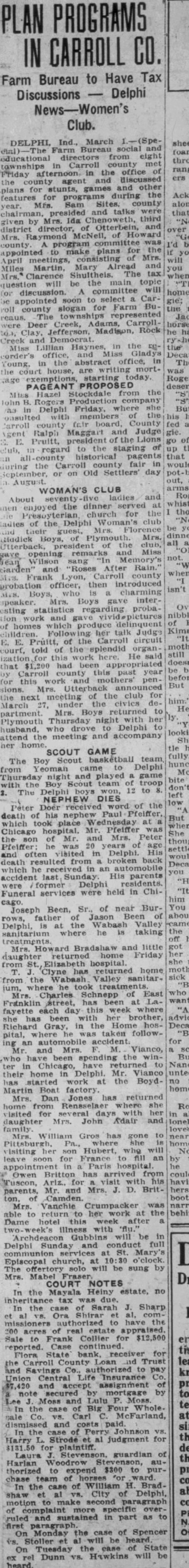 PLAN PROGRAMS IN CARROLL CO. Farm Bureau to Have Tax Discussions Delphi Club. Ind., March Bureau social and Farm directors from eight in Carroll county met Friday afternoon in the discussed office and the games and other plans for stunts, features for programs during the Mrs. Sam county year. and talks were presided Chenoweth, third by Mrs. Ida district director, of Otterbein, and Mrs. Raymond McNell, of was county program plans for the appointed to make consisting of Mrs. April meetings, Mary Alread and Miles Martin, The tax Clarence be the main topic question will committee will discussion. to select Carappointed soon for Farm Buroll county slogan represented reaus. Adams, Carrollwere Deer Creek, Jefferson, Madison, Rock Creek Democrat. Lillian Haynes, in the Miss and Gladys corder's Young, in the abstract office, the house, are starting PAGEANT PROPOSED Hazel Stockdale from the John B. Rogers company Delphi where in members the onsulted board, County Carroll county Maggart and Judge Ralph president of Lions Pruitt, to the staging of regard historical pagents the Carroll county fair during September, or on Old Settlers' day WOMAN'S CLUB ladies and About seventy enjoyed the dinner church for the Delphi club of Mrs. Florence guest, Plymouth. Mrs. Boys, Utterback, of the remarks and Miss opening Wilson sang Memory's Garden" "Roses After Rain. Frank county Mrs. Lyon, probation officer, then introduced charming speaker Boys interesting statistics regarding proba tion work and gave which produce delinquent of homes children. her talk Judge E. E. Pruitt, of the Carroll circuit court, told of the splendid organ this here. He that $1,200 had been appropriated Carroll county this past year this work and mothers' penfor Mrs. Utterback announced sions. next meeting of the club for under the civics deMarch 27, Mrs. Boys returned to partment. Plymouth night with her husband, who drove Delphi to attend the meeting and accompany her home tle SCOUT GAME fully. Boy Scout basketball team, The hunch from Yeoman came to Delphi Thursday night and played game bite Scout team of troop don't The Delphi won, 12 to left NEPHEW DIES low word of the Peter Doer received his nephew Paul death of But which took place Wednesday at when hospital. Mr. Pfeiffer was Chicago She of Mr. and Mrs. Peter was 20 of age Pfeiffer: settled and often visited in Delphi. His death resulted from broken back which he in an automobile you accident last Sunday. His parents were former Delphi Funeral services were held in ChiJoseph Been, Sr., of near Bur- You Jason Been about rows, father Delphi, at the Wabash Valley sanitarium where taking off Bradshaw and little Mrs. Howard daughter returned home Friday from Elizabeth returned home mother. Clyne has from the Wabash Valley sanitarjum, where he took Mrs. Charles Schnepp of East has at La- wanted Franklin street, been fayette each day this where "All she has been her brother, Richard Gray, in the Home hospital, taken followan automobile accident for and Mrs. Vianco, have been spending the win- But Chicago, returned to in their home in Delphi. Mr. Vianco started work the Boyd- no Martin Boat factory. home Mrs. Dan Jones has returned home from Rensselaer where she visited for several days in all daughter Mrs. John Adair and family loved William Gros has gone she visiting Hubert, will for France fill an appointment Paris Owen Britton has arrived from Tuscon, Ariz., his having parents, Mr. and Mrs. D. Brit- hers. boot Mrs. Vanchie Crumpacker was able to return her work at the Dame hotel this week after illness with Archdeacon Gubbins will be in Delphi Sunday and conduct full communion St. Mary's Episcopal church, o'clock. The will be sung by Mrs. Mabel COURT NOTES In the Mayala Heiny estate, no inheritance was due. In the of Sarah Sharp Ora Shirar authorized have the 200 acres of real estate appraised. Sale to Frank Collier for $12,500 reported. Case continued Flora State bank. receiver for Carroll County Loan Trust and Savings Co., authorized Central Insurance and accept assignment note secured mortgage by Moss and Lulu In the case Big Four Whole. sale Co. Carl McFarland, dismissed and costs paid. the Johnson Harry Strode judgment for $131.50 Laura Stevenson, guardian of Harlan Woodrow authorized to expend $300 to purchase team of In the case of William H. Bradshaw vs. City of Delphi, motion to second paragraph of complaint more overruled and sustained in part as to first paragraph. On Monday the case of Spencer is. Stoller be heard Tuesday the case of State On ex rel Dunn vs. Hawkins will be