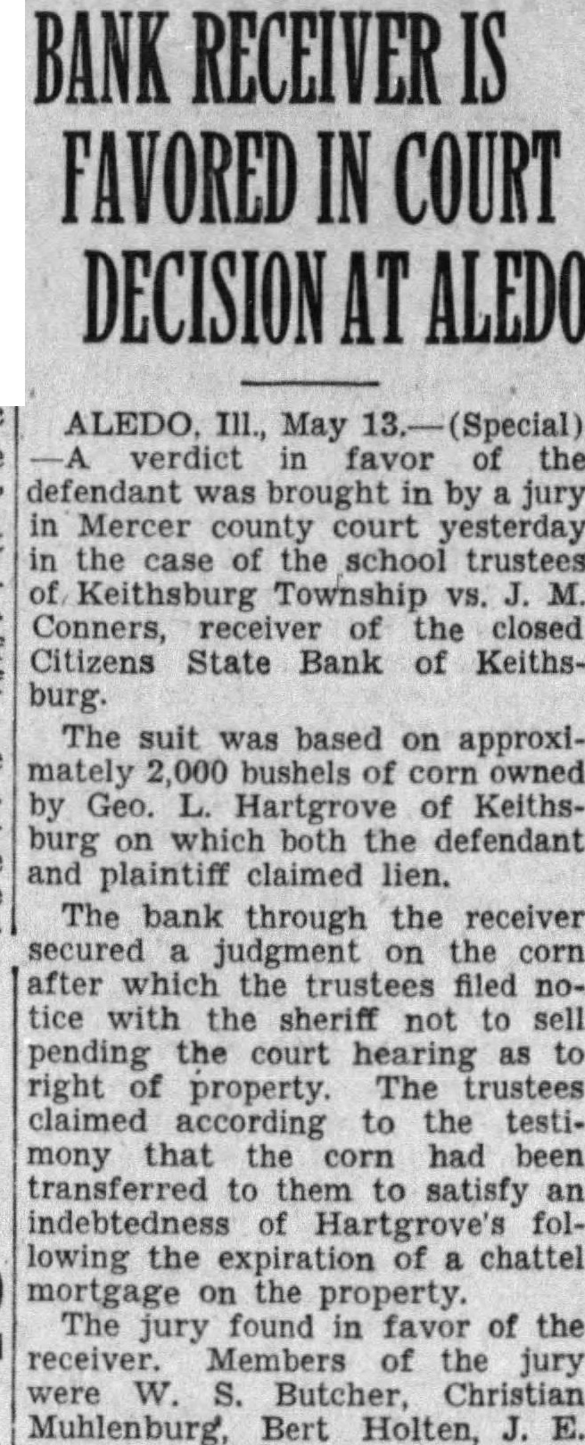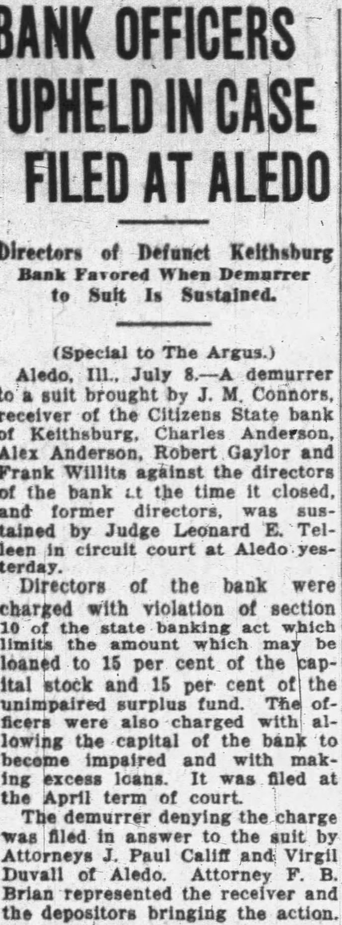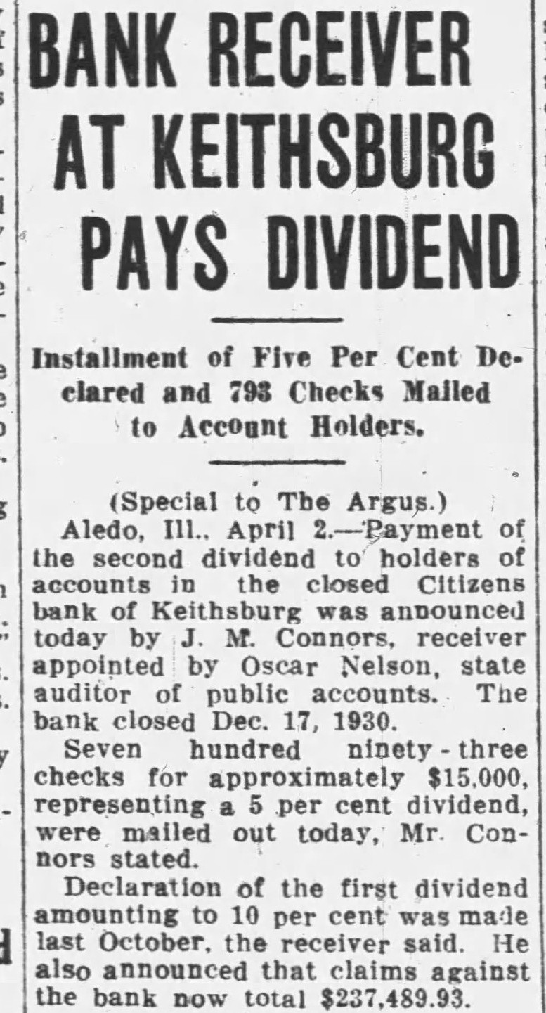 BANK RECEIVER KEITHSBURG PAYS DIVIDEND Installment of Five Per Cent clared and 793 Checks Mailed Account Holders. (Special The Aledo, April the second dividend holders accounts the closed Citizens bank of Keithsburg announced today Connors, receiver appointed by Oscar Nelson, state auditor public accounts. The bank closed Dec. 17, 1930. Seven hundred ninety checks approximately representing cent dividend, mailed out today, Constated. Declaration of the first dividend amounting last October. the receiver said. He announced that against the bank now total