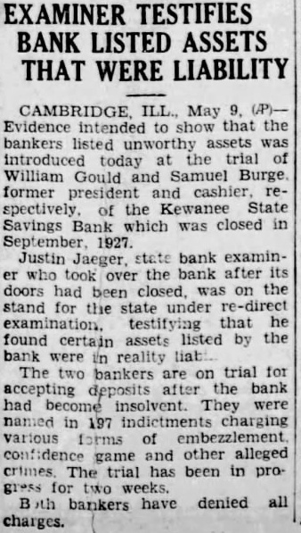 EXAMINER TESTIFIES BANK LISTED ASSETS THAT WERE LIABILITY Evidence intended to show that the bankers listed unworthy assets was introduced today at the trial of William Gould and Samuel Burge former president and cashier respectively of the Kewanee State Savings Bank which was closed in 1927. Justin Jaeger, state bank examiner who took over the bank after its doors had been closed. was on the stand for the state under re-direct examination. testifying that he found certain assets listed by the bank were in reality liabi The two bankers are on trial for accepting deposits after the bank had become insolvent. They were named in 197 indictments charging various forms of embezzlement. confidence game and other alleged crimes The trial has been in progress for two weeks. B th bankers have denied all charges.