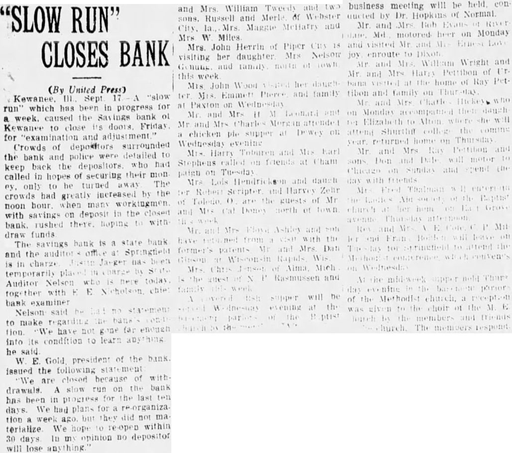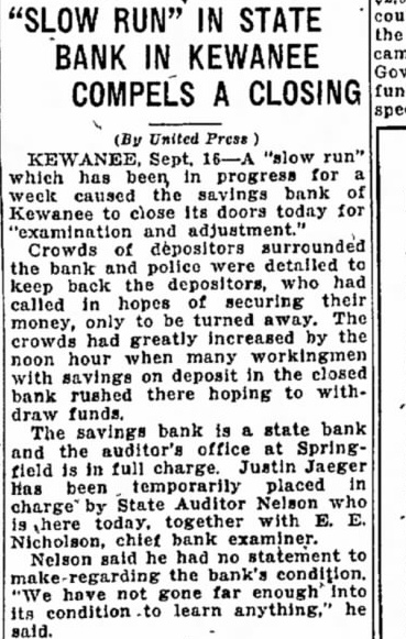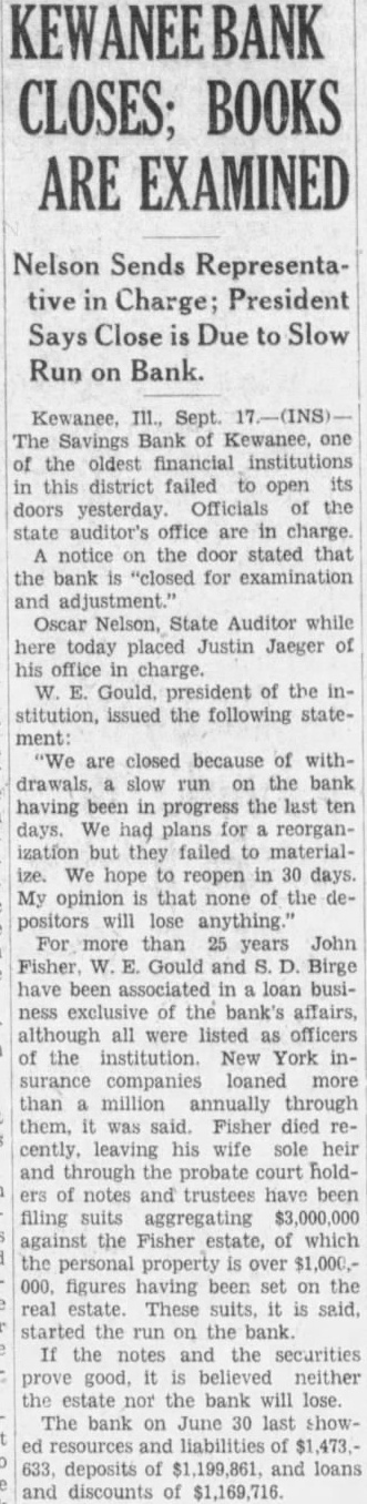 Kewanee, III., Sept. 17.-(INS)The Savings Bank of Kewanee, one of the oldest financial institutions in this district failed to open its doors yesterday. Officials of the state auditor's office are in charge. A notice on the door stated that the bank is "closed for examination and adjustment." Oscar Nelson, State Auditor while here today placed Justin Jaeger of his office in charge. W. E. Gould, president of the institution, issued the following statement: "We are closed because of withdrawals. a slow run on the bank having been in progress the last ten days. We had plans for a reorganization but they failed to materialize. We hope to reopen in 30 days. My opinion is that none of the depositors will lose anything. For more than 25 years John Fisher W. E. Gould and S. D. Birge have been associated in loan business exclusive of the bank's affairs, although all were listed as officers of the institution. New York insurance companies loaned more than a million annually through them, it was said. Fisher died recently, leaving his wife sole heir and through the probate court holders of notes and trustees have been filing suits aggregating $3,000,000 against the Fisher estate, of which the personal property is over $1,000.000, figures having been set on the real estate. These suits, it is said, started the run on the bank. If the notes and the securities prove good, it is believed neither the estate nor the bank will lose. The bank on June 30 last showed resources and liabilities of $1,473.633, deposits of $1,199,861. and loans and discounts of $1,169,716.