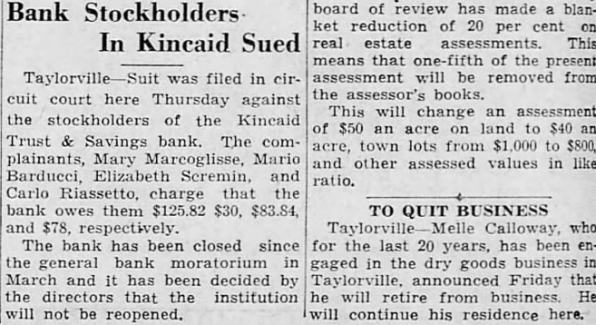 Bank In Kincaid Sued filed in assessment will be removed from the assessor's books. cuit court here Thursday against This will change an assessment the stockholders of the Kincaid of $50 an land to Trust & Savings bank. The comacre, town lots from to $800, plainants, Mary Marcoglisse, Mario and other assessed values in like Bardueci, Elizabeth Scremin, and ratio. Carlo Riassetto, charge that the bank them $125.82 $30, $83.84, TO BUSINESS and $78. respectively. Calloway, who The bank has been closed since for the last 20 years, has been the general bank moratorium gaged in the dry goods business March and it has been decided by Taylorville announced Friday that the directors that the institution will retire from business. He not be reopened. continue his residence here.