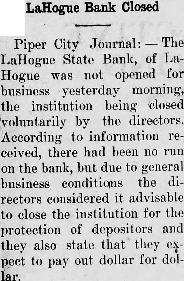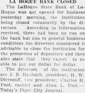 Perhaps the most unusal development of the April 12 primaries in the twenty-sixth senatorial district, is that for the first time since the formation of the district with its present boundaries, the minority or Democratic representative will come from Ford County. The first election in the present district was held in 1902. Since then, each Democratic representative has been a McLean county resident. Several Republicans have been elected from Ford, but Joseph W. Russell, Democratic nominee, will break the party record. His nomination on the minority ticket is tantamount to election, and he will go to the legislature in January with the unusual distinction of having been first in a field of five candidates in the primary and carrying his party banner to Springfield for the first time from his county. There are several other things about Mr. Russell which are different. For one thing, he a "dirt" farmer; he and his two brothers, Francis and Richard, carry on the actual operations of a 640 acre farm or which they were born, on which their father was born, and their grandfather its first owner. The Russell farm is the largest in Lyman township, southeast of Roberts. It was wild, unbroken prairie when the grandfather of the present managers selected it for his home in the early 1800's. The farm was purchased by the grandfather, Patrick Russell, from the Illinois Central railroad. For years it was operated as a grain farm, growing principally corn and oats as was the former general practice in Ford county. Of recent years, the ssell brothers have turned more to livestock production, keeping Shorthorn and Hereford cows and raising 30 head of calves a year, selling them at about 650 pounds. The corn, oats, and clover rotation has been adopted, clover growing on all fields every third or fourth year. Limestone has been spread to sweeten the soil and give a better chance, a practice generally recommended by the University of Illinois college of agriculture, from which Mr. Russell was graduated in 1923. The standard farm accounting system advocated by the U. of I. agricultural college has been used on the Russell farm four years, results. indicating the wisdom of the more diversified program adopted, especially the feeding of livestock. Being new in the political game, it is interesting to note how Mr. Russell sized up the situation when the primary campaign was closing. "My brothers and I figured," said Mr. Russell, "that if I could get 3,000 votes in Ford county, with what I could corrall in McLean, I could win. The final Ford count gave me nearly 2,800, which, with 1,951 in McLean county, gave me the high vote for the district." Mr. Russell made an active campaign in his own county and also covered much of McLean, not making speeches but doing much handshaking. Asked as to his politcial philosophy, Mr. Russell said he is interested most of all in reducing the costs of government. "Government expenditures must come down nearer the level with the prices of all commodities, especially what the farmers have to sell," he said. "I have no set program to propose at Springfield, but I hope to promote useful legislation. Our family has always been Democratic. as My father served many years road commissioner, and he got close-up of conditions and people in our neighborhood. He died five years ago." Mr. Russell has known his fellow Ford county house member, G. J. Johnson (Rep.), for many years and says that he will work with him, and the McLean county member, Maurice O. Kalahar (Rep.), for the best interests of the distric.-Bloomington Pantagraph. of The LaHogue State Bank LaHogue was not opened for business Wednesday morning, the institution being closed voluntarily by the directors According to information receive d, there had been no run on the bank but due to general business conditions the directors considered it advisable to close the institution for the protection of depositors and they also state that they expect to be able to pay out dollar for dollar The directors of the institution are J. B.Haubach, president; H. W. Diercouff, vice president; Charles H. Pool, cashier; and Alma L. Pool. Piper City Journal.