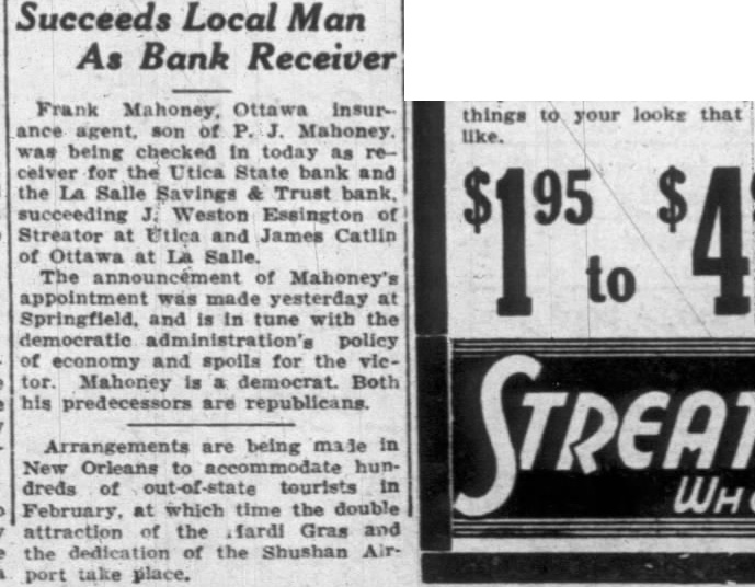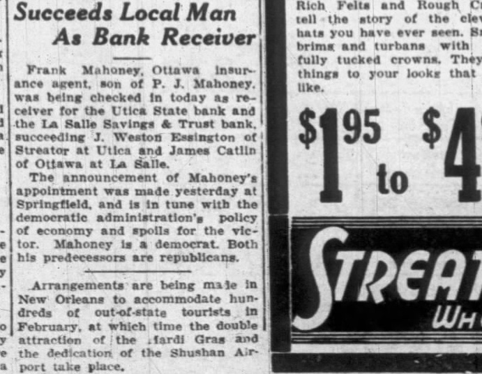 Frank Mahoney, Ottawa insurance agent. son of Mahoney. was being checked in today as receiver for the Utica State bank and the La Salle Savings & Trust bank, succeeding Weston Essington of Streator at Utica and James Catlin of Ottawa at La Salle. The announcement of Mahoney's appointment was made yesterday at Springfield, and is in tune with the democratic administration's policy of economy and spoils for the victor. Mahoney is democrat. Both his predecessors are republicans.