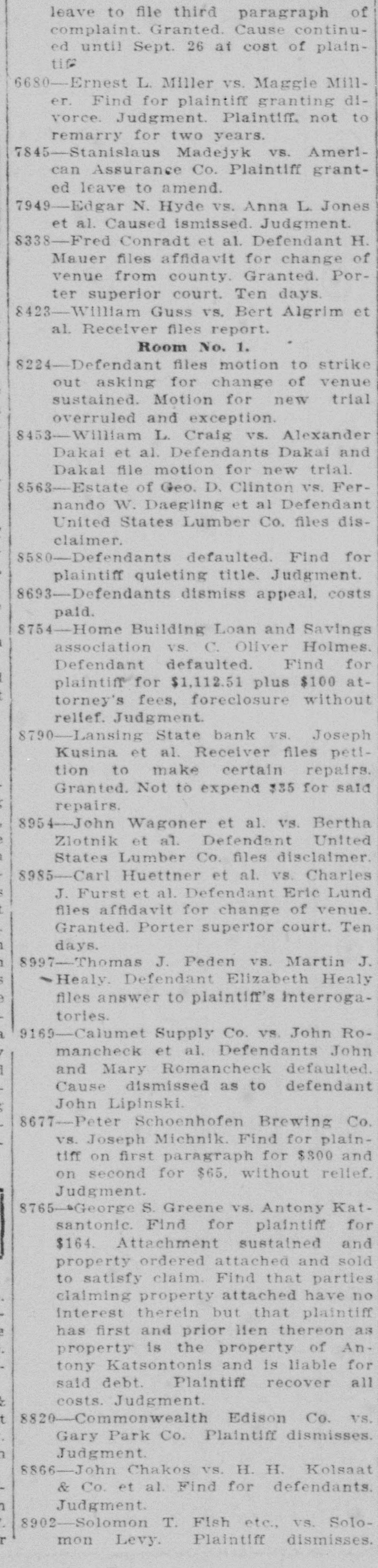 leave to file third paragraph of complaint. Granted. Cause continu- ed until Sept. 26 at cost of plain- tif 6680-Ernest L. Miller vs. Maggie Mill- er. Find for plaintiff granting di- vorce. Judgment. Plaintiff. not to remarry for two years. 7845-Stanislaus Madejyk vs. Ameri- can Assurance Co. Plaintiff grant- ed leave to amend. 7949-Edgar N. Hyde vs. Anna L. Jones et al. Caused ismissed. Judgment. $338-Fred Conradt et al. Defendant H. Mauer files affidavit for change of venue from county. Granted. Por- ter superior court. Ten days. 8423-William Guss vs. Bert Algrim et al. Receiver files report. ### Room No. 1. 8224-Defendant files motion to strike out asking for change of venue sustained. Motion for new trial overruled and exception. 8453-William L. Craig vs. Alexander Dakai et al. Defendants Dakai and Dakai file motion for new trial. 8563-Estate of Geo. D. Clinton vs. Fer- nando W. Daegling et al Defendant United States Lumber Co. files dis- claimer. 8580-Defendants defaulted. Find for plaintiff quieting title. Judgment. 8693-Defendants dismiss appeal, costs paid. 8754-Home Building Loan and Savings association vs. C. Oliver Holmes. Defendant defaulted. Find for plaintiff for $1,112.51 plus $100 at- torney's fees, foreclosure without relief. Judgment. 8790-Lansing State bank vs. Joseph Kusina et al. Receiver files peti- tion to make certain repairs. Granted. Not to expend $35 for said repairs. 8954-John Wagoner et al. vs. Bertha Zlotnik et al. Defendant United States Lumber Co. files disclaimer. 8985-Carl Huettner et al. vs. Charles J. Furst et al. Defendant Eric Lund files affidavit for change of venue. Granted. Porter superior court. Ten days. 8997-Thomas J. Peden vs. Martin J. Healy. Defendant Elizabeth Healy files answer to plaintiff's interroga- tories. 9169-Calumet Supply Co. vs. John Ro- mancheck et al. Defendants John and Mary Romancheck defaulted. Cause dismissed as to defendant John Lipinski. 8677-Peter Schoenhofen Brewing Co. vs. Joseph Michnik. Find for plain- tiff on first paragraph for $300 and on second for $65, without relief. Judgment. 8765-George S. Greene vs. Antony Kat- santonic. Find for plaintiff for $164. Attachment sustained and property ordered attached and sold to satisfy claim. Find that parties claiming property attached have no interest therein but that plaintiff has first and prior lien thereon as property is the property of An- tony Katsontonis and is liable for said debt. Plaintiff recover all costs. Judgment. 8820-Commonwealth Edison Co. vs. Gary Park Co. Plaintiff dismisses. Judgment. 8866-John Chakos vs. H. H. Kolsaat & Co. et al. Find for defendants. Judgment. 8902-Solomon T. Fish etc., vs. Solo- mon Levy. Plaintiff dismisses.