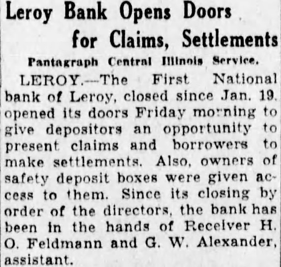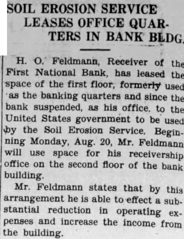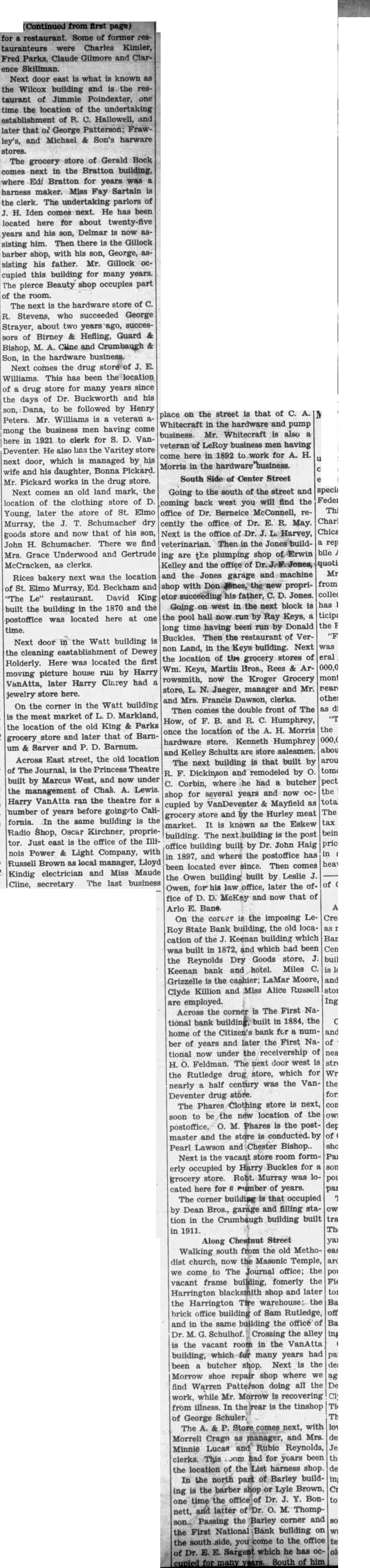Going to the south of the street and coming back west you will find the office of Dr. Berneice McConnell, recently the office of Dr. R. May. Next is the office of veterinarian. the ing are the plumping shop Kelley and the and the Jones shop with proprifather, Jones. in the next block the pool Ray Keys, time been Donald long having Buckles. Then the restaurant of VerLand, in the building. Next the location of the stores of grocery Wm. Keys, Martin Bros., Rees & Arrowsmith, now the Kroger Grocery manager and Mr. store, and Mrs. Francis Dawson, clerks. Then the double front of The comes How, of and R. Humphrey, the location of the Morris once hardware store. Kenneth Humphrey and Kelley Schultz are store salesmen. The next building that built by Dickinson and remodeled by where he had butcher Corbin, for several years and now shop cupied by Mayfield store and by the Hurley meat grocery It is known as the Eskew market. The the post building. built by Dr. John Haig office building 1897, and where the postoffice has been located ever since. Then comes Owen building built by Leslie the Owen, law office, later the of and now that of fice McKay Arlo E. On the corcer the imposing Roy State Bank building, the old locaof the Keenan building which cation and which had been built in 1872, Reynolds Dry Goods store, the hotel. Miles Keenan bank LaMar Moore, Grizzelle is the Miss Alice Russell Clyde Killion and employed. The First NaAcross the corner in 1884, the tional bank home of the Citizen's bank for and later the First Naber of years under the receivership of tional now The next door west Feldman. store, which for the Rutledge drug half was the Vannearly century Deventer drug store. store is next, The Clothing new location of the to the soon Phares is the postand the store conducted. master Pearl Lawson Bishop.. Next the vacant store room formby Harry Buckles for erly occupied store. Robt. Murray was grocery cated here for number of years. The corner building that occupied Dean Bros., garage and filling in the Crumbaugh building built tion 1911.